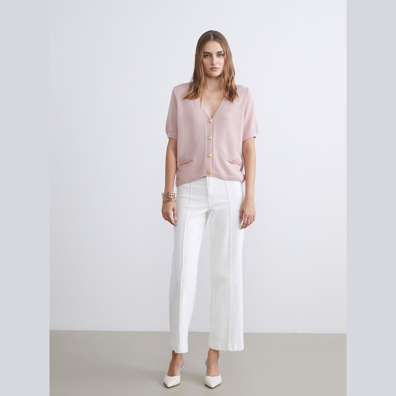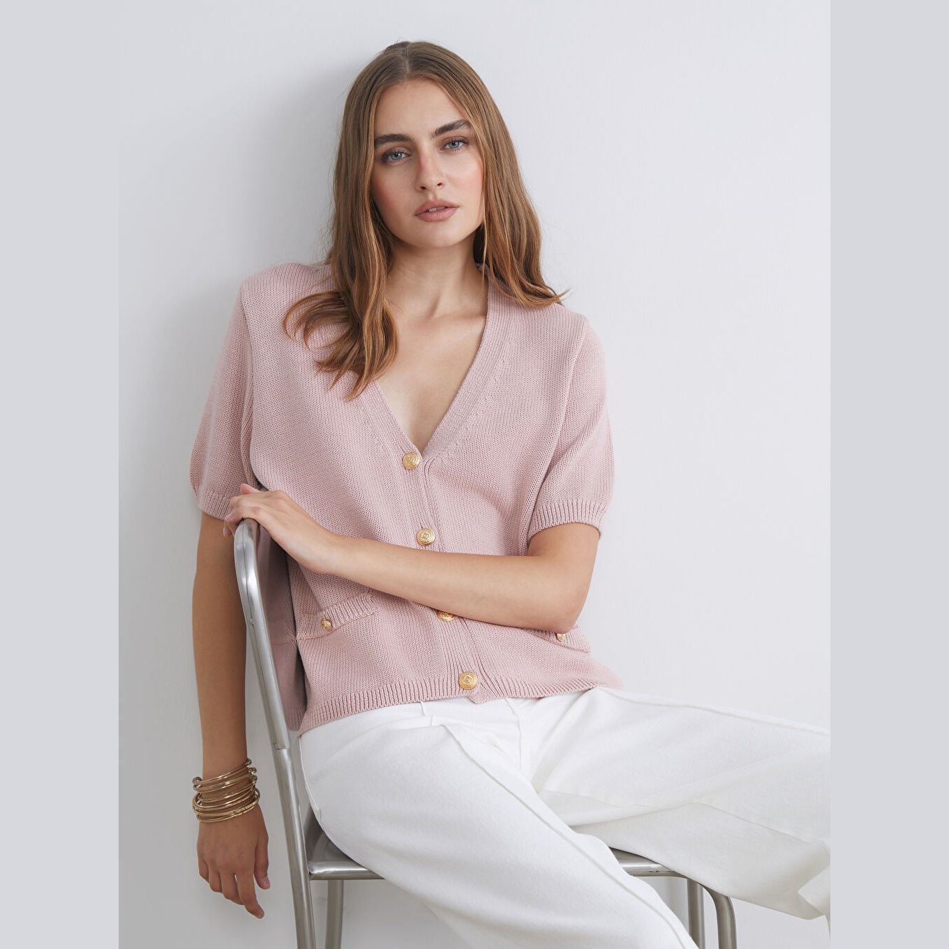 كارديغان أنثوي من مجموعة LCW ECO بلون وردي ناعم، مصمم بياقة V أنيقة، أكمام قصيرة، قصة Standart & Regular تمنحك مظهرًا مريحًا ومتوازنًا، تصميم سادة بدون نقوش، خامة Triko متوسطة السماكة مصنوعة بالكامل من 100% قطن، بزر أمامي للإغلاق، بطول يُقاس من الكتف، مثالي للتنسيق مع بناطيل قماش أو تنانير خفيفة لإطلالة صيفية ناعمة وصديقة للبيئة.