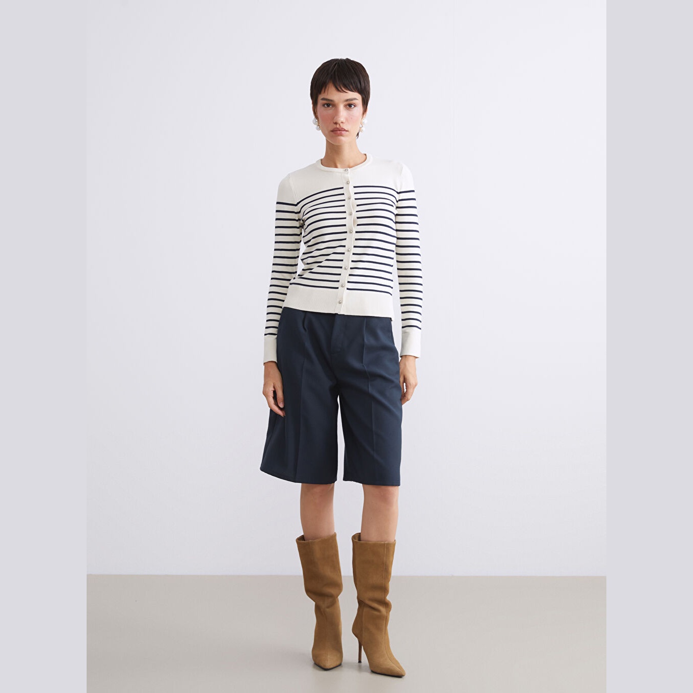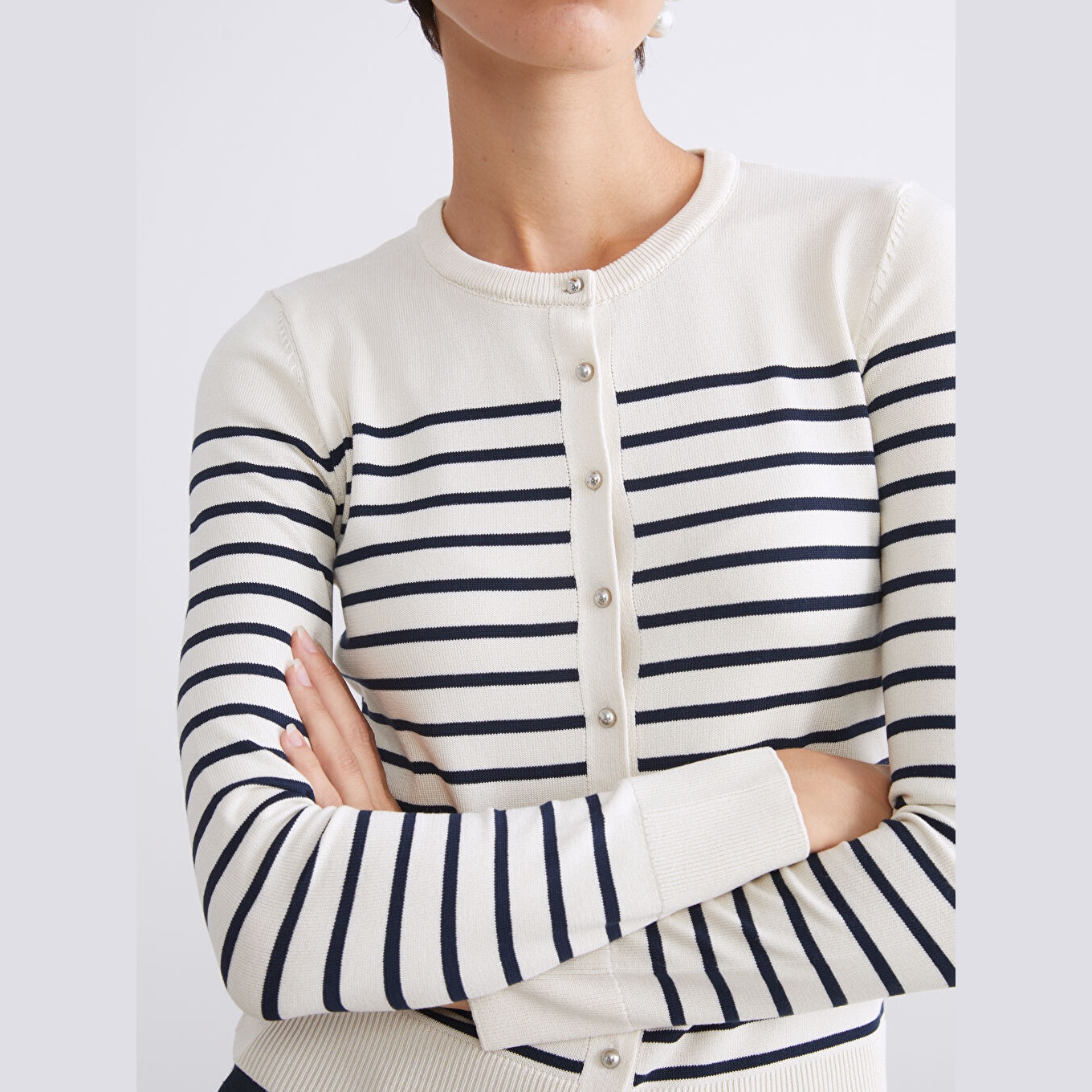 كارديغان نسائي بياقة دائرية من LCW Vision – بيج مخطط (قصة ضيقة، خامة تريكو خفيفة، تصميم مخطط، أكمام طويلة، مزيج فيسكوز وبوليستر)