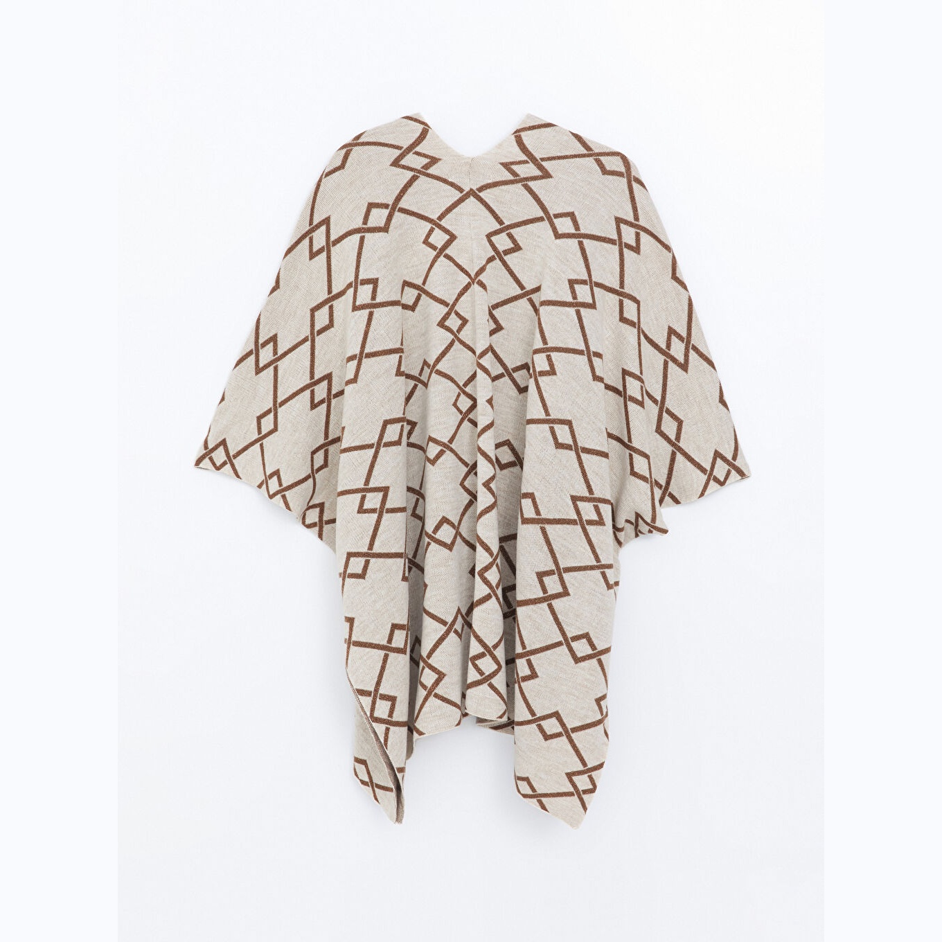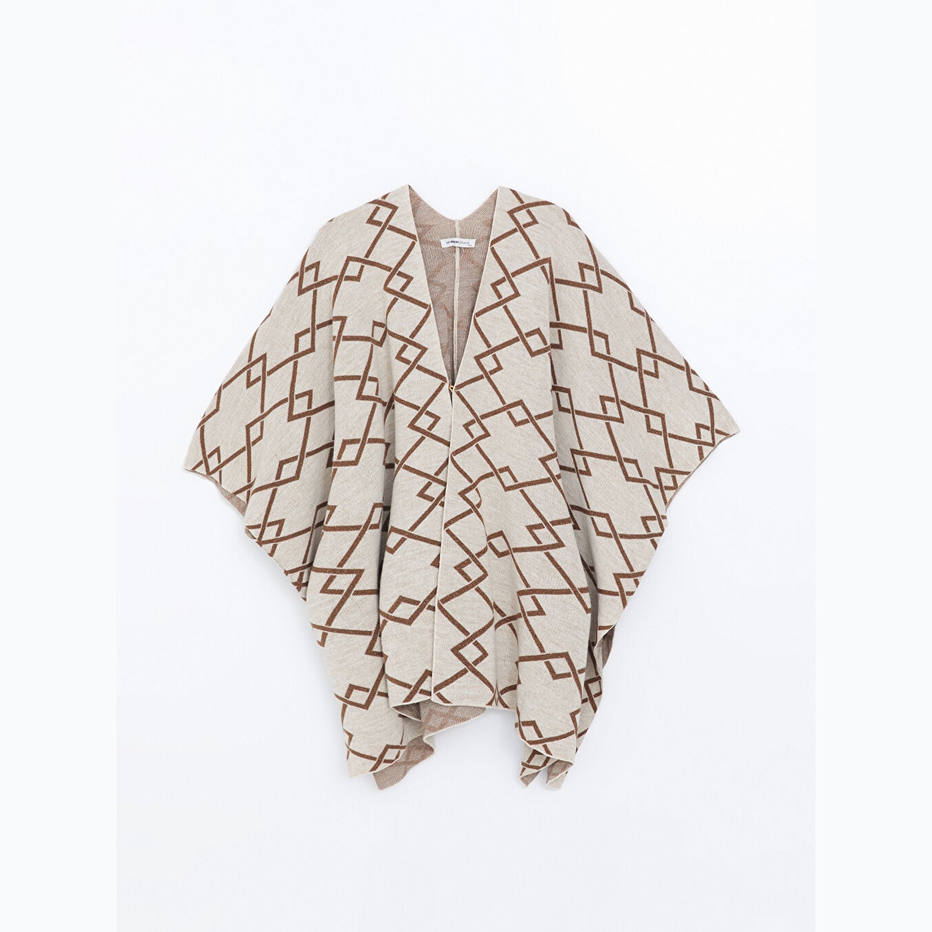 بونشو نسائي بياقة شال من LCW Grace – بيج مزخرف (قصة قياسية، خامة تريكو متوسطة السماكة، تصميم مزخرف، أكمام ثلاثة أرباع، طول ميدي، مزيج أكريليك وبوليستر وخيط معدني)