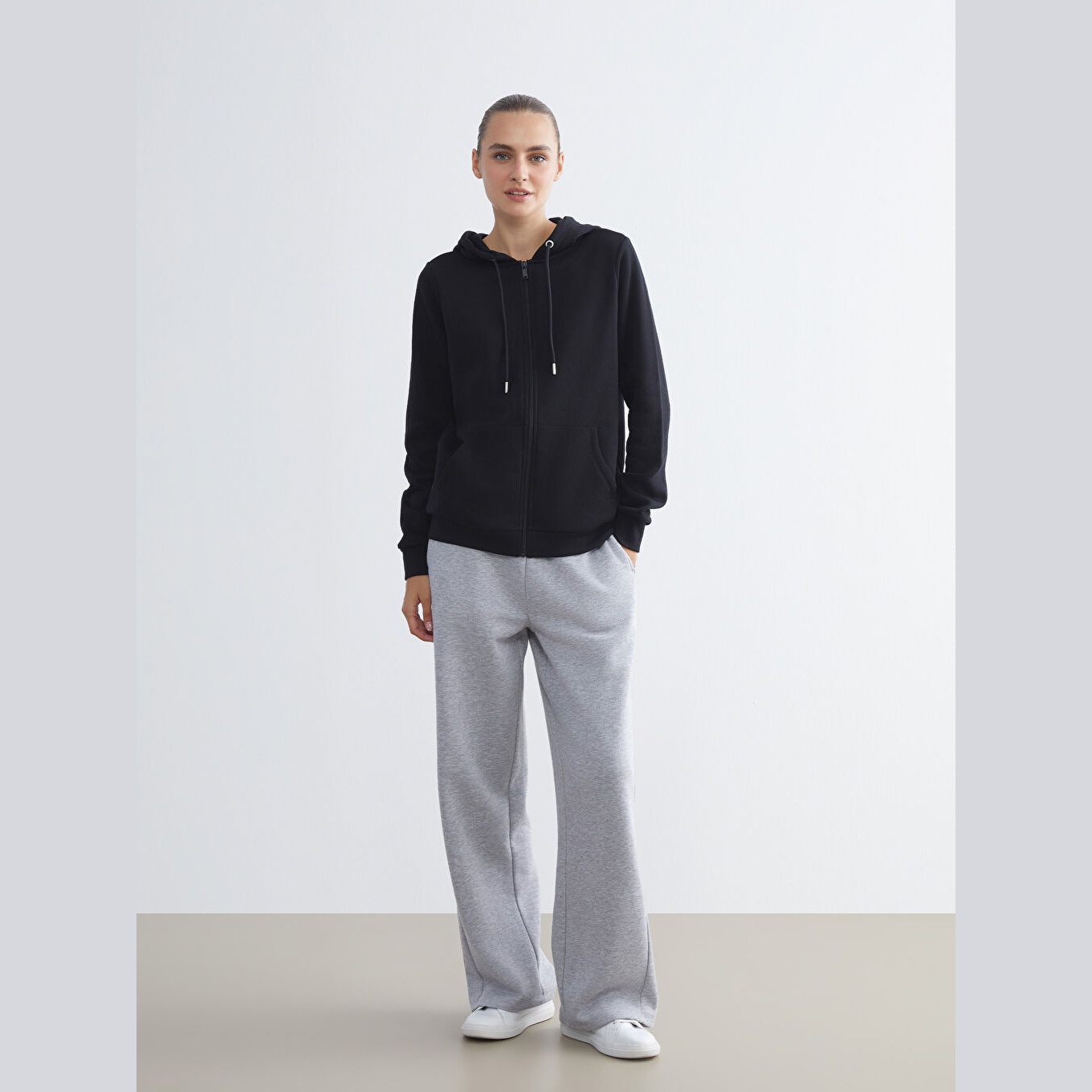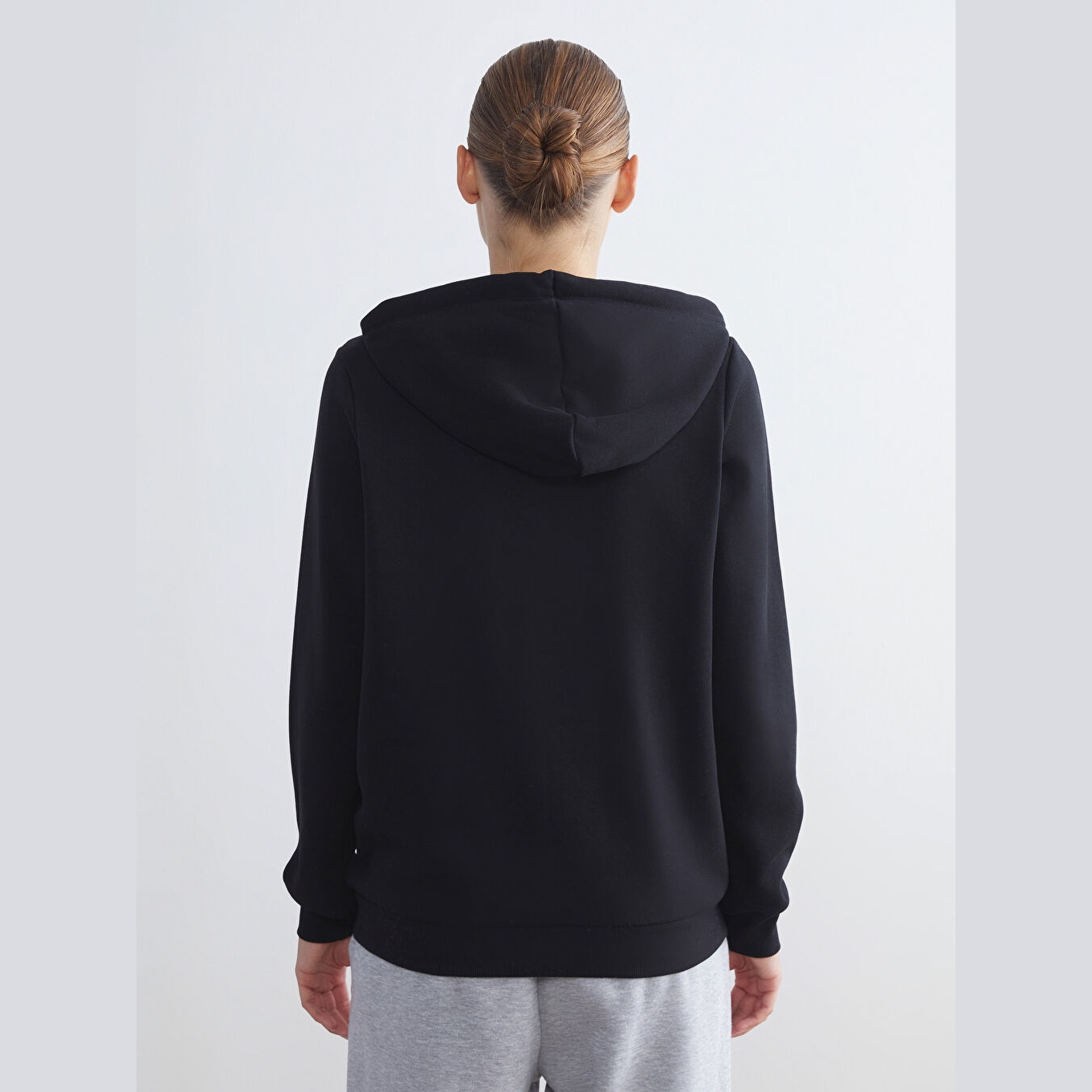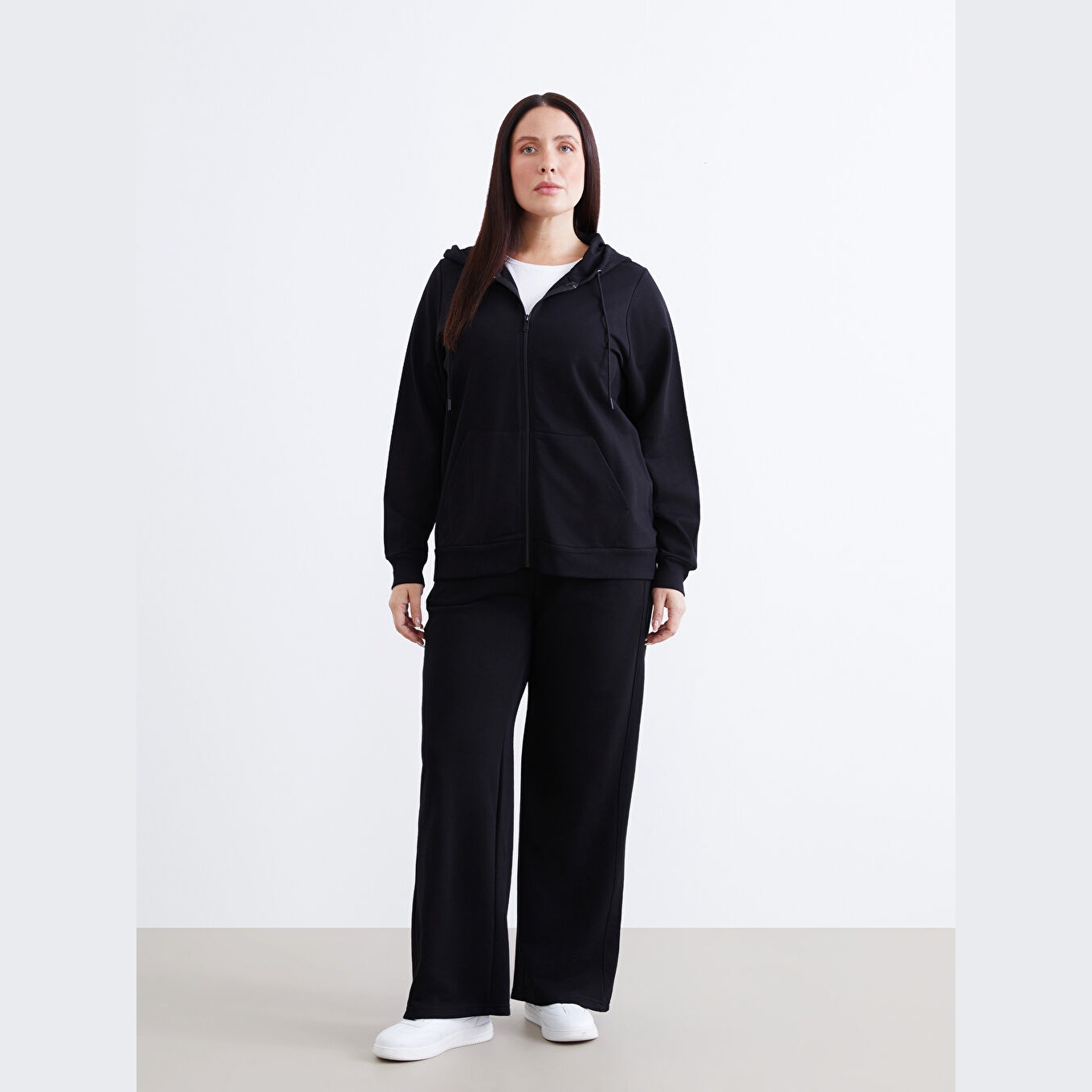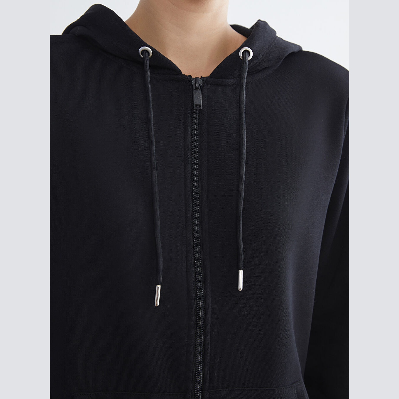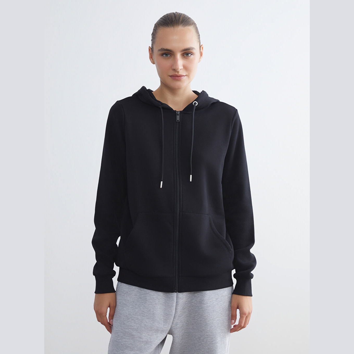 سويت شيرت نسائي بسحاب من LCWAIKIKI Basic – أسود بقبعة (قصة قياسية، خامة قطنية مشمشونة متوسطة السماكة، تصميم سادة، أكمام طويلة، ضمن مجموعة المقاسات الكبيرة)