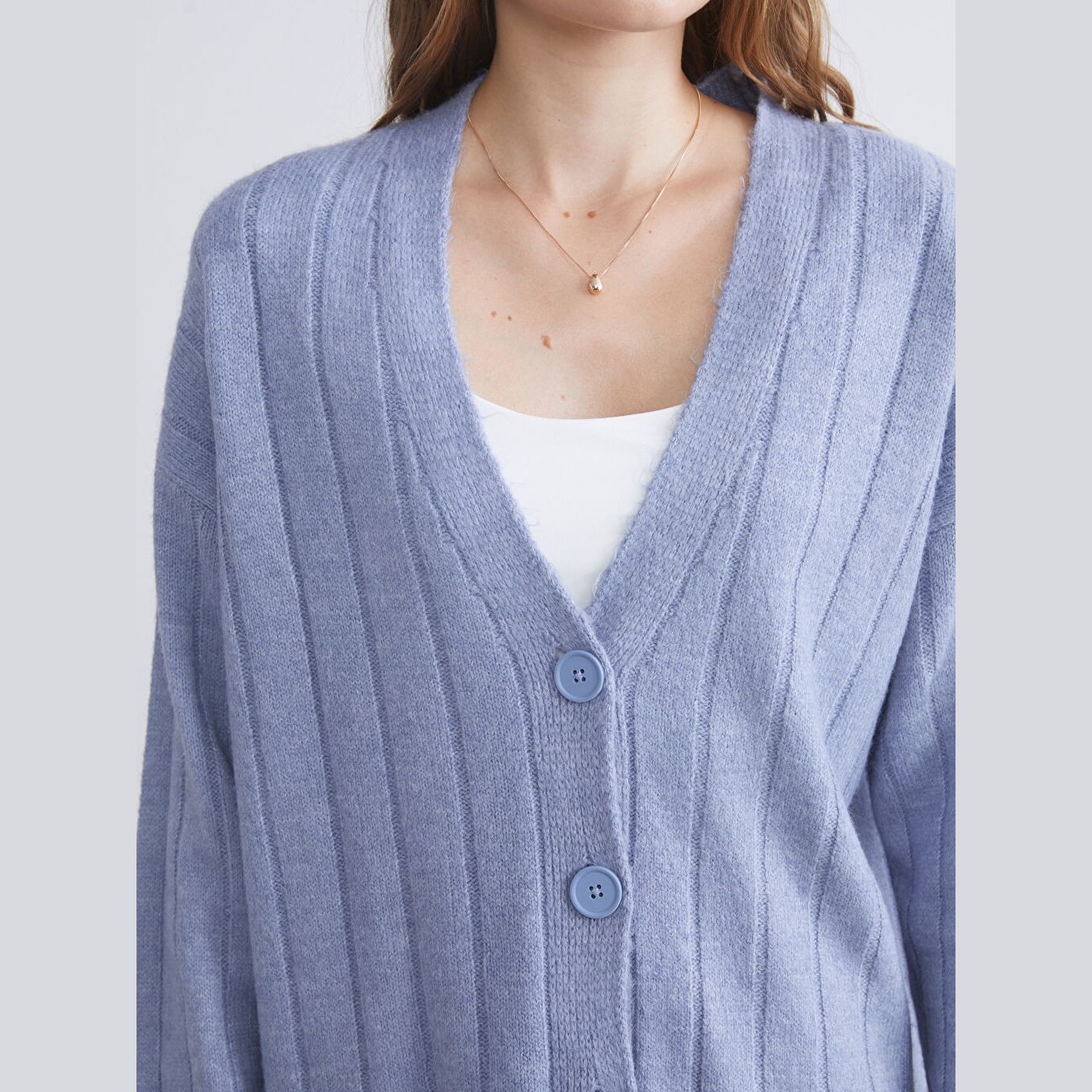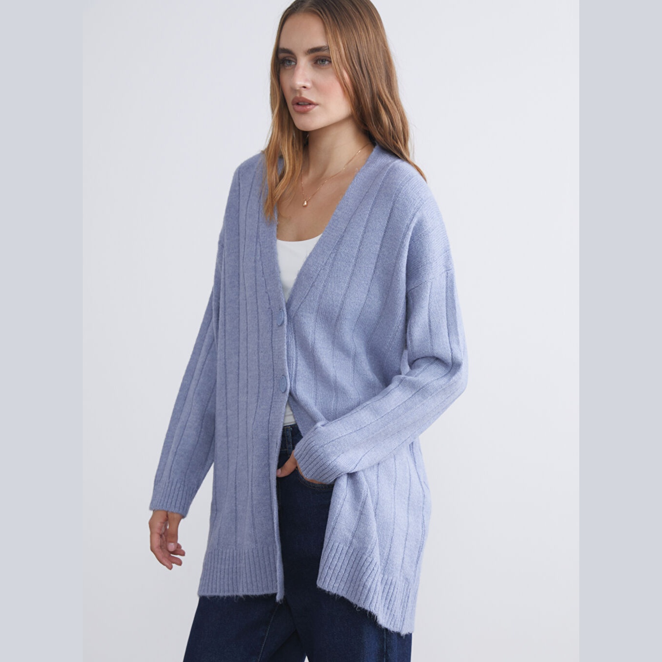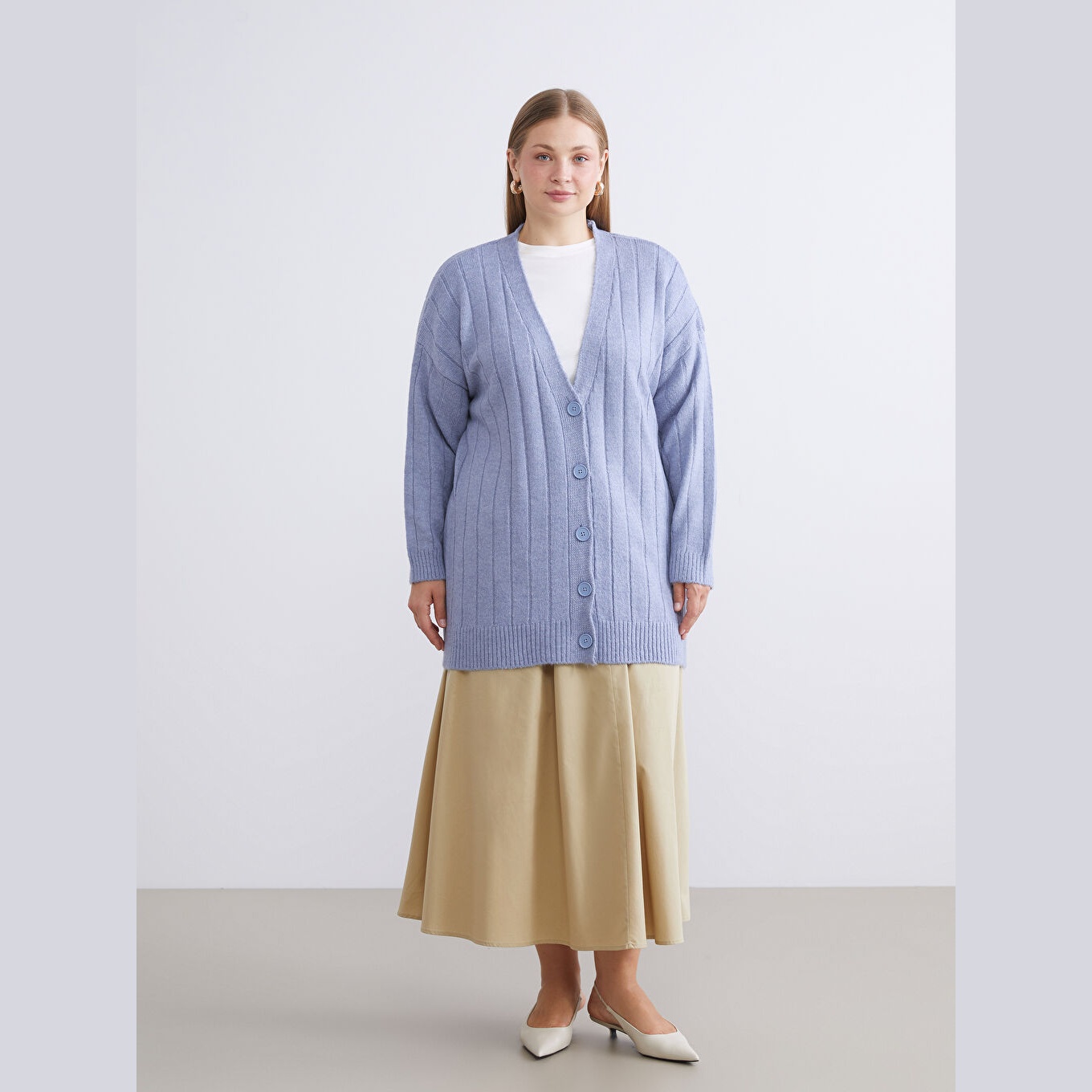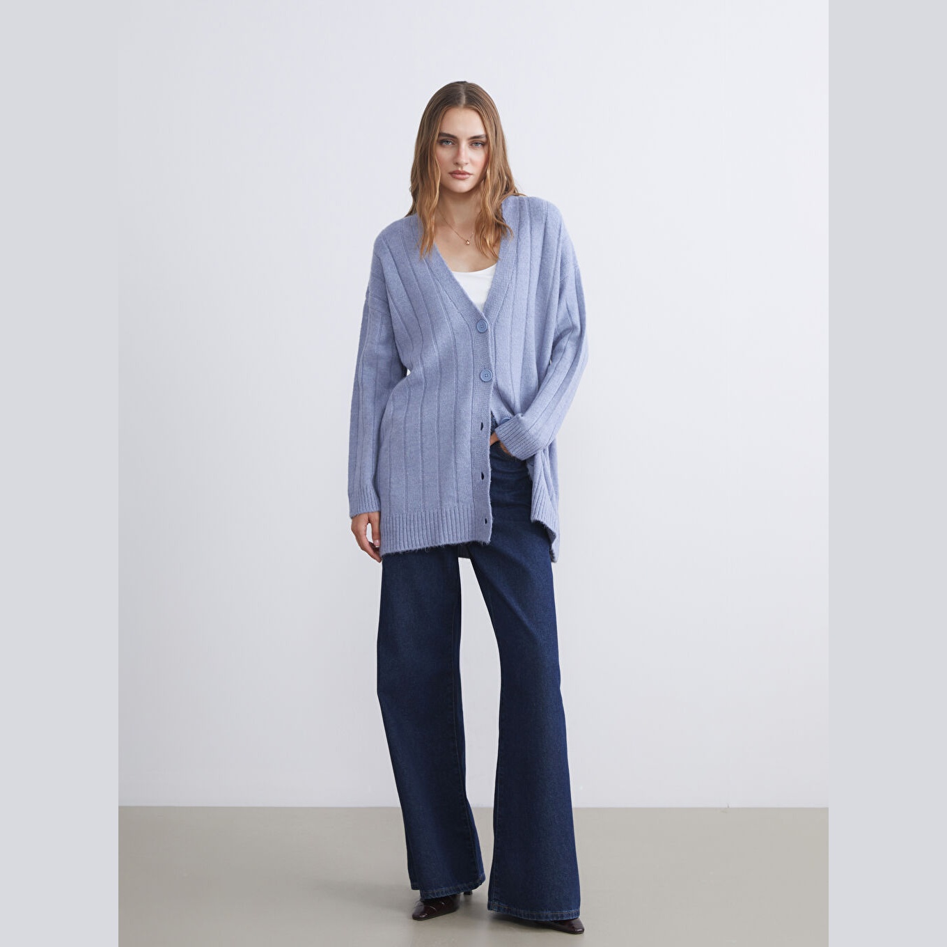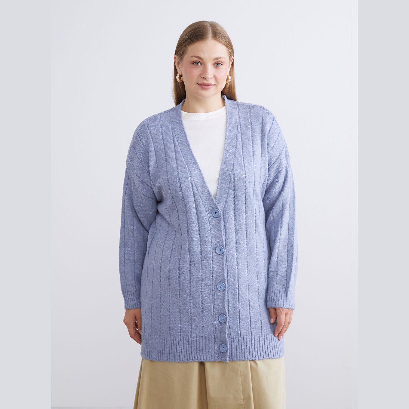 كارديغان أنيق من مجموعة LCWAIKIKI Classic بلون أزرق هادئ، مصمم بياقة V أنثوية، أكمام طويلة، قصة Loose & Bol تمنحك مظهرًا فضفاضًا وانسيابيًا، تصميم سادة بدون نقوش، خامة Triko متوسطة السماكة بتركيبة تحتوي على 80% أكريليك و20% بوليستر، بطول ميدي يُقاس من الكتف، مخصص ضمن مجموعة Büyük Beden لتوفير ملاءمة مثالية للسيدات بمقاسات كبيرة، مثالي للتنسيق مع بناطيل قماش أو تنانير مستقيمة لإطلالة خريفية أو مكتبية أنيقة.