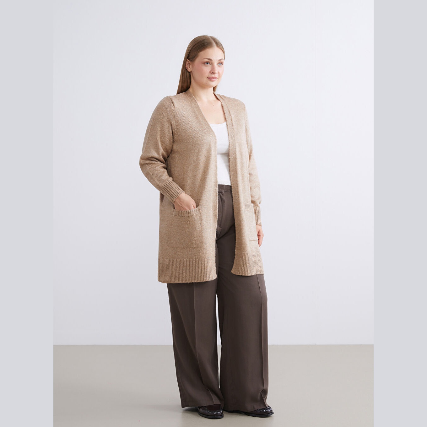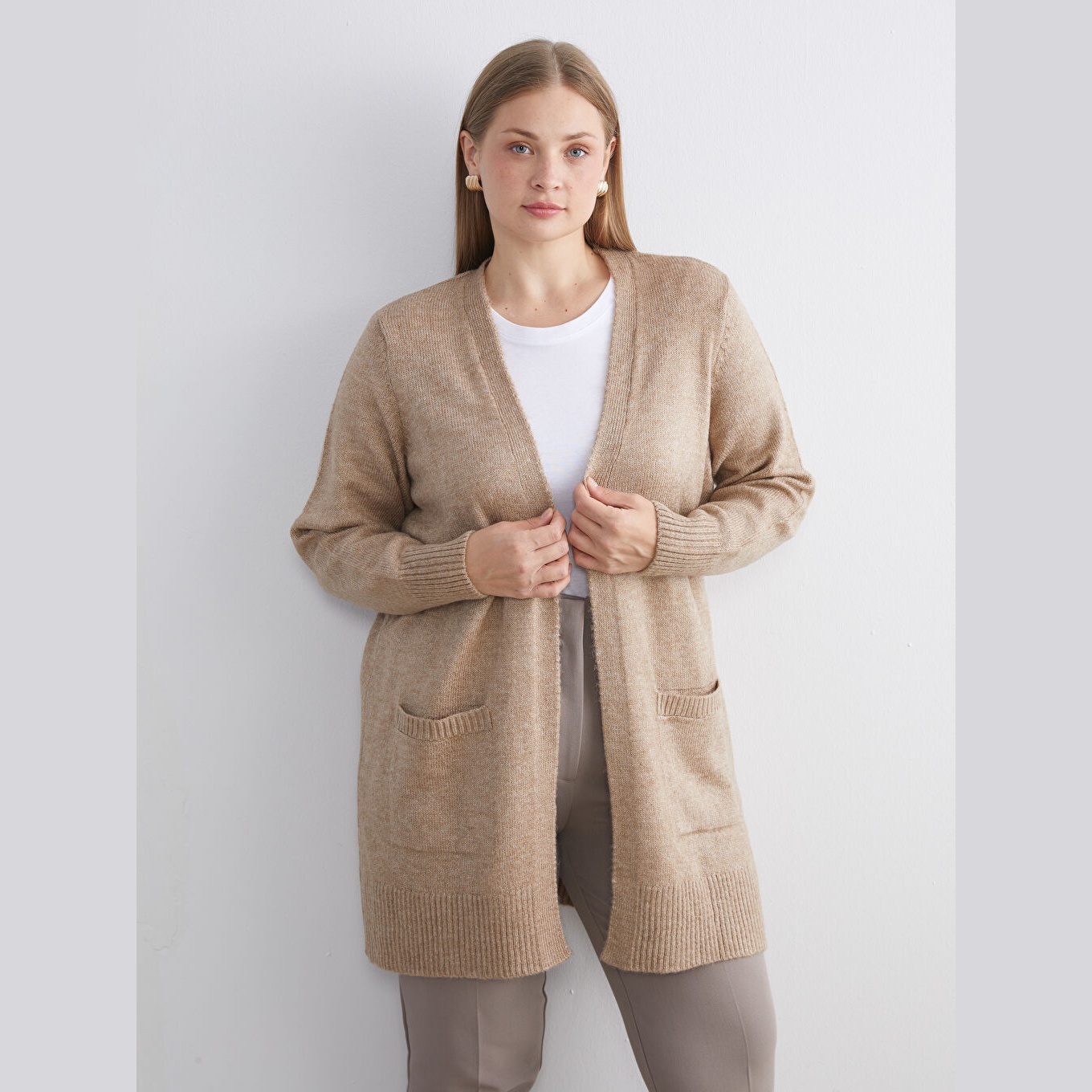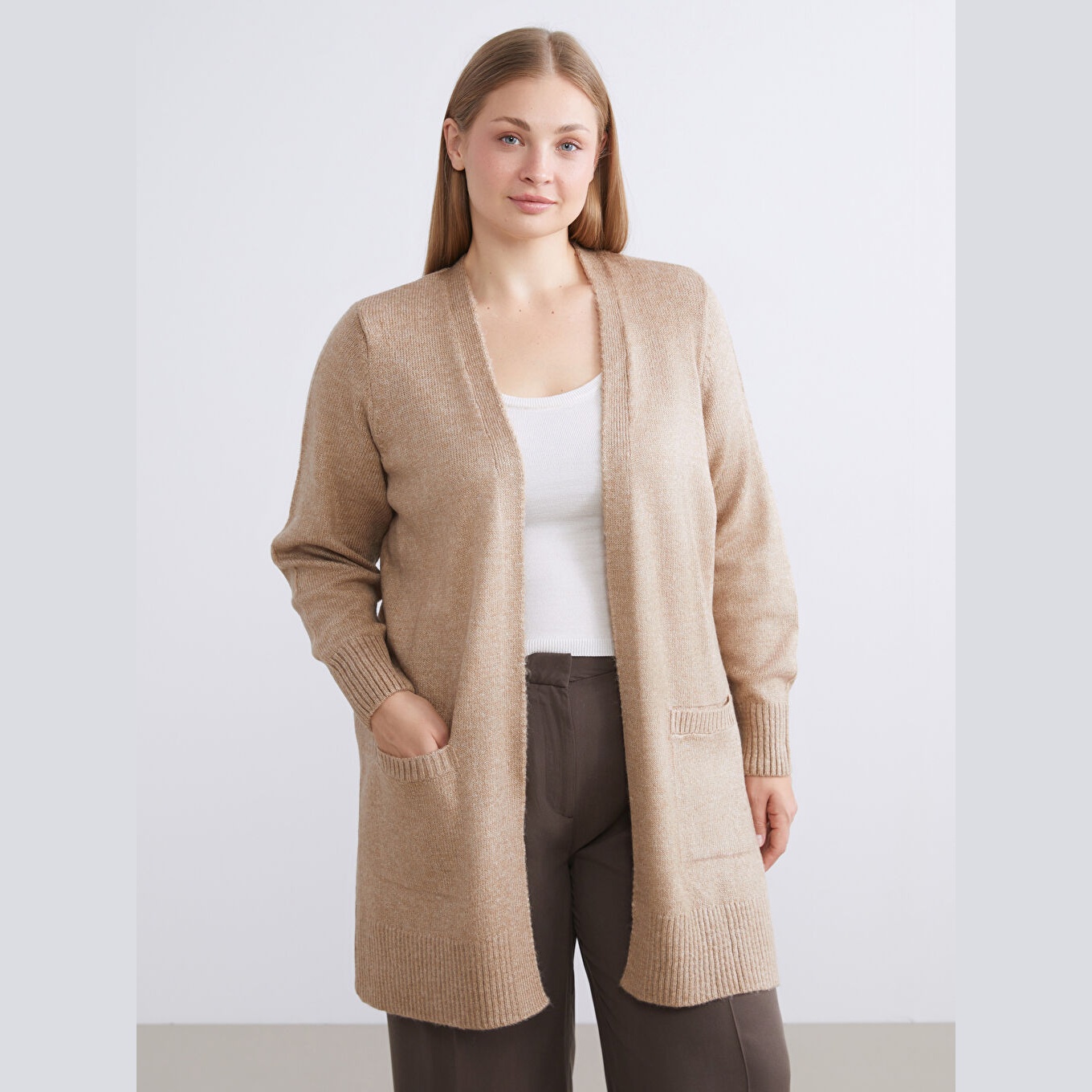 كارديغان دافئ من مجموعة LCWAIKIKI Classic بلون بني ترابي أنيق، مصمم بياقة شال (Şal Yaka) تضيف لمسة كلاسيكية وانسيابية، أكمام طويلة، قصة Loose & Bol تمنحك مظهرًا فضفاضًا وانسيابيًا، تصميم سادة بدون نقوش، خامة Triko سميكة بتركيبة تحتوي على 74% أكريليك و26% بوليستر، بطول يُقاس من الكتف، مخصص ضمن مجموعة Büyük Beden لتوفير ملاءمة مثالية للسيدات بمقاسات كبيرة، مثالي للتنسيق مع بناطيل قماش أو جينز لإطلالة شتوية أنيقة.