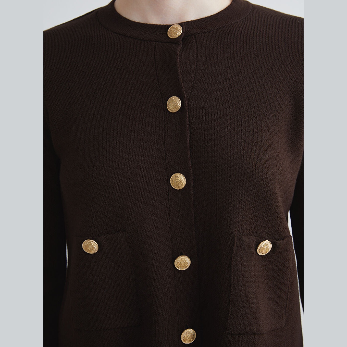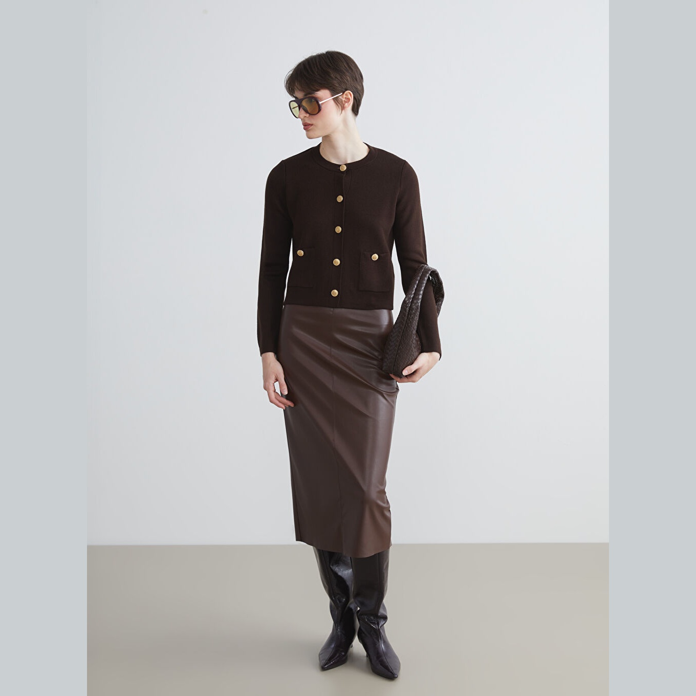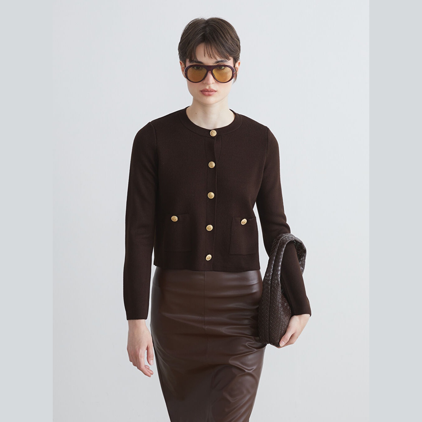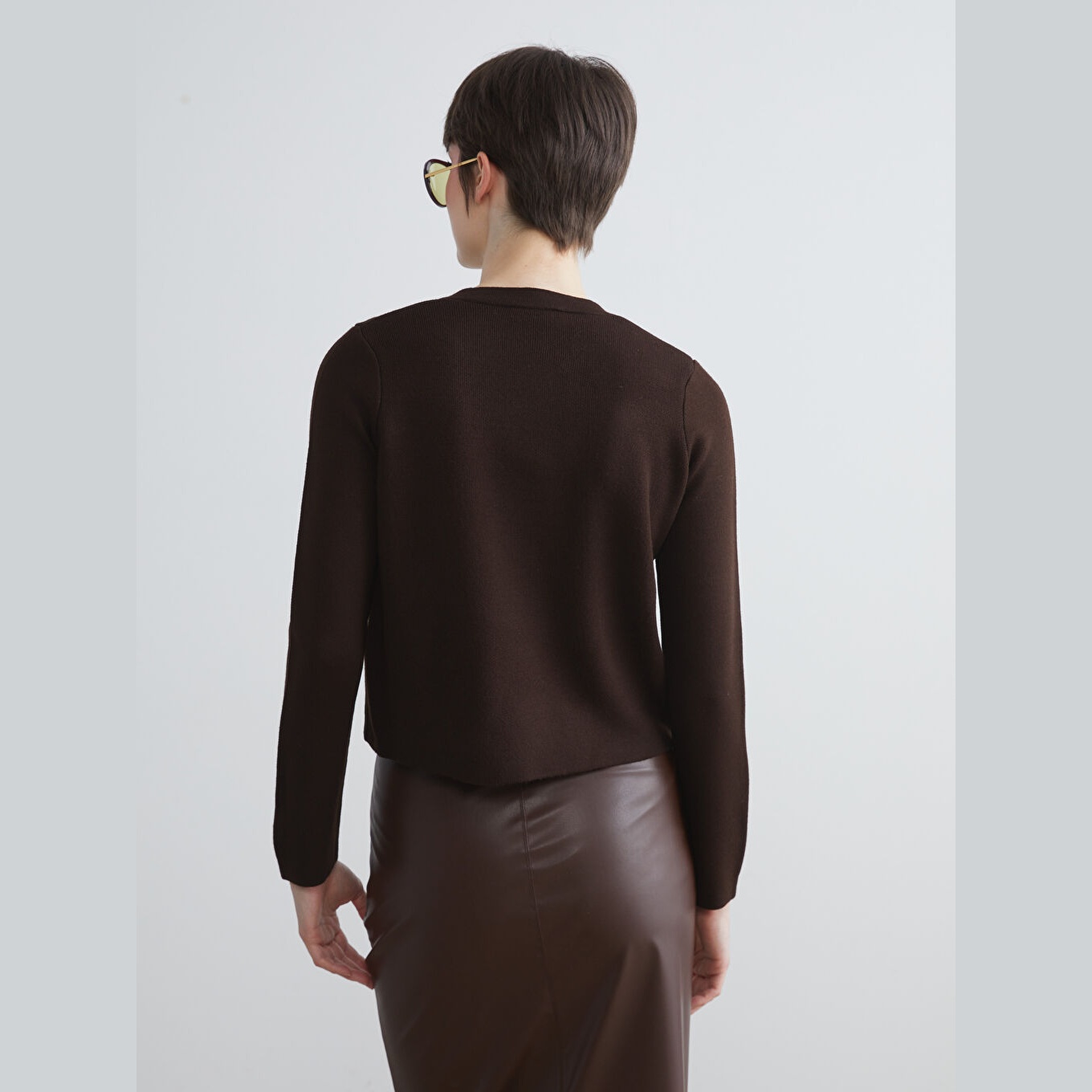 كارديغان نسائي بياقة دائرية من LCW Vision – بني (قصة قياسية، خامة تريكو متوسطة السماكة، تصميم سادة، أكمام طويلة، 100% أكريليك)