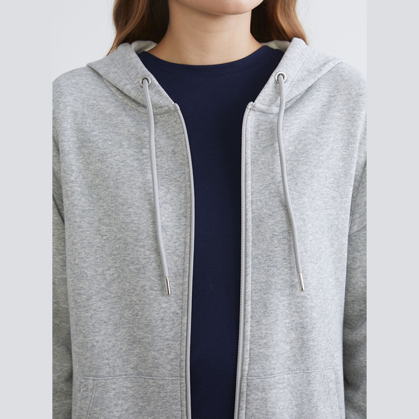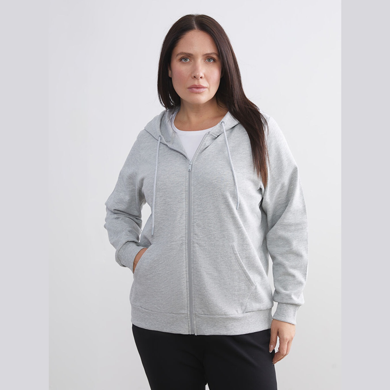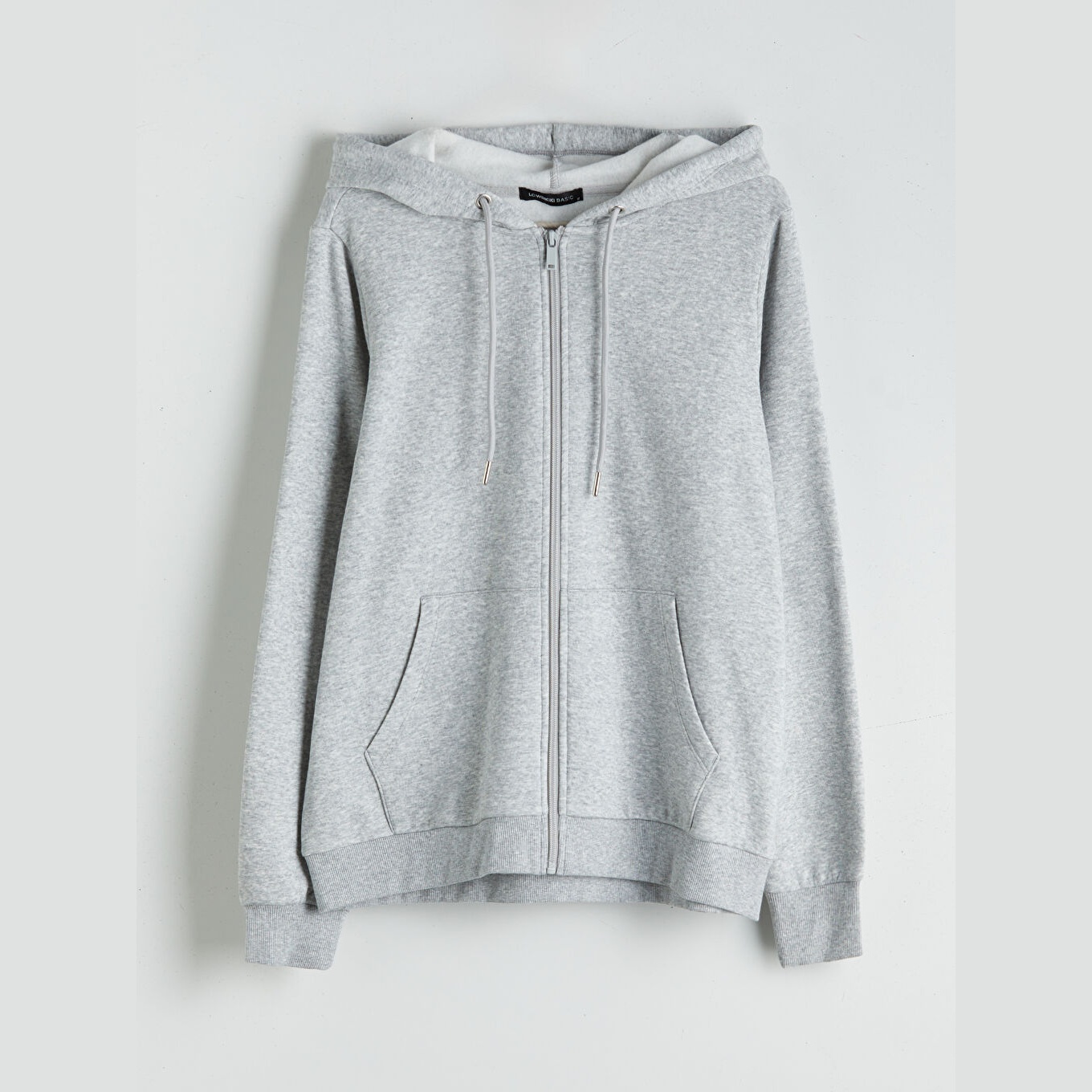 سويت شيرت نسائي بسحاب من LCWAIKIKI Basic – رمادي (قصة قياسية، خامة شاردون مزدوج، تصميم سادة، بقبعة وسحاب أمامي، ضمن مجموعة المقاسات الكبيرة)