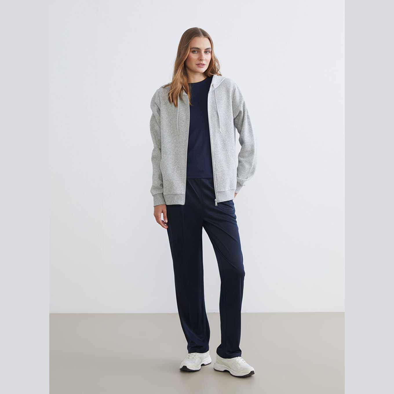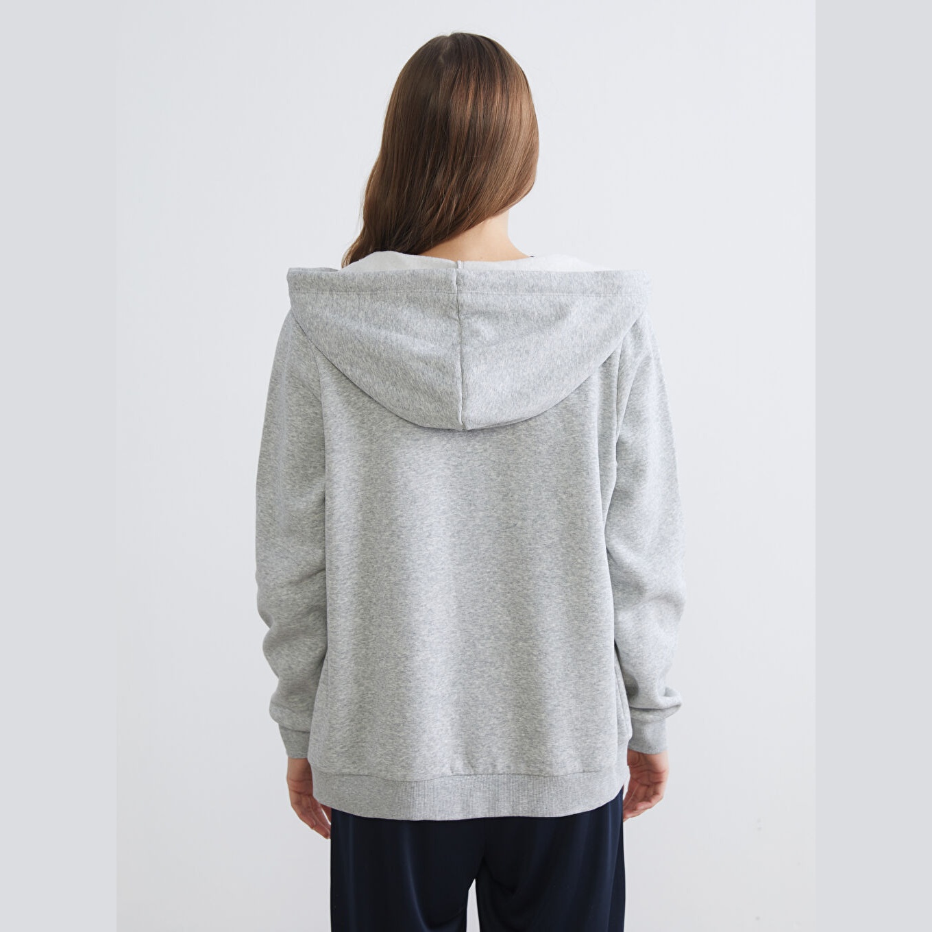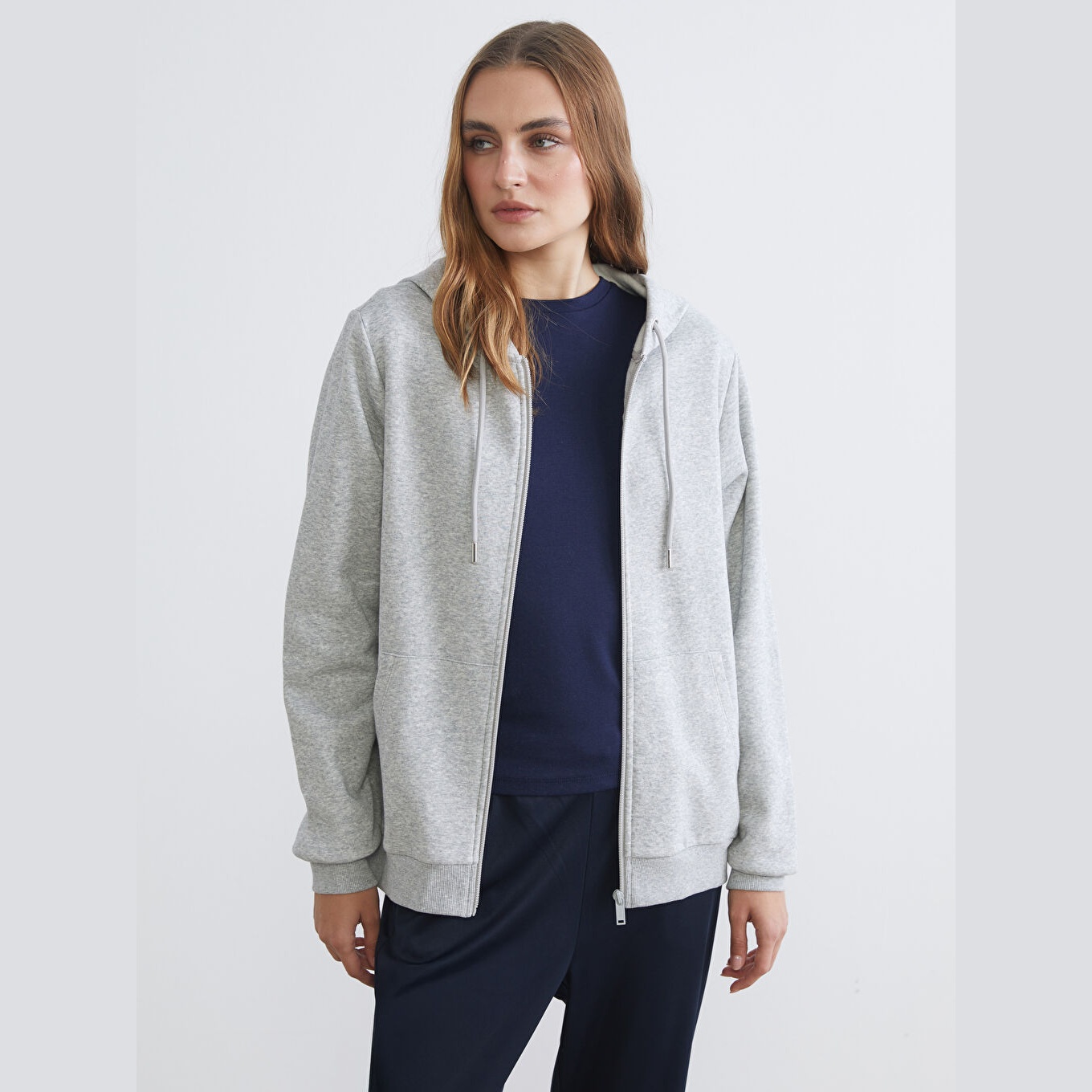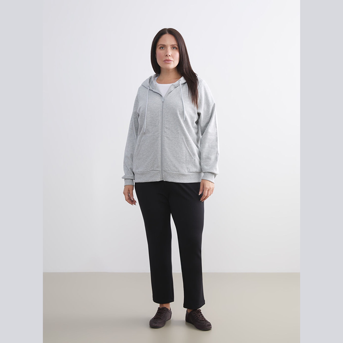 سويت شيرت نسائي بسحاب من LCWAIKIKI Basic – رمادي (قصة قياسية، خامة شاردون مزدوج، تصميم سادة، بقبعة وسحاب أمامي، ضمن مجموعة المقاسات الكبيرة)