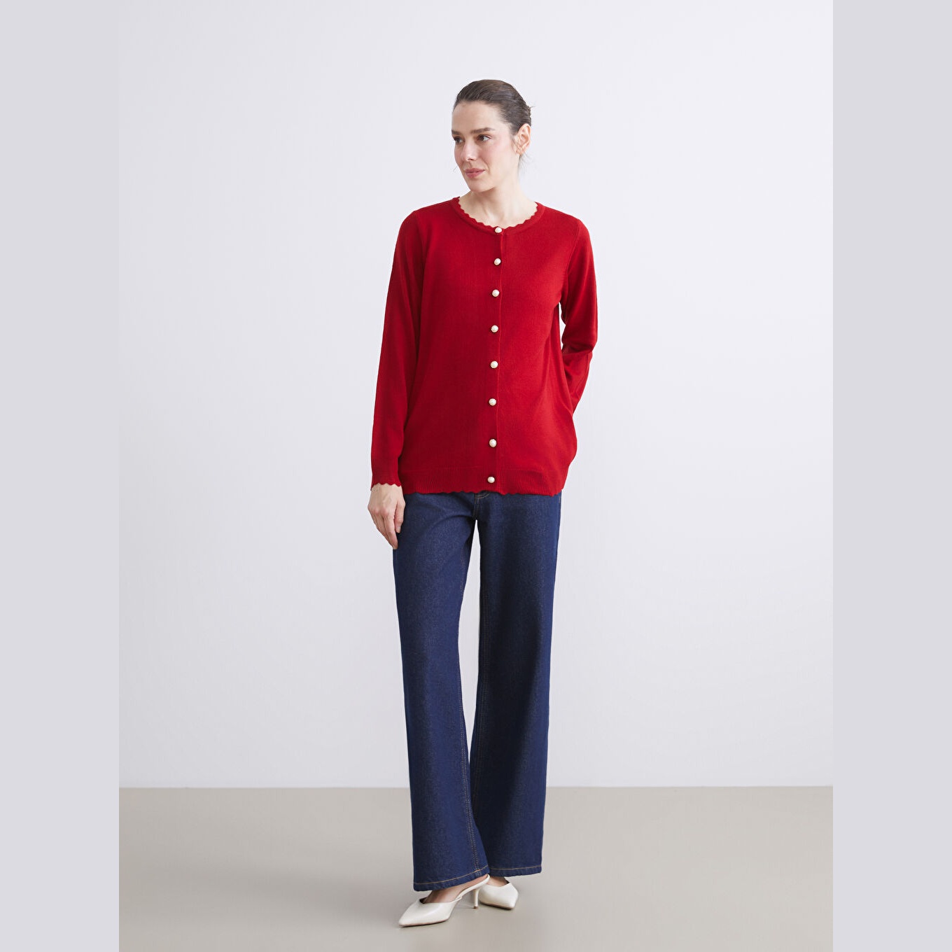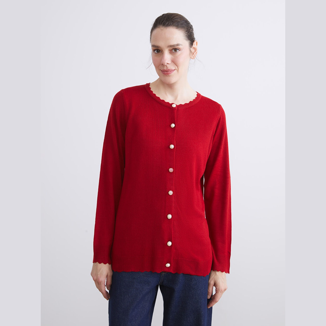 كارديغان أنيق من مجموعة LCW Grace بلون أحمر جريء، مصمم بياقة دائرية (Bisiklet Yaka)، أكمام طويلة، قصة Standart & Regular تمنحك مظهرًا مريحًا ومتوازنًا، تصميم سادة بدون نقوش، خامة Triko متوسطة السماكة مصنوعة بالكامل من 100% أكريليك، بطول Midi يُقاس من الكتف، مزود بأزرار أمامية للإغلاق، مخصص ضمن مجموعة Büyük Beden لتوفير ملاءمة مثالية للسيدات بمقاسات كبيرة، مثالي للتنسيق مع بناطيل قماش أو تنانير لإطلالة خريفية أو مكتبية أنيقة.