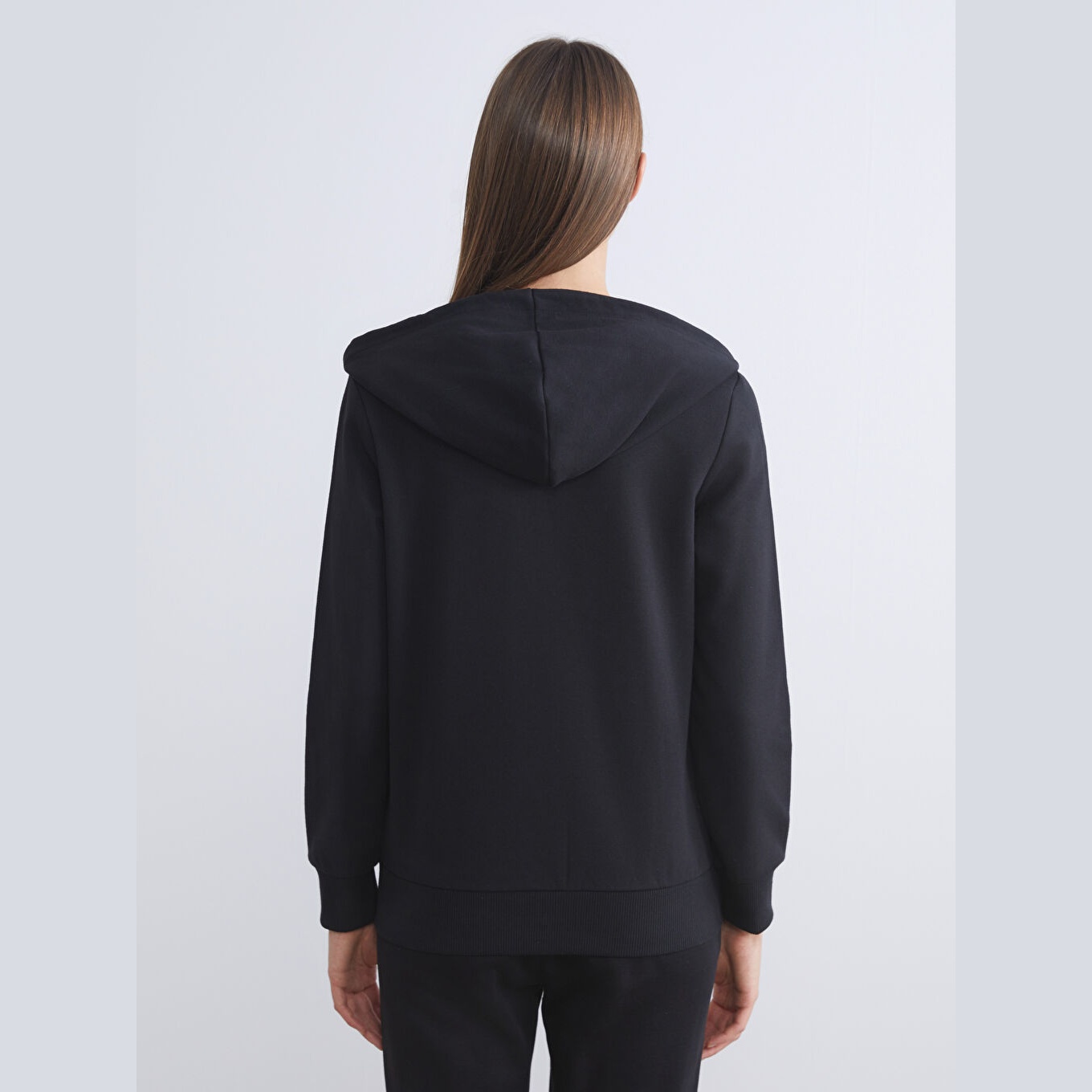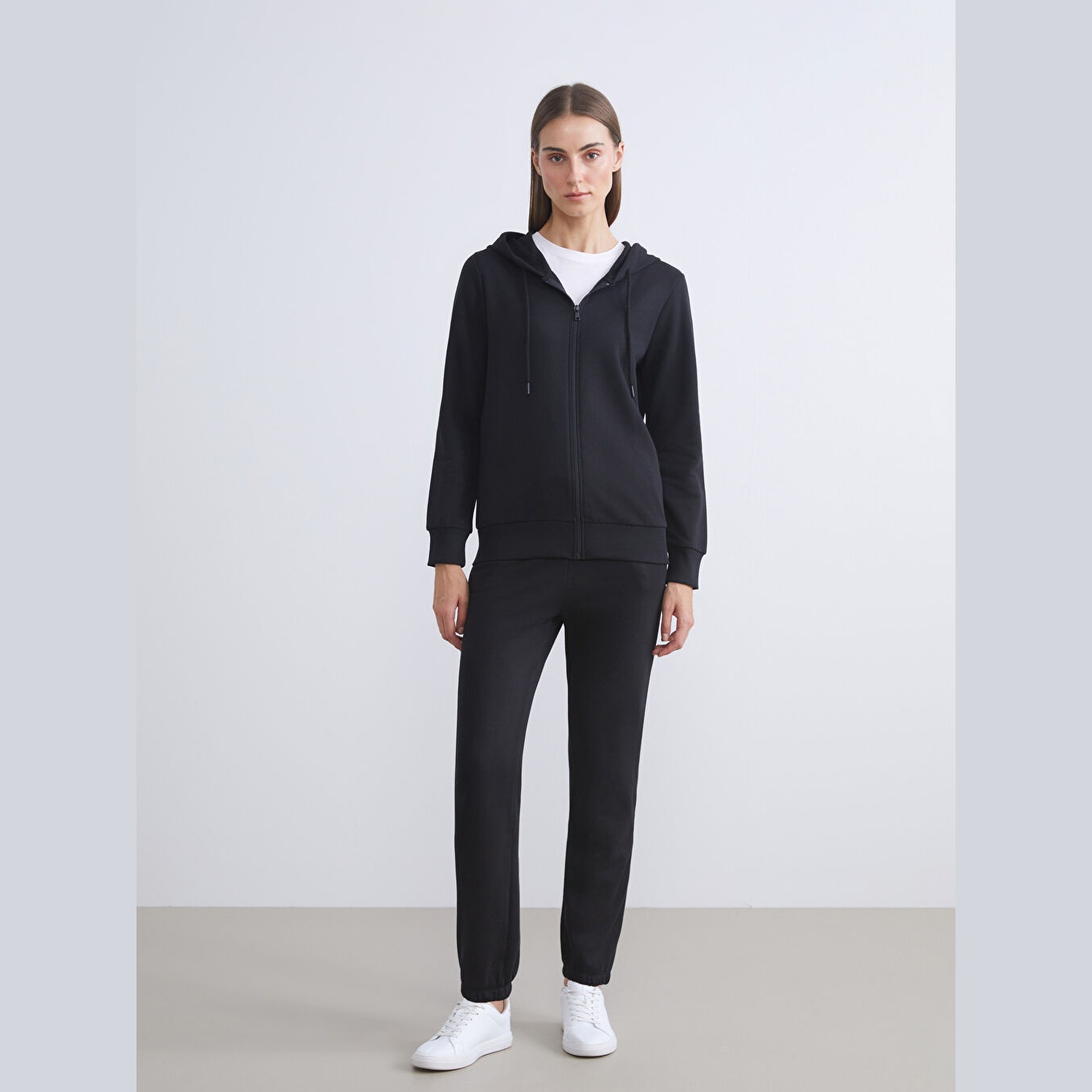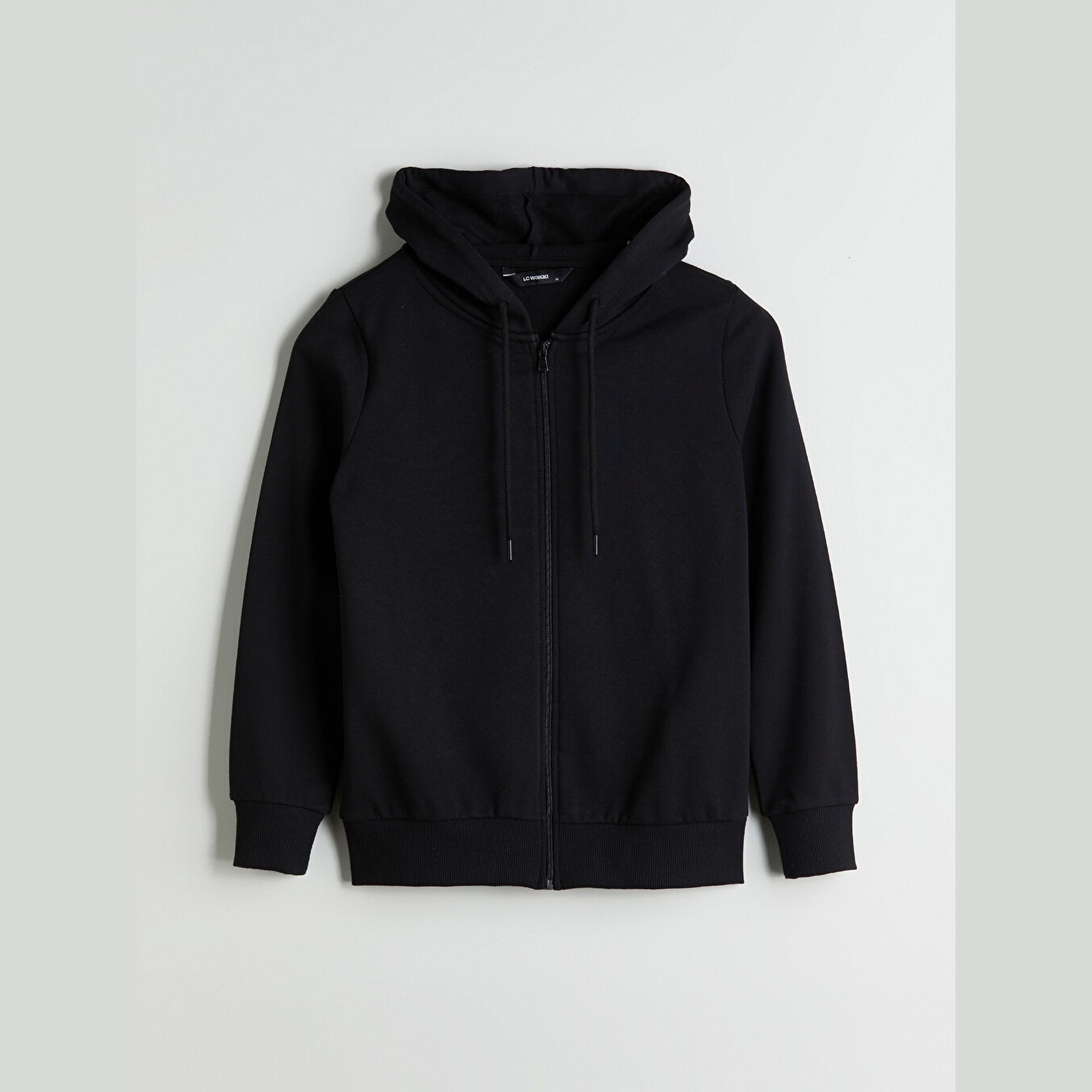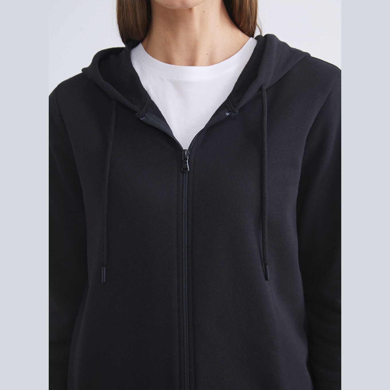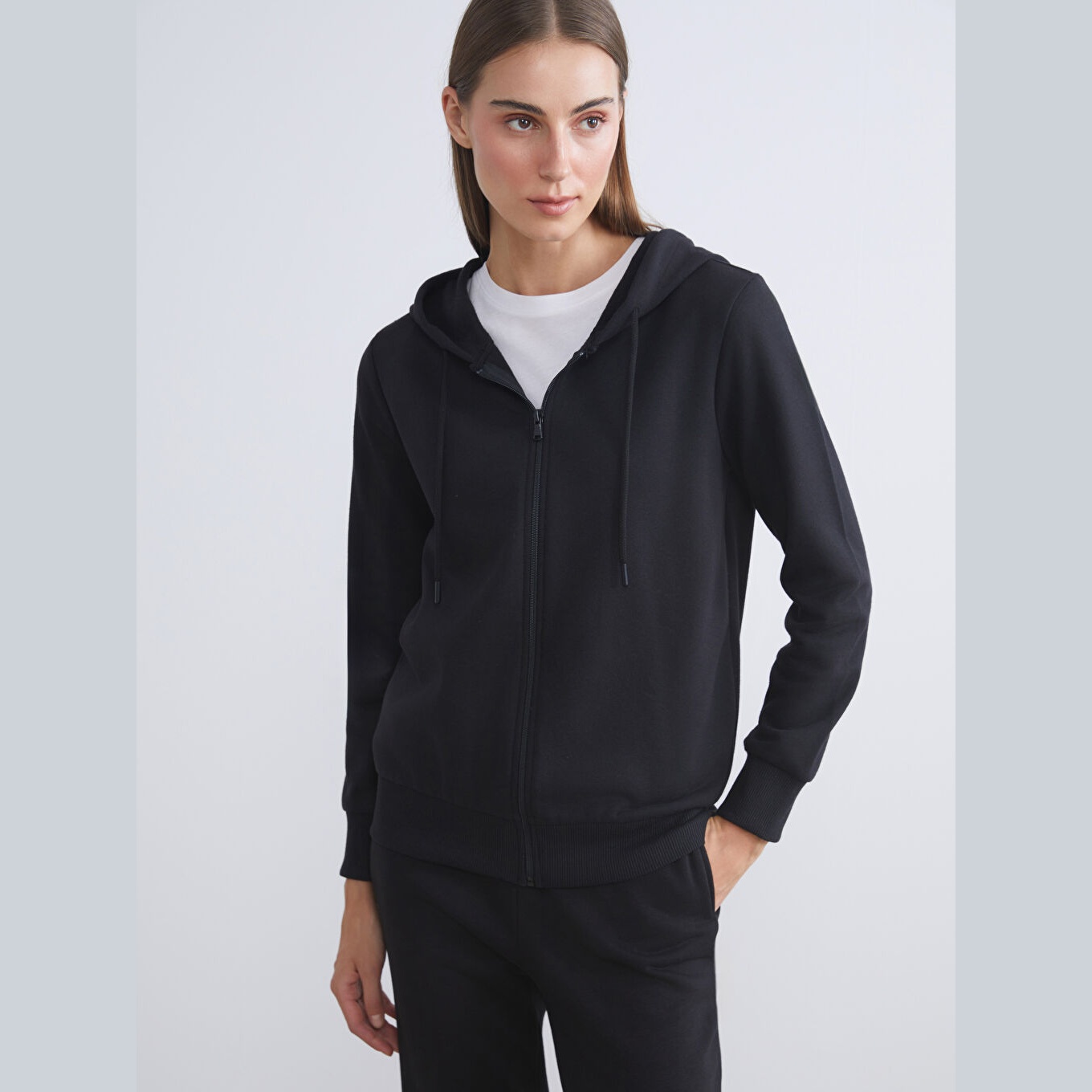 سويت شيرت نسائي بسحاب من LCW ECO – أسود (قصة قياسية، خامة ثلاثية الخيوط، تصميم سادة، بقبعة وسحاب أمامي)