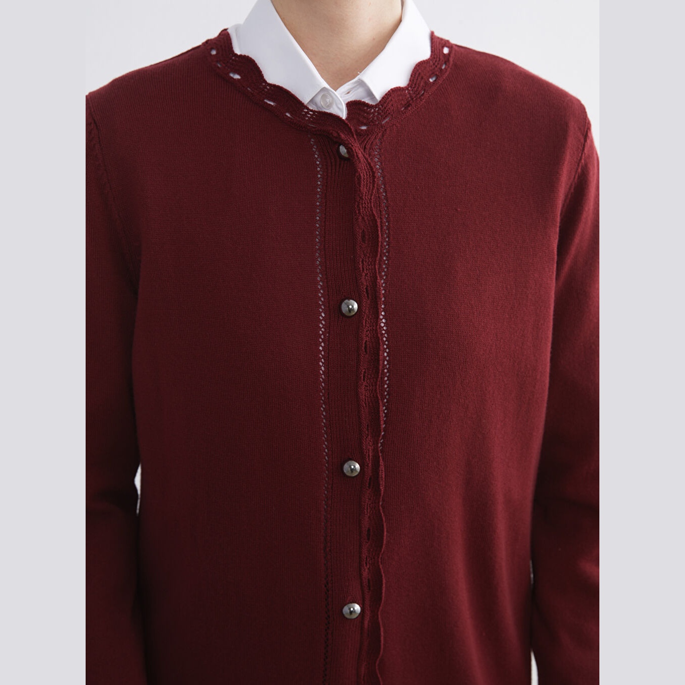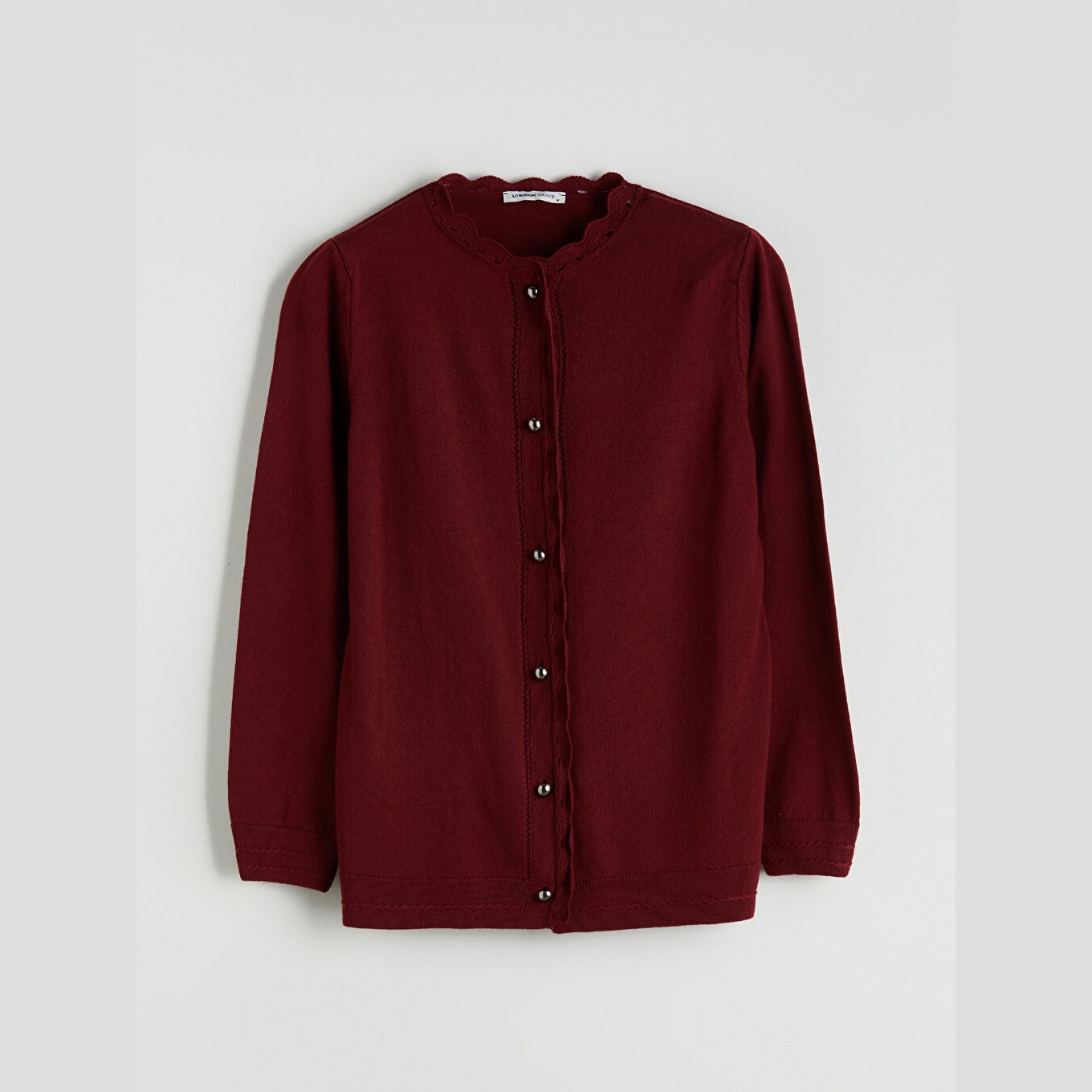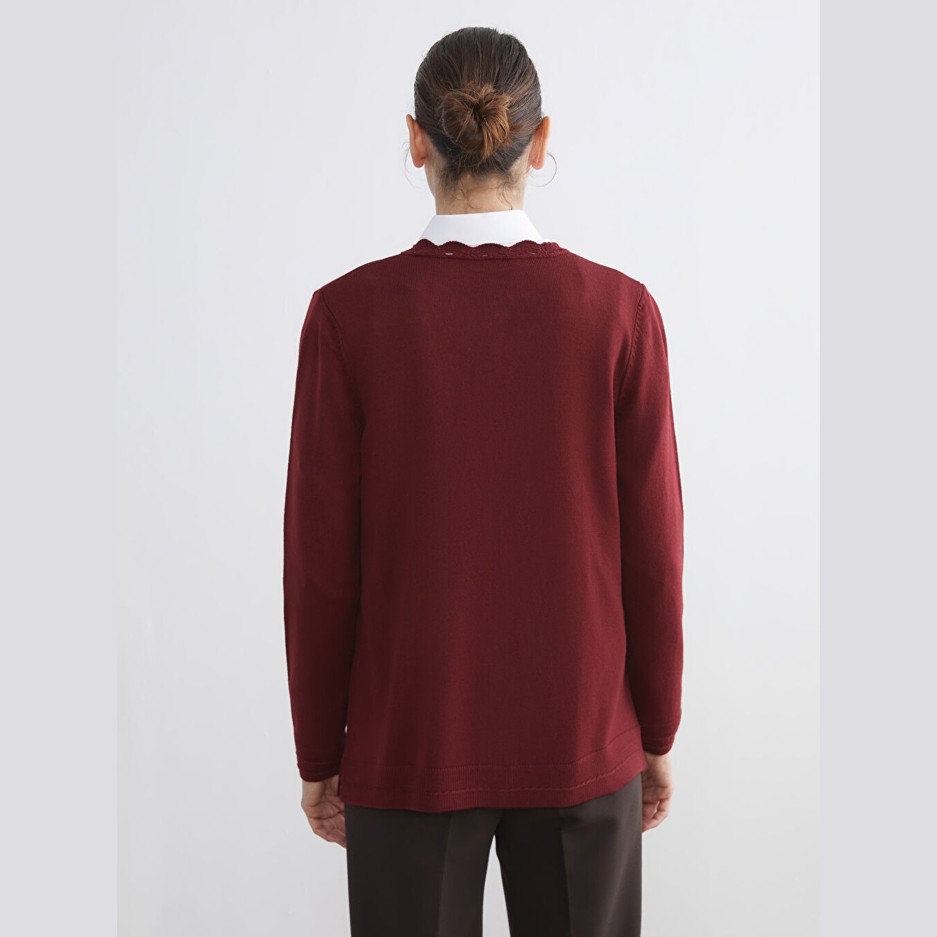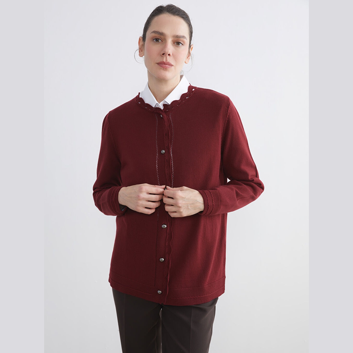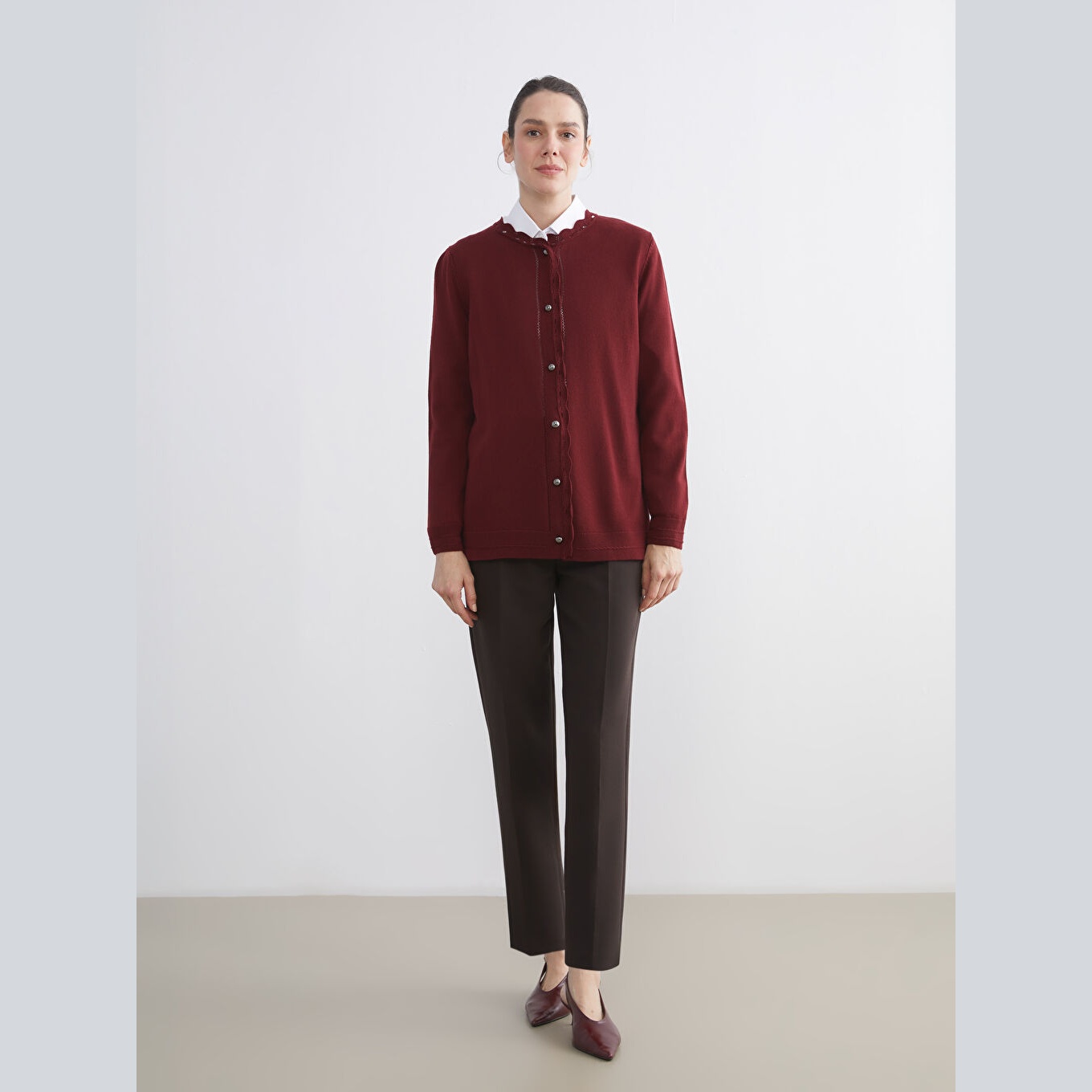 كارديغان نسائي بياقة دائرية مع كشكش من LCW Grace – بوردو (قصة قياسية، خامة تريكو متوسطة السماكة، تصميم سادة، ملمس كشكش)