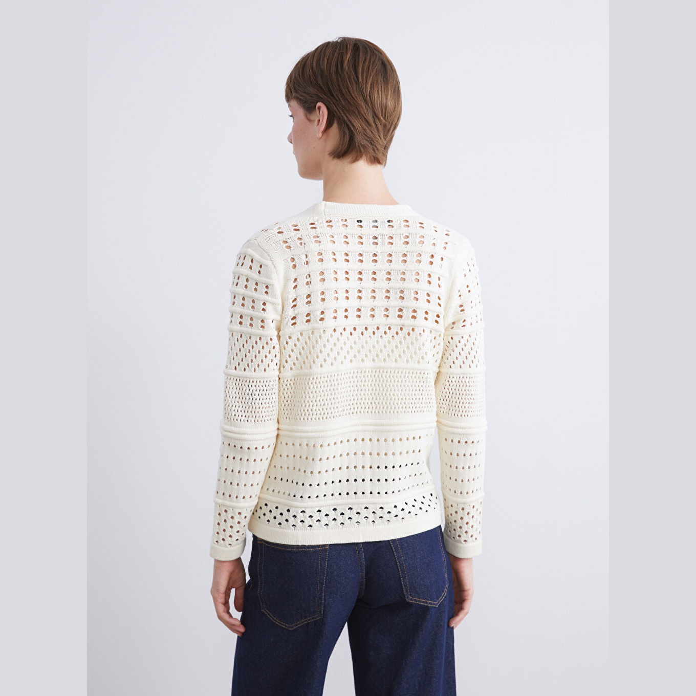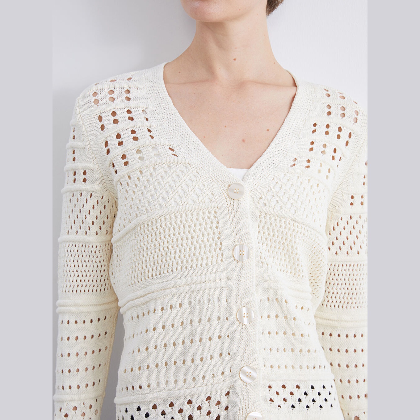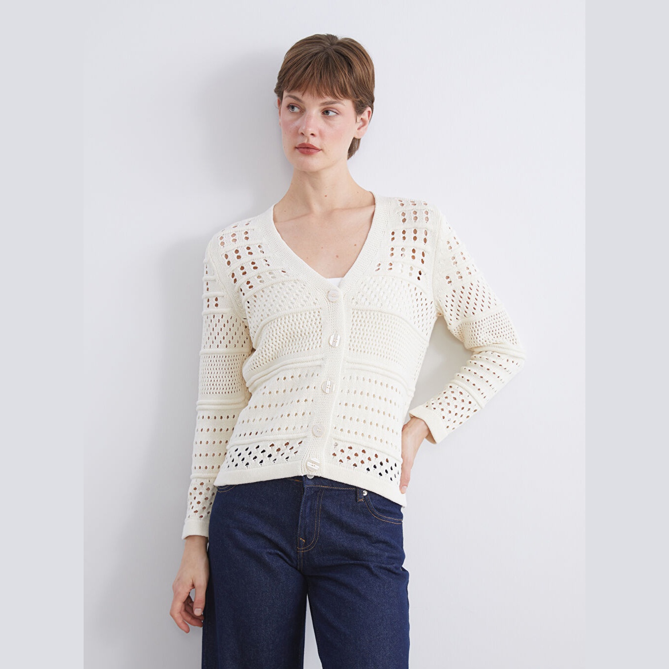 كارديغان نسائي بياقة V Ajurlu من LCW Comfort – إكرو (قصة قياسية، خامة تريكو مخرمة، مناسب لفترة الحمل وما بعدها)