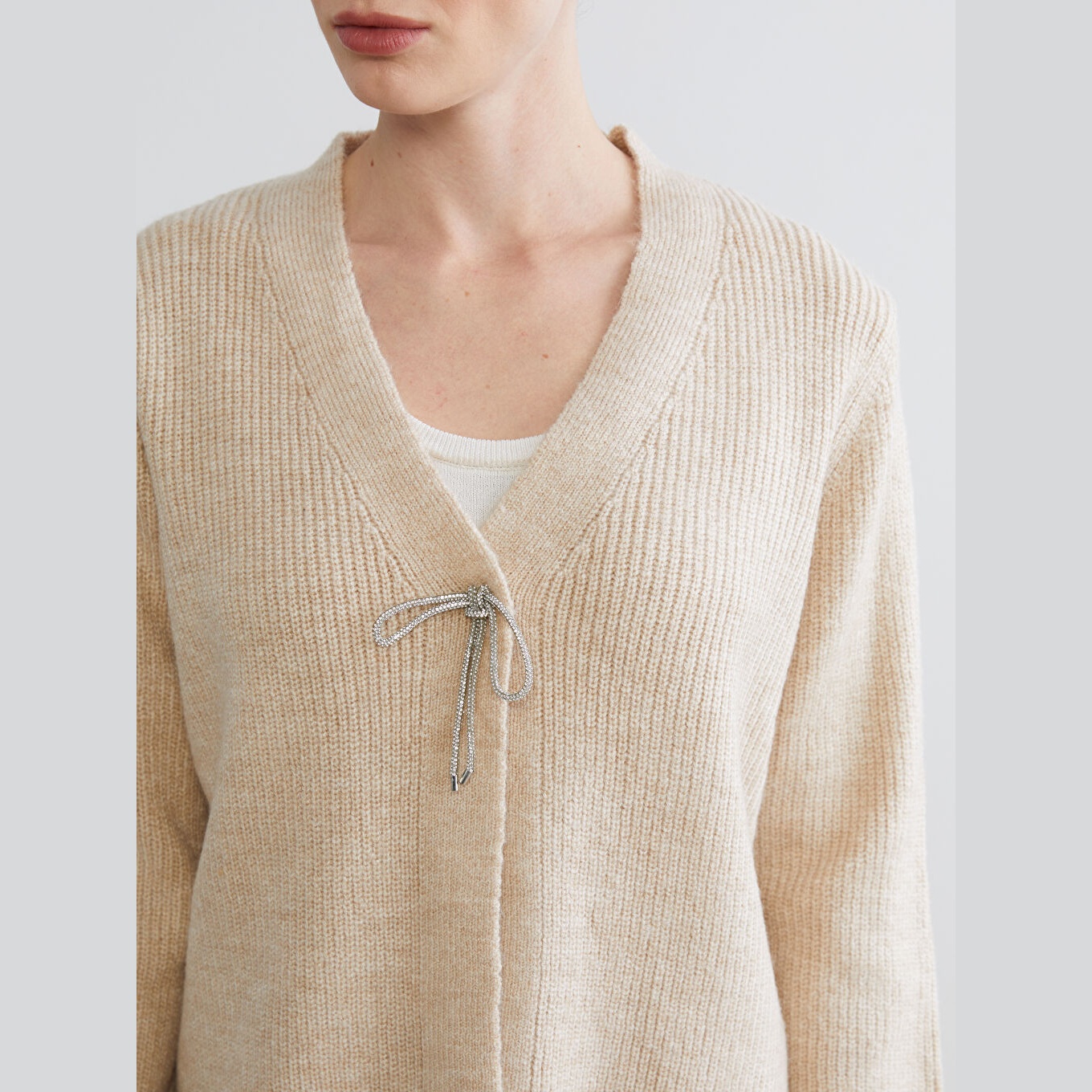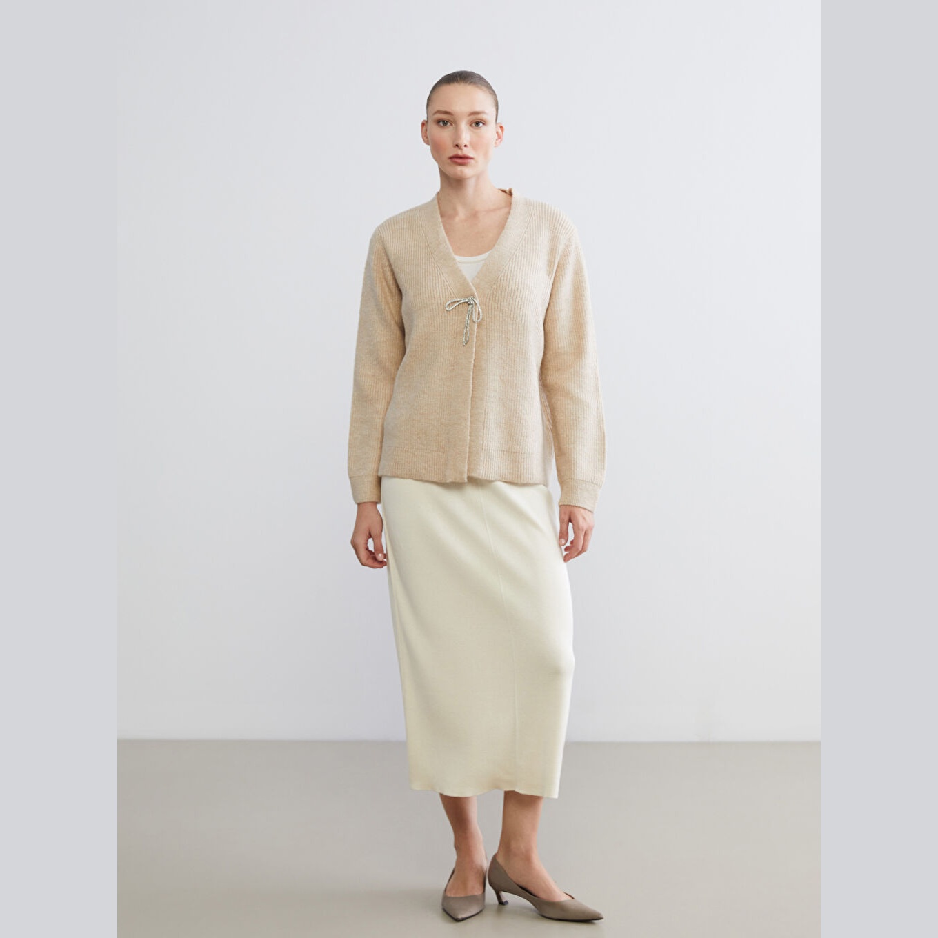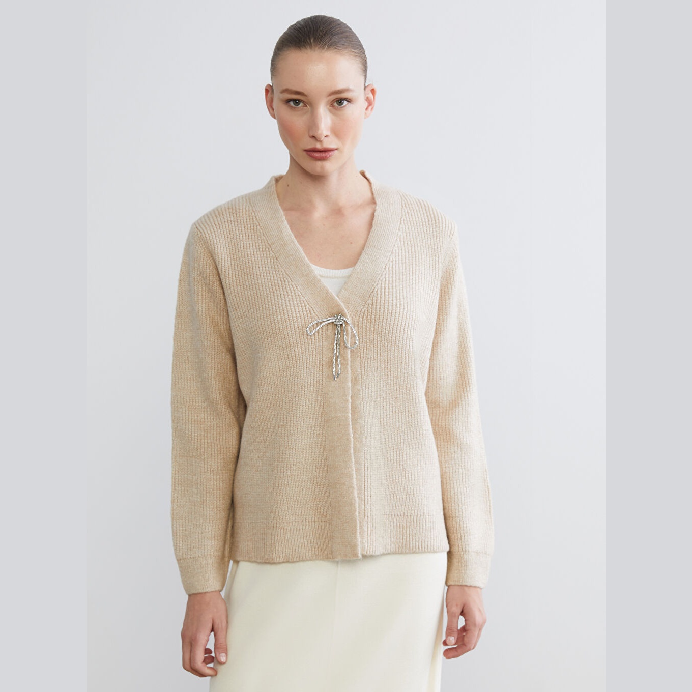 كارديغان نسائي بياقة V من LCWAIKIKI Classic – بيج (قصة واسعة، خامة تريكو متوسطة السماكة، تصميم سادة، ملمس Fitilli)