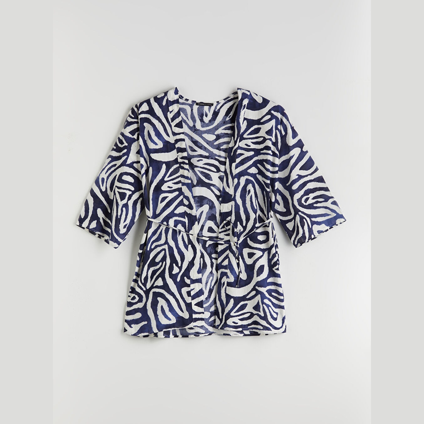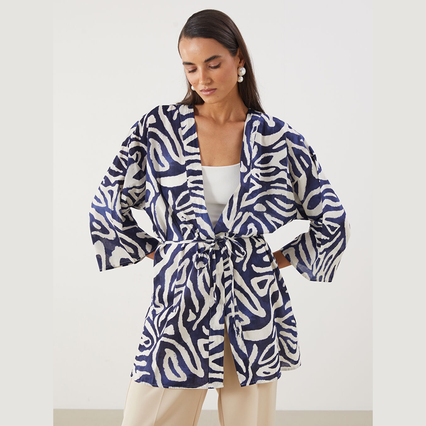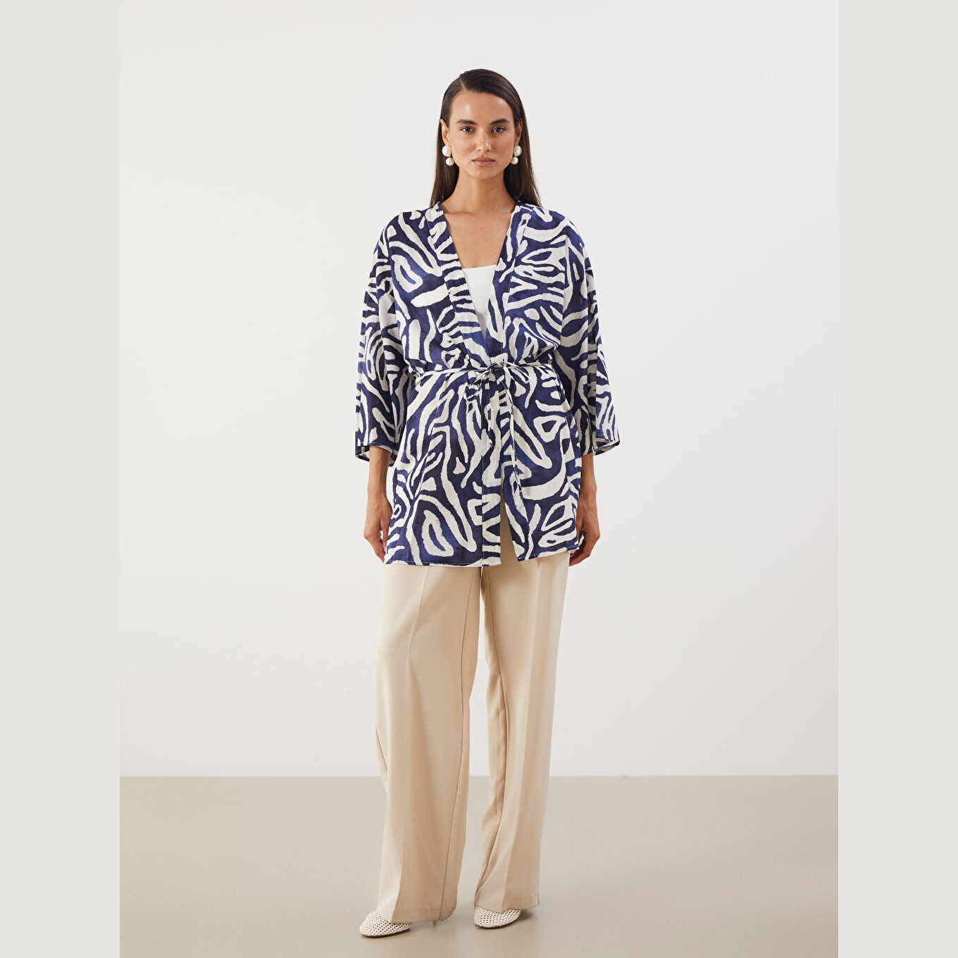كيمونو نسائي واسع بياقة شال من LCWAIKIKI Classic – أزرق (قصة أوفرسايز، تصميم مطبوع، خامة 100% قطن، كم تروكار، مزود بحزام)