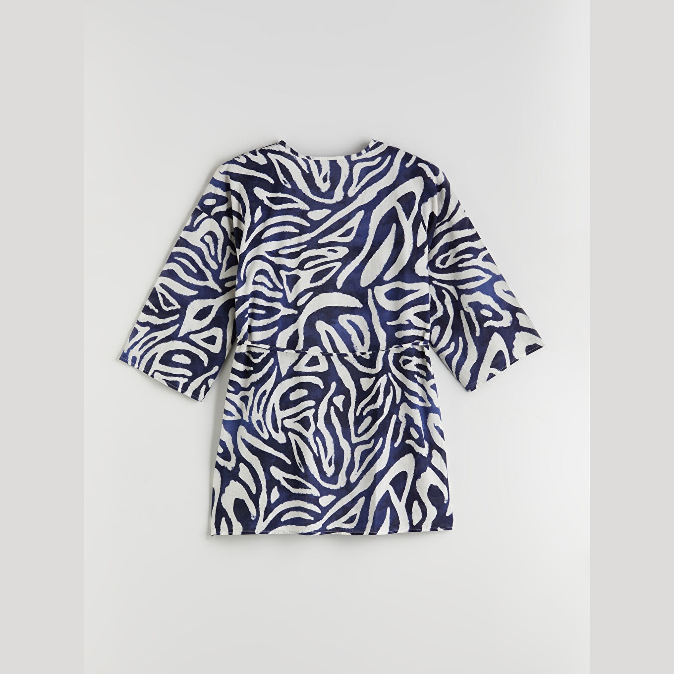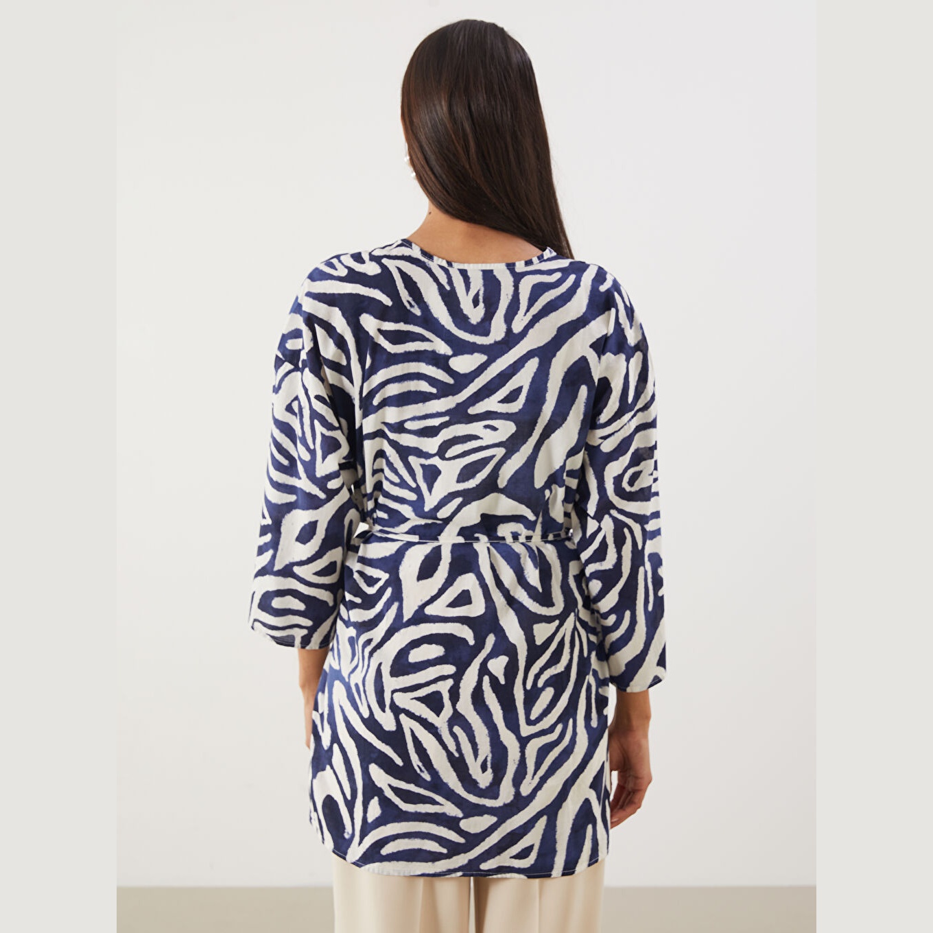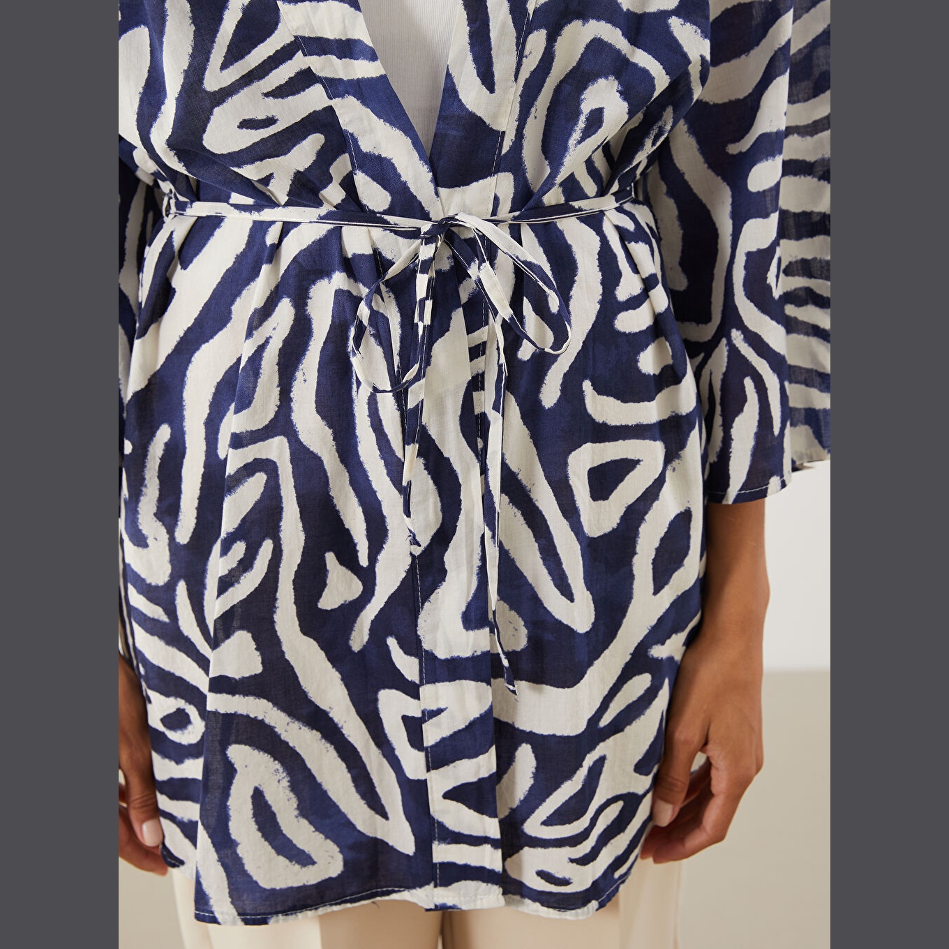 كيمونو نسائي واسع بياقة شال من LCWAIKIKI Classic – أزرق (قصة أوفرسايز، تصميم مطبوع، خامة 100% قطن، كم تروكار، مزود بحزام)