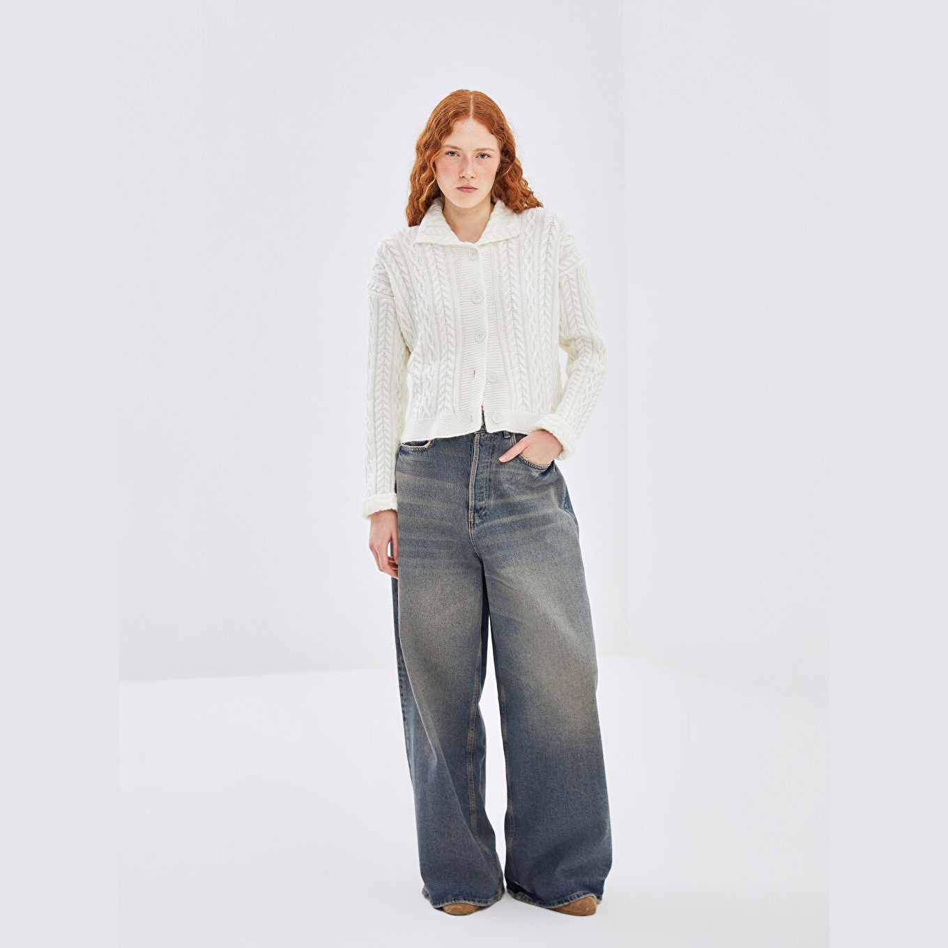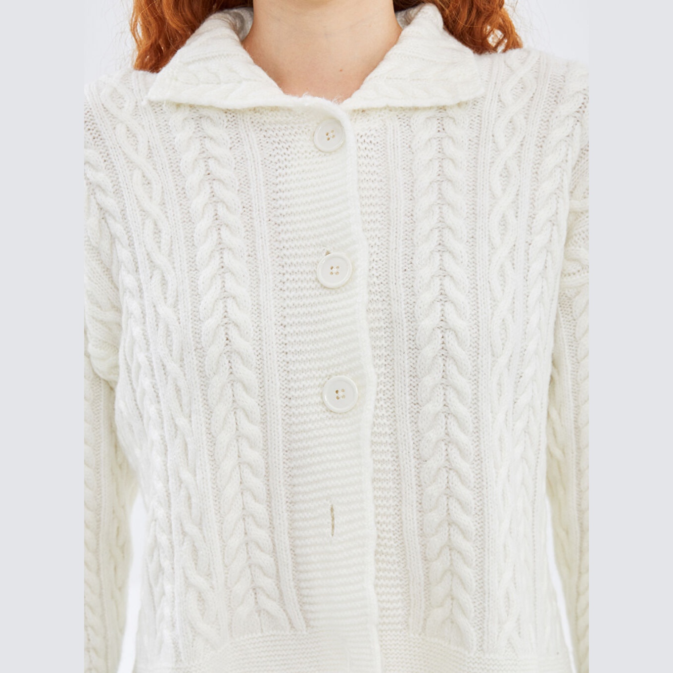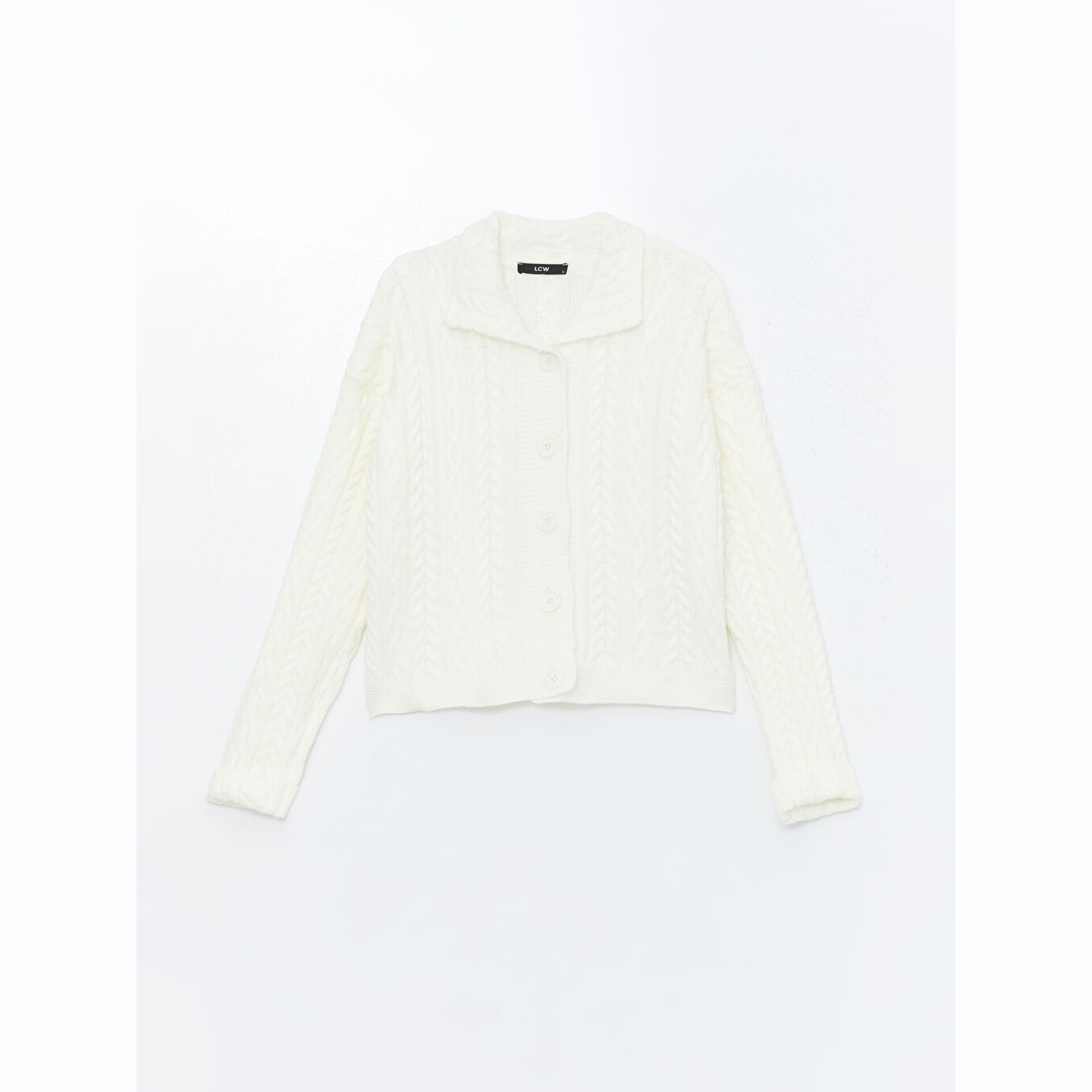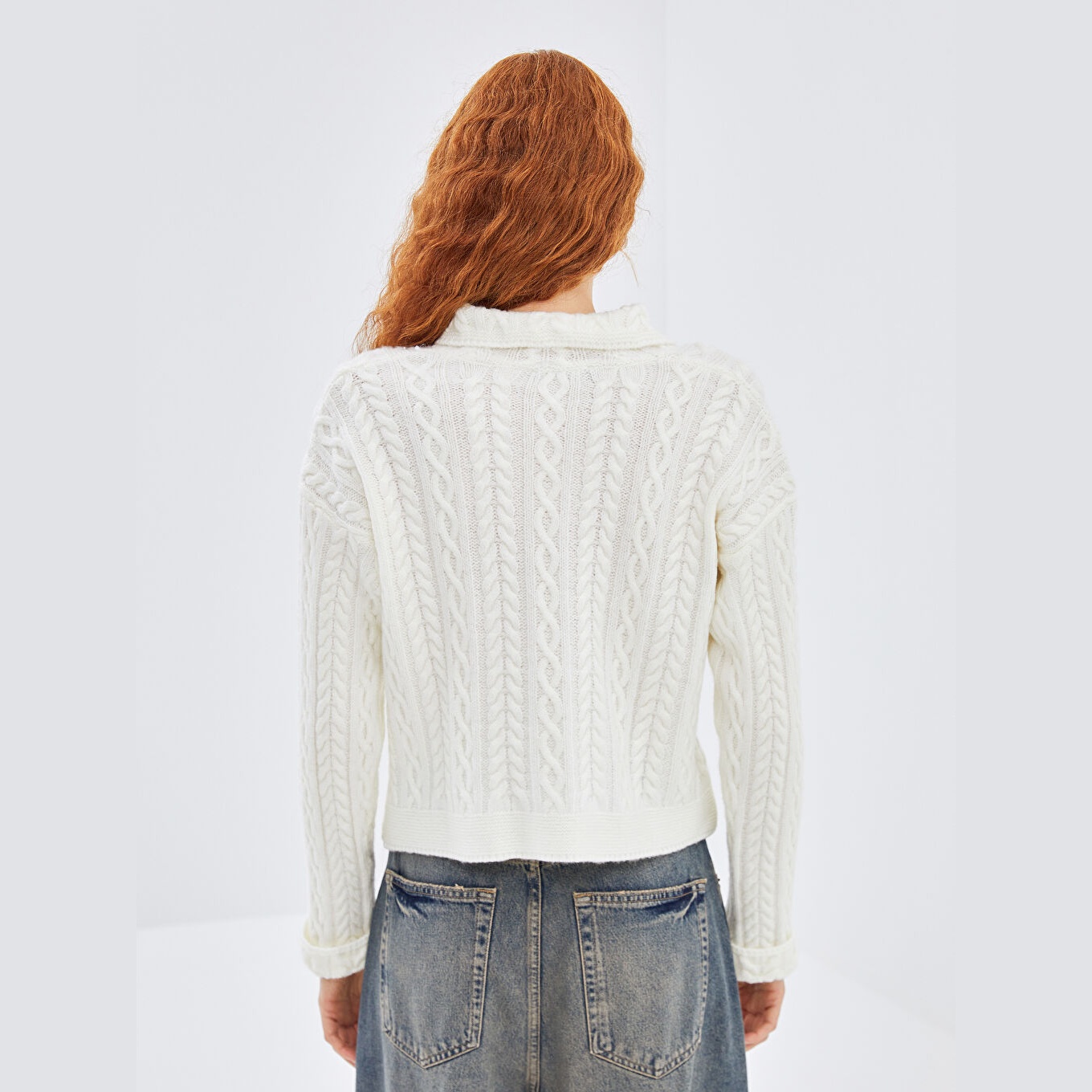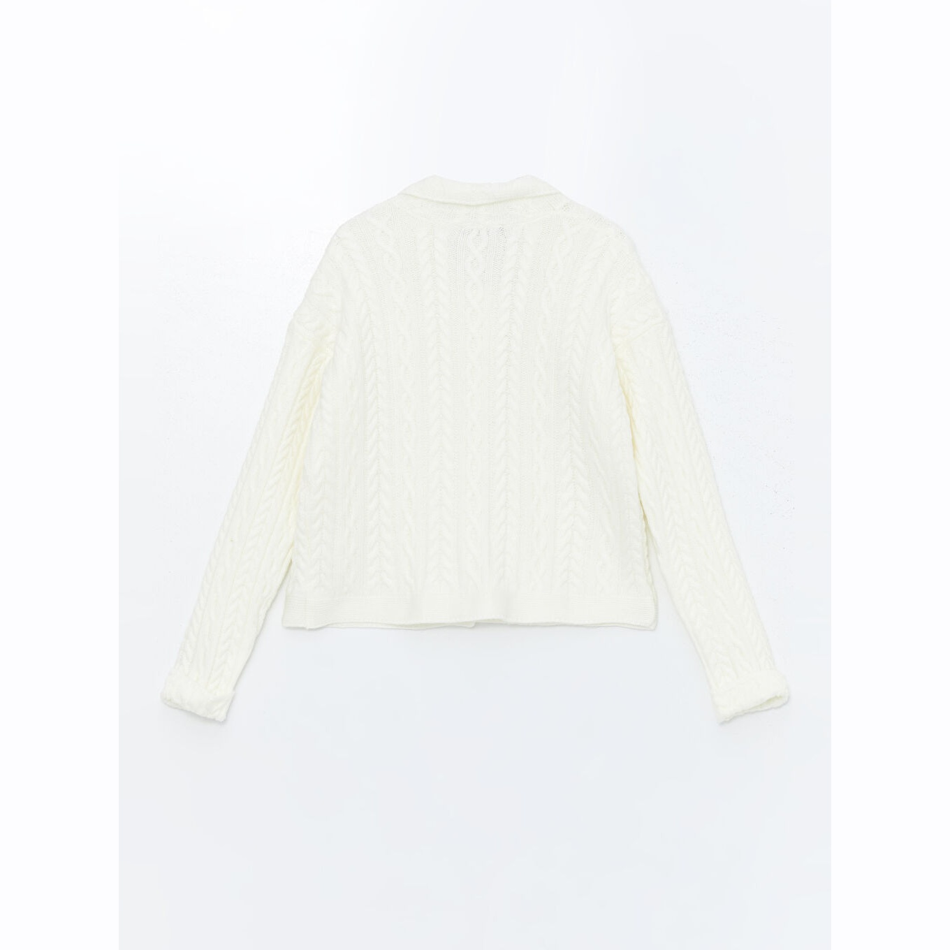 كارديغان نسائي بياقة بولو بنقشة مدمجة من LCWAIKIKI Classic – إكرو (قصة قياسية، خامة تريكو مزخرفة، أكمام طويلة)