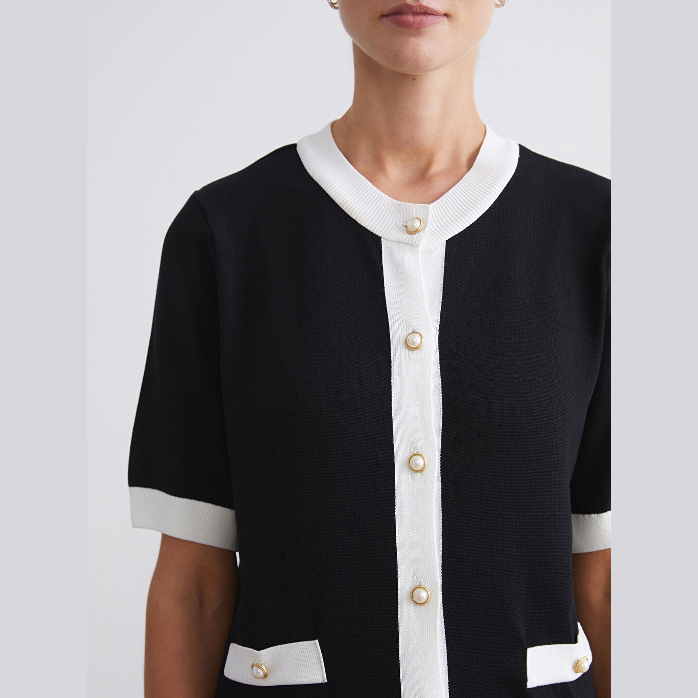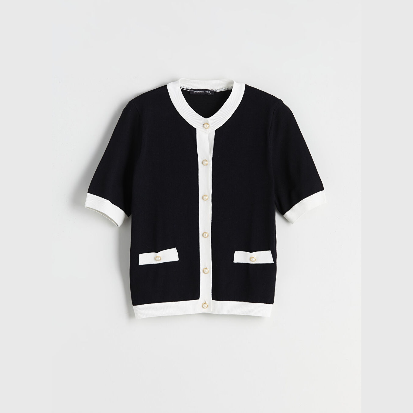 كارديغان نسائي بياقة دائرية من LCWAIKIKI Classic – أسود (قصة ضيقة، خامة تريكو خفيفة، تصميم سادة، أكمام قصيرة، بزر أمامي)