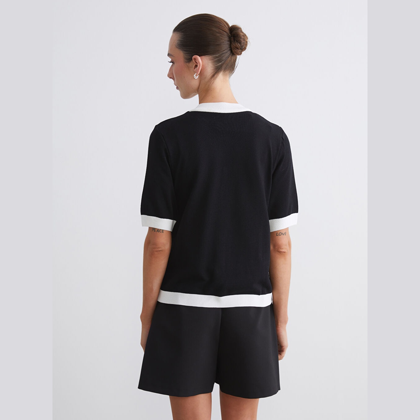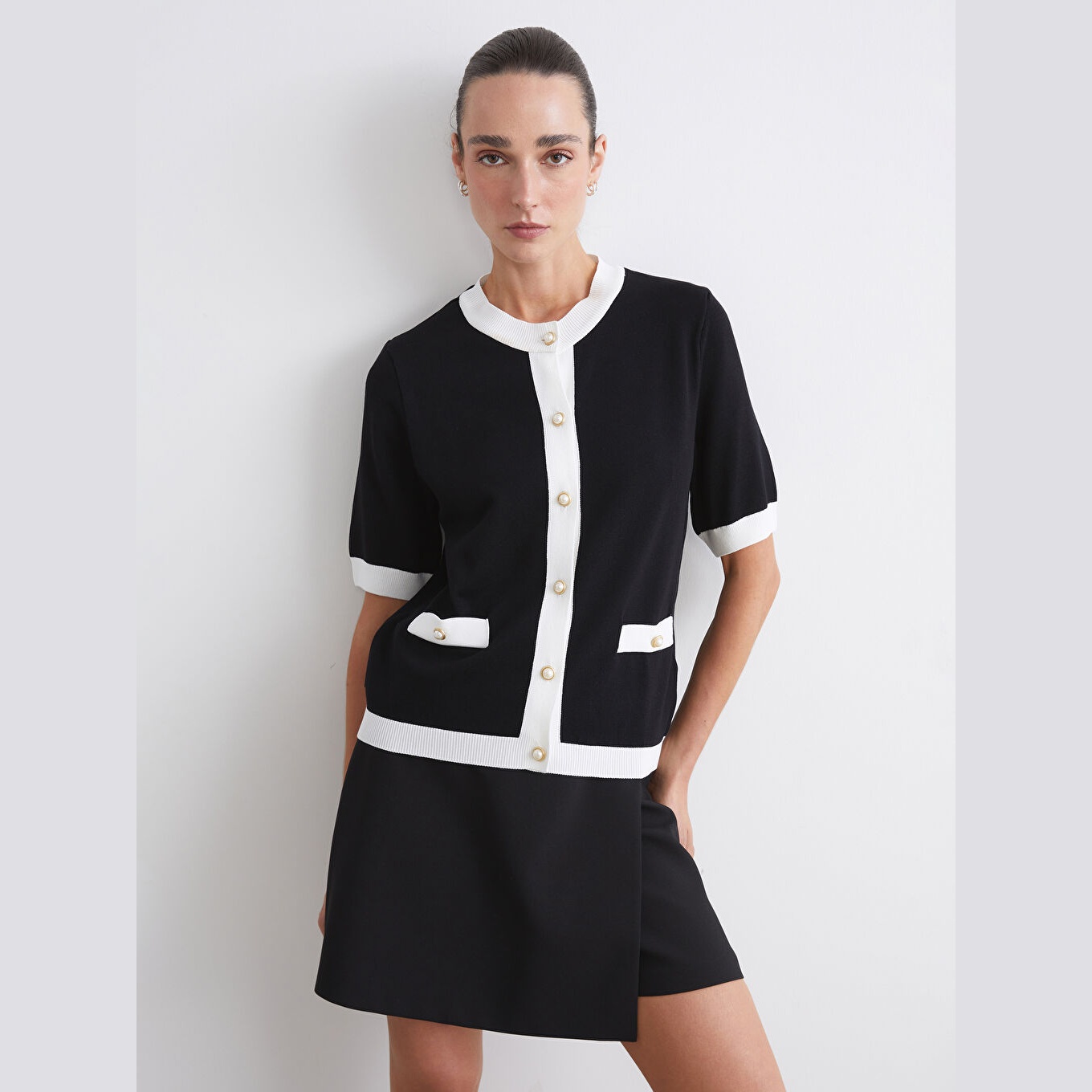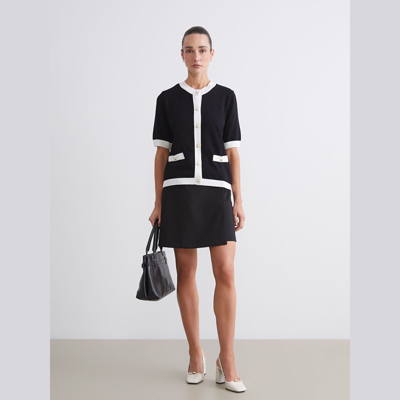 كارديغان أنيق من مجموعة LCWAIKIKI Classic بلون أسود كلاسيكي، مصمم بياقة دائرية (Bisiklet Yaka)، أكمام قصيرة، قصة Dar & Slim تمنحك مظهرًا محددًا وانسيابيًا، تصميم سادة بدون نقوش، خامة Triko خفيفة بتركيبة تحتوي على %72 فيسكوز و%28 بوليستر، مزود بأزرار أمامية للإغلاق، بطول يُقاس من الكتف، مثالي للتنسيق مع بناطيل خصر عالي أو تنانير لإطلالة صيفية أنيقة.