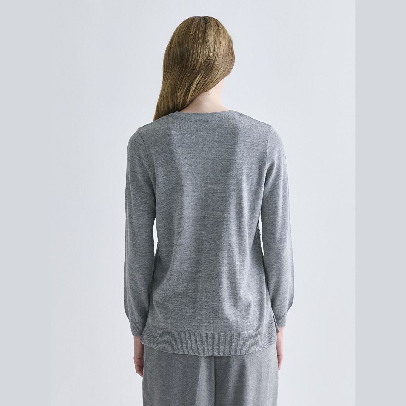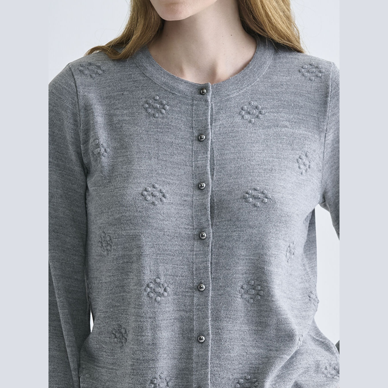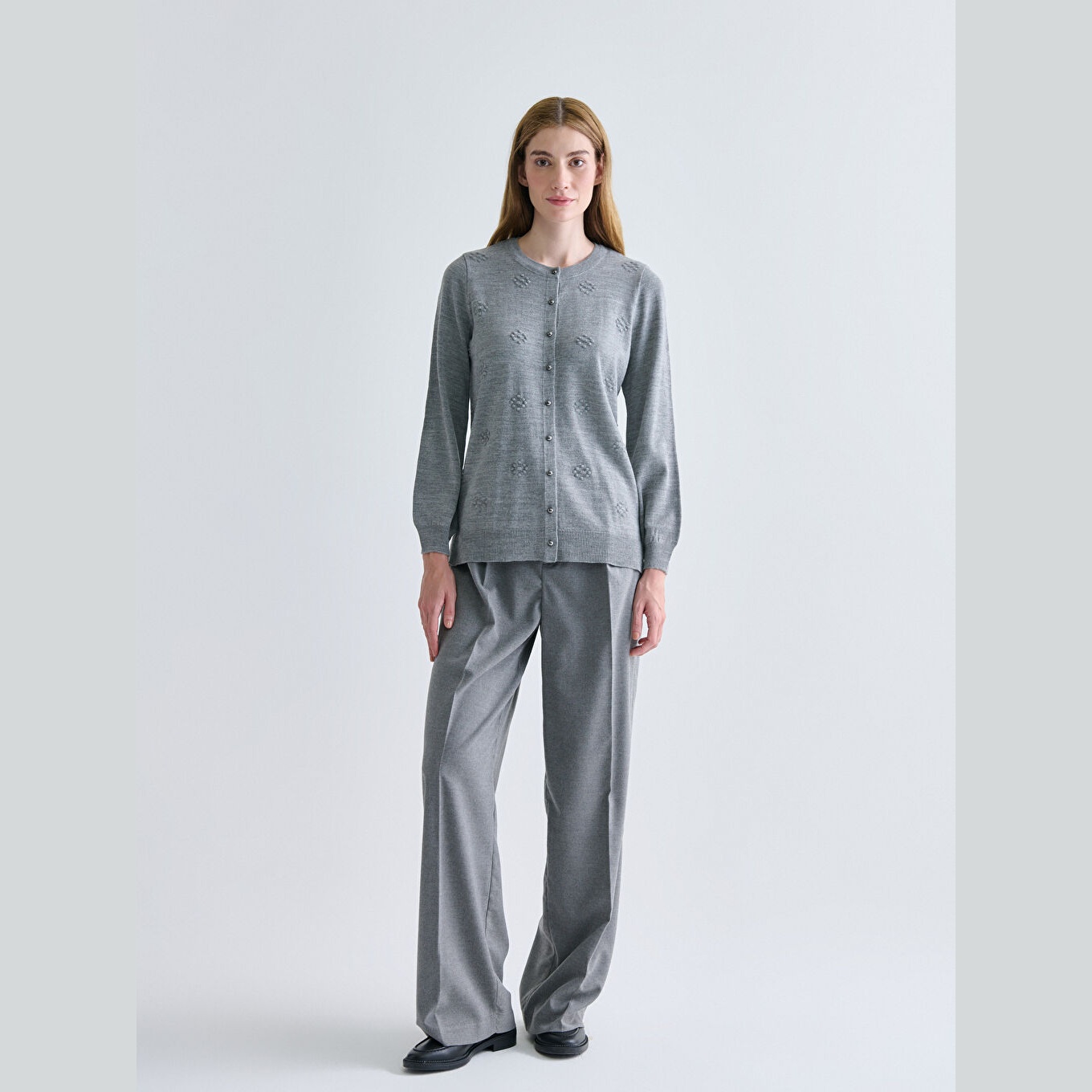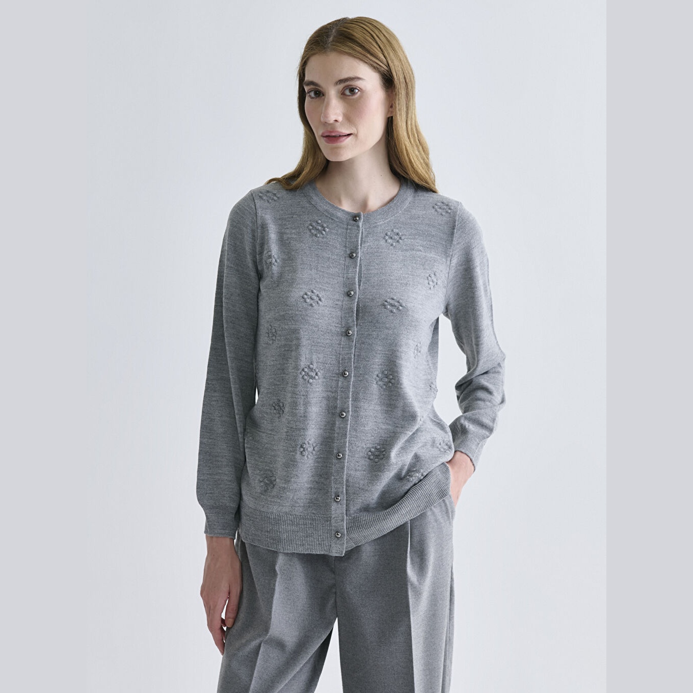 كارديغان نسائي بياقة دائرية بنقشة ذاتية من LCW Grace – رمادي (قصة قياسية، خامة تريكو متوسطة السماكة، تصميم مزخرف ذاتيًا، بزر أمامي)