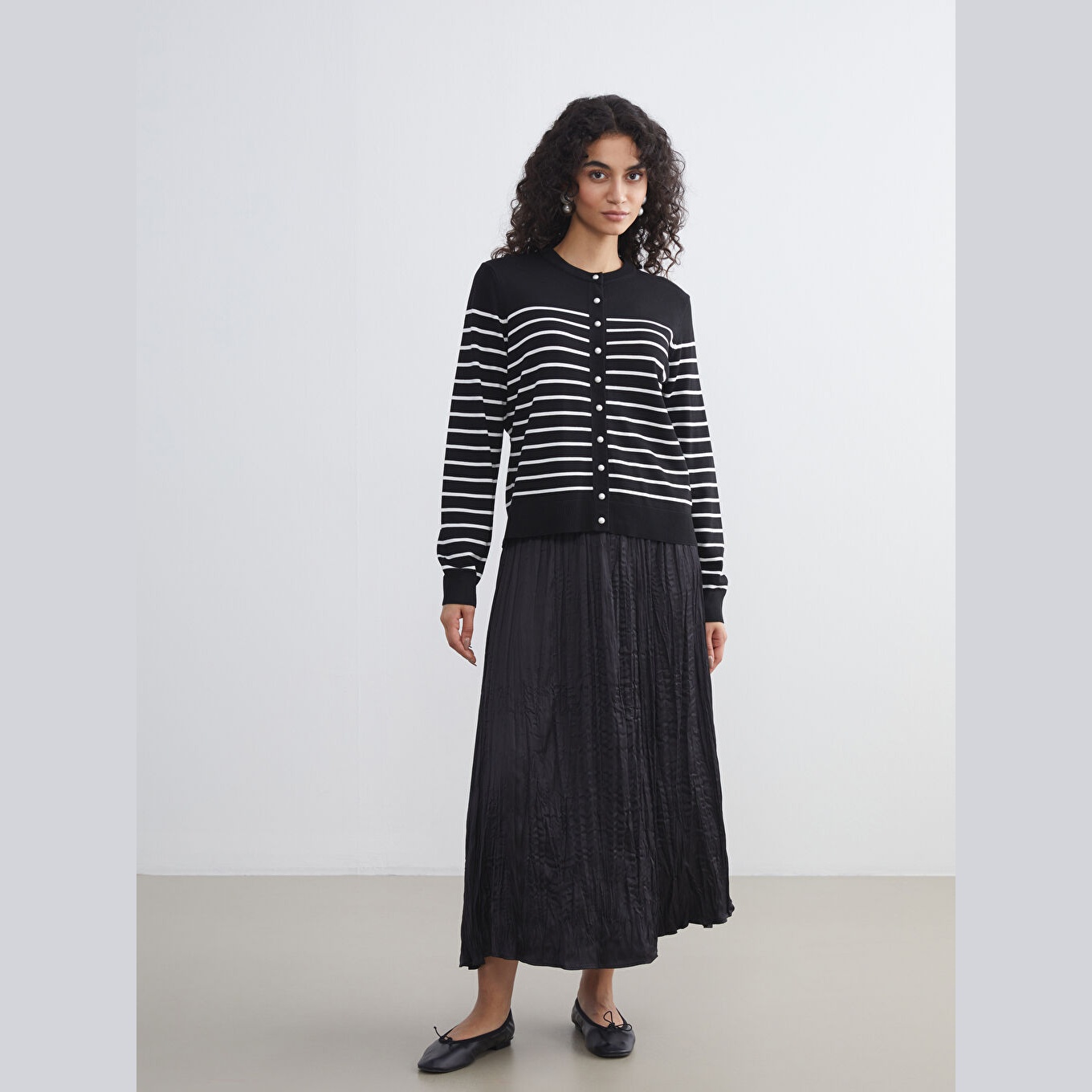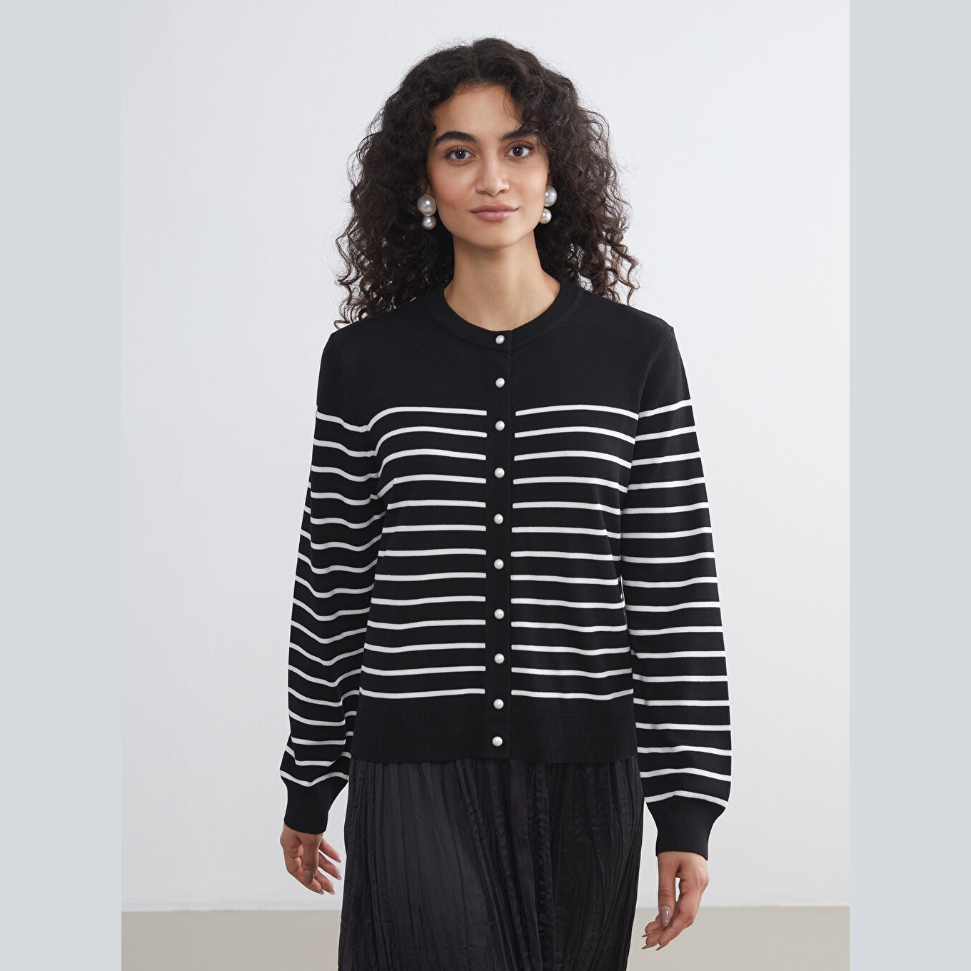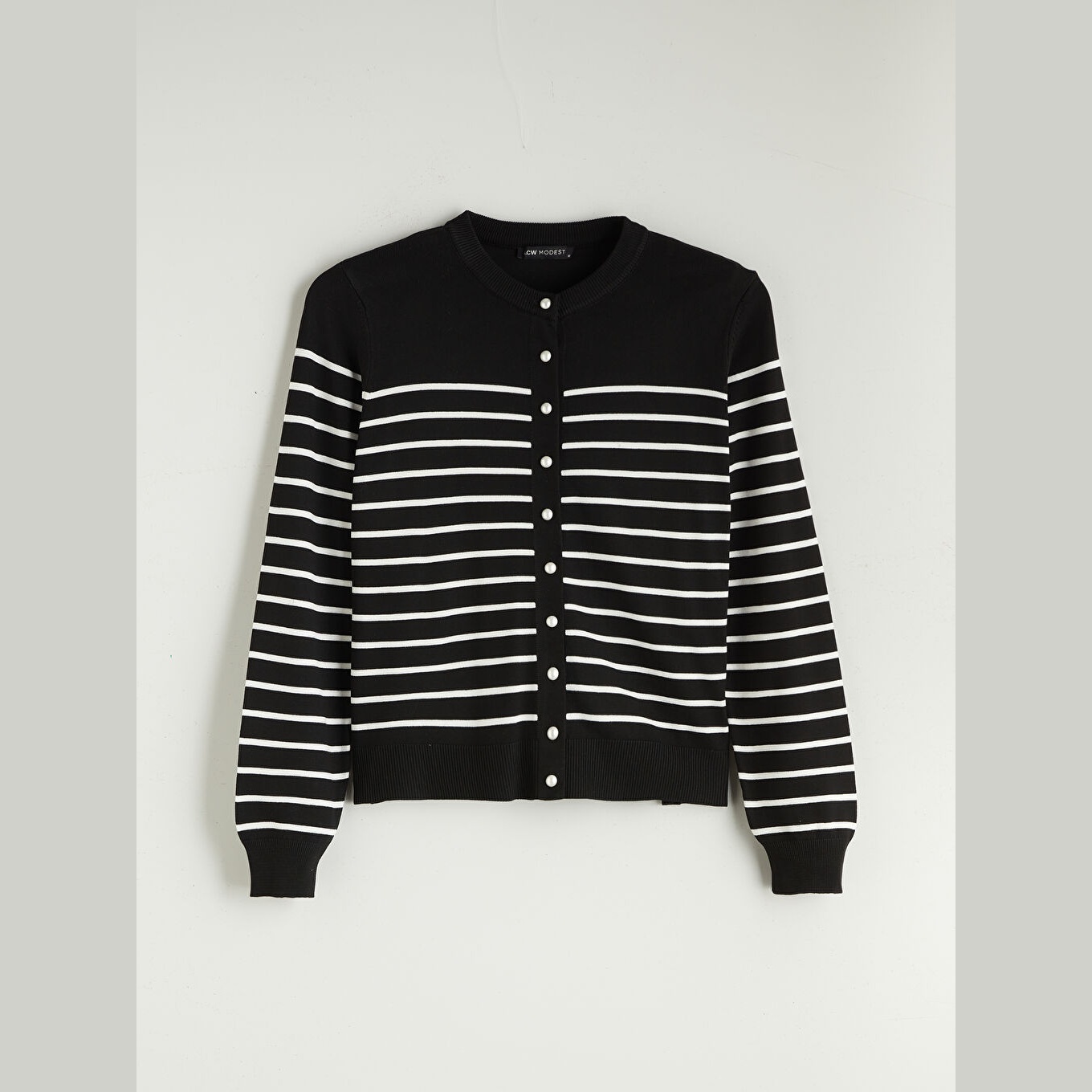 كارديغان نسائي بياقة دائرية بخطوط من LCW Modest – إكرو (قصة قياسية، خامة تريكو خفيفة، تصميم مخطط، بزر أمامي)