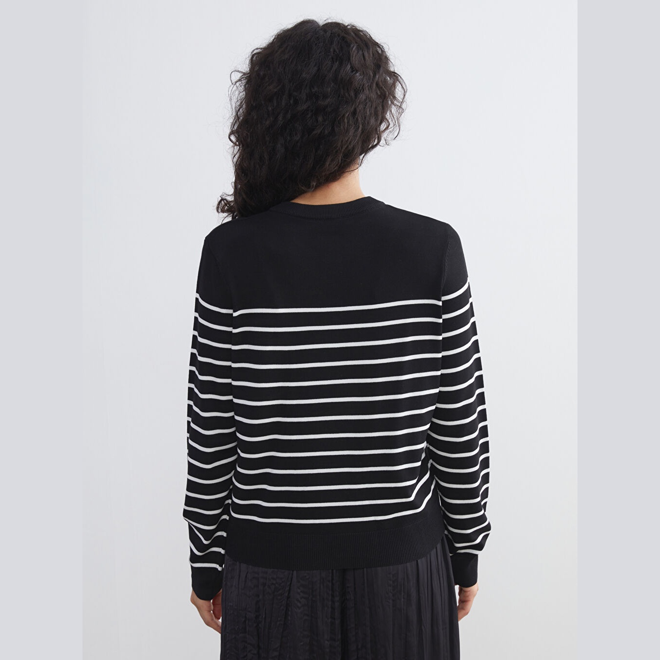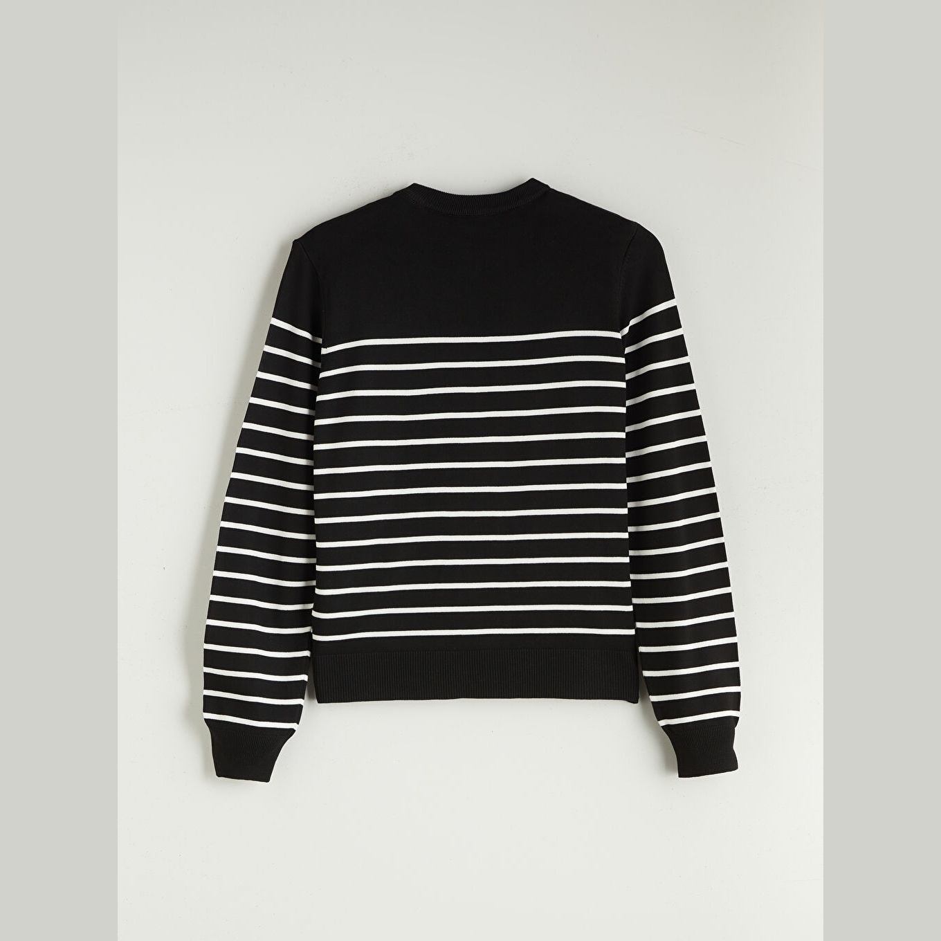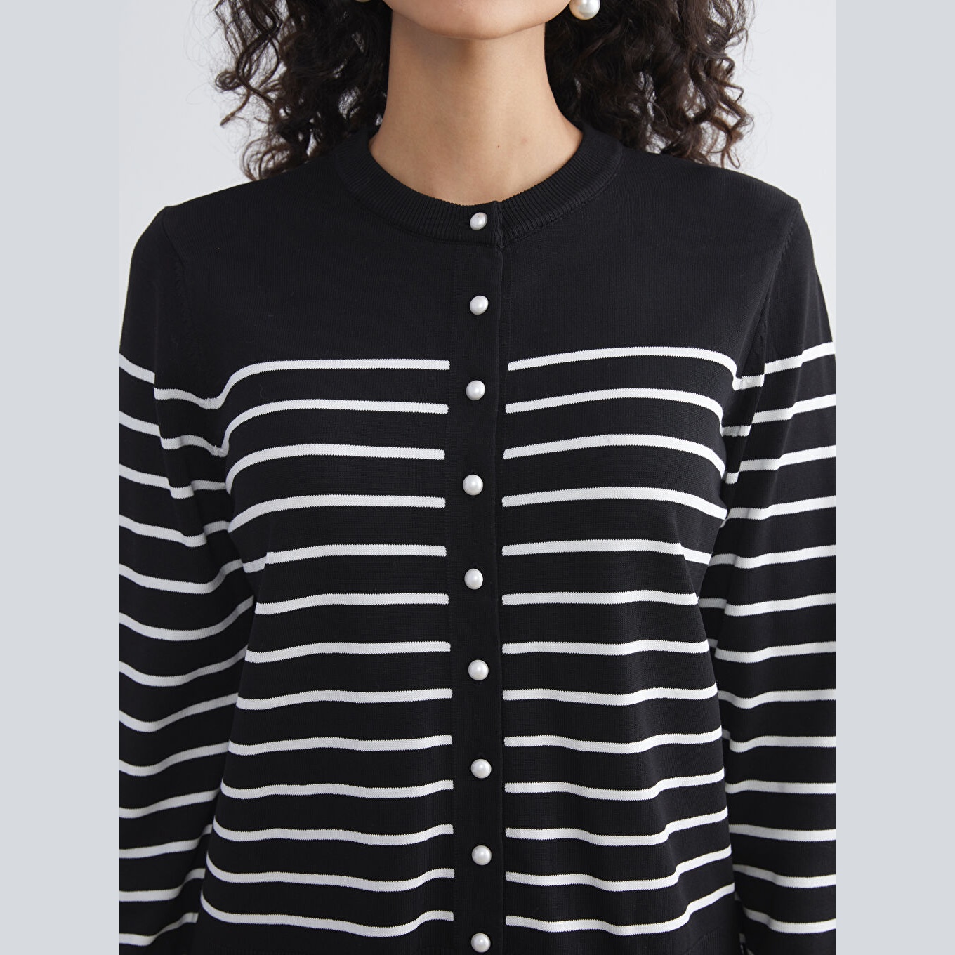 كارديغان نسائي بياقة دائرية بخطوط من LCW Modest – إكرو (قصة قياسية، خامة تريكو خفيفة، تصميم مخطط، بزر أمامي)