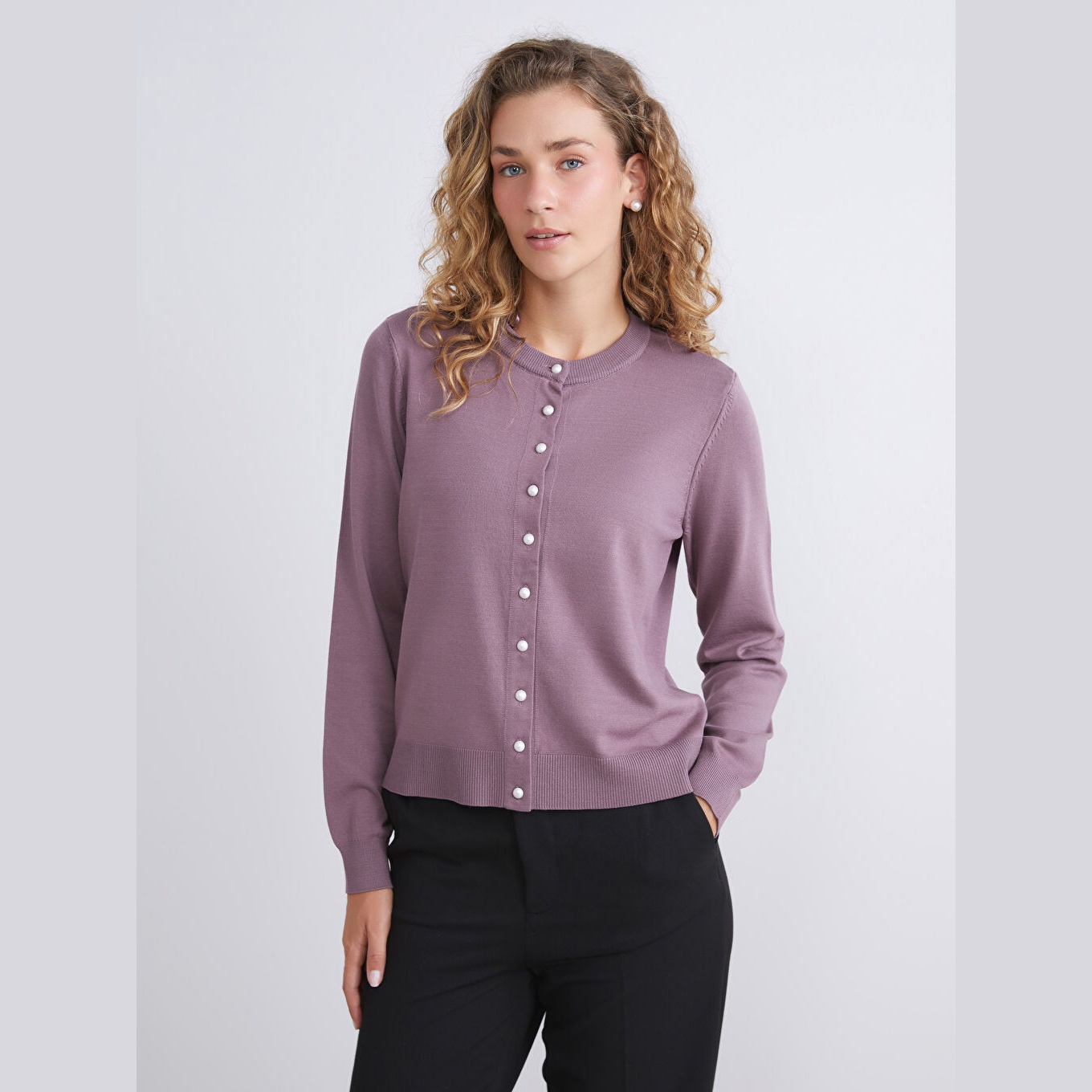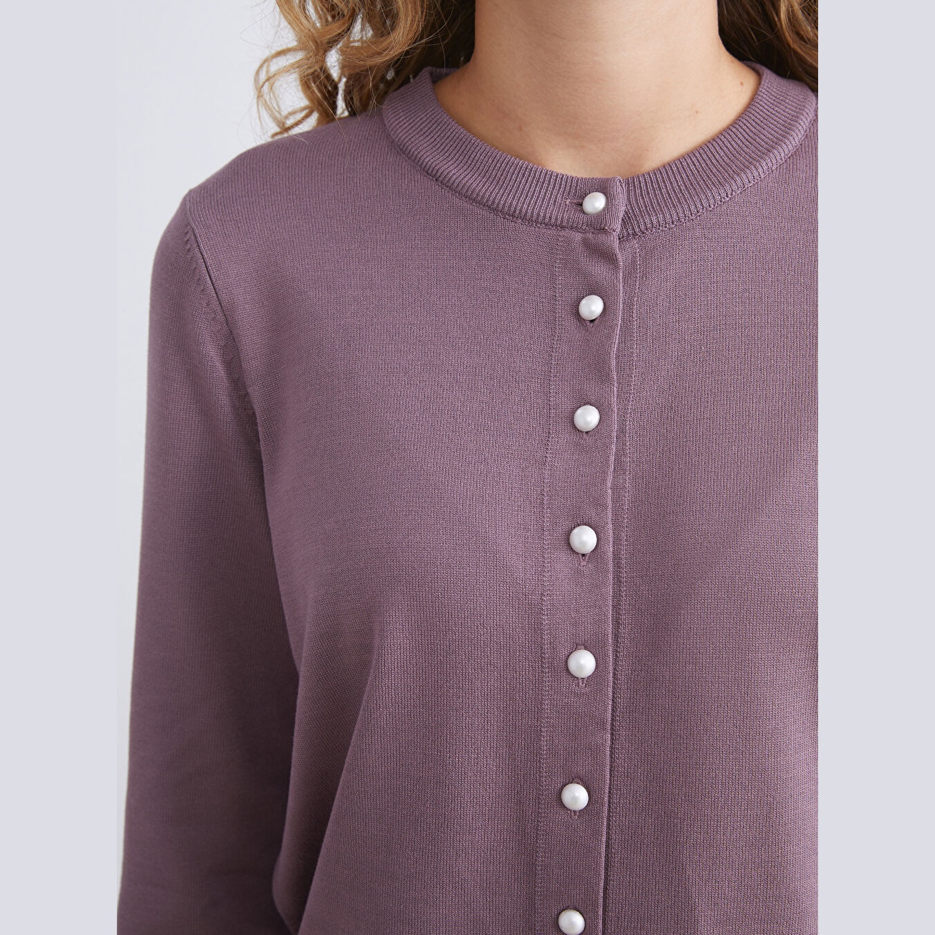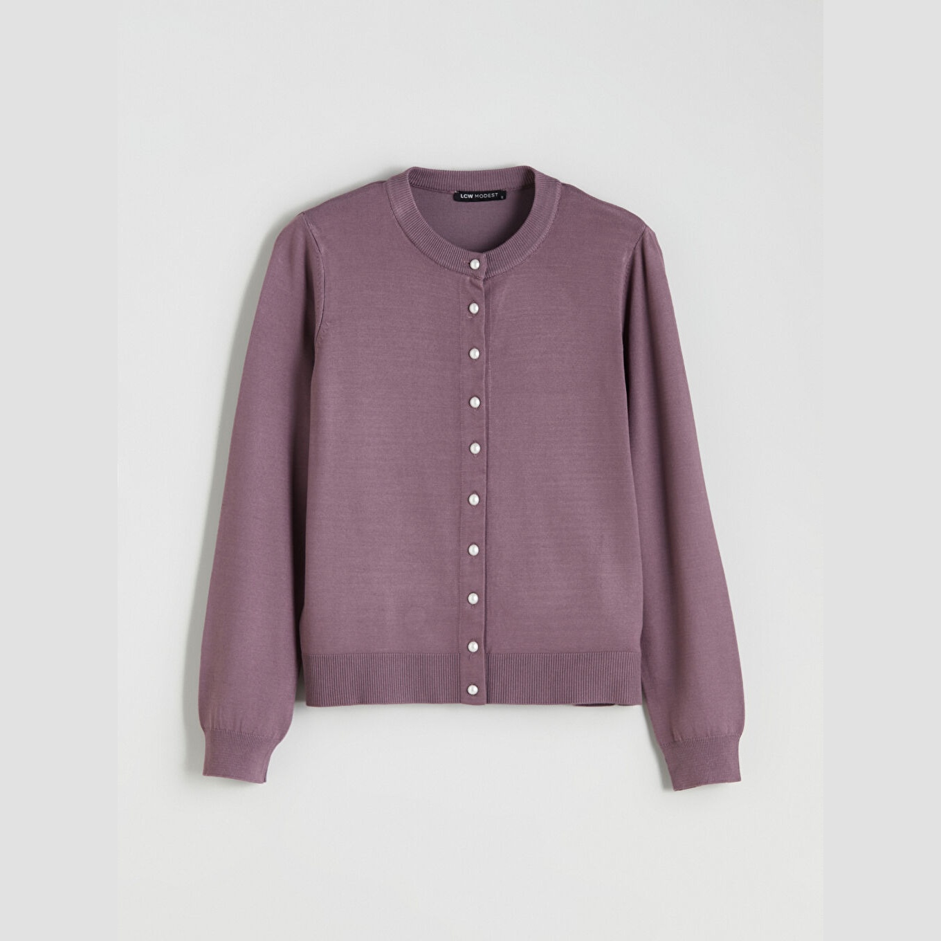 كارديغان نسائي بياقة دائرية قصير من LCW Modest – بنفسجي (قصة قياسية، خامة تريكو خفيفة، تصميم سادة، أزرار لؤلؤية، طول قصير)