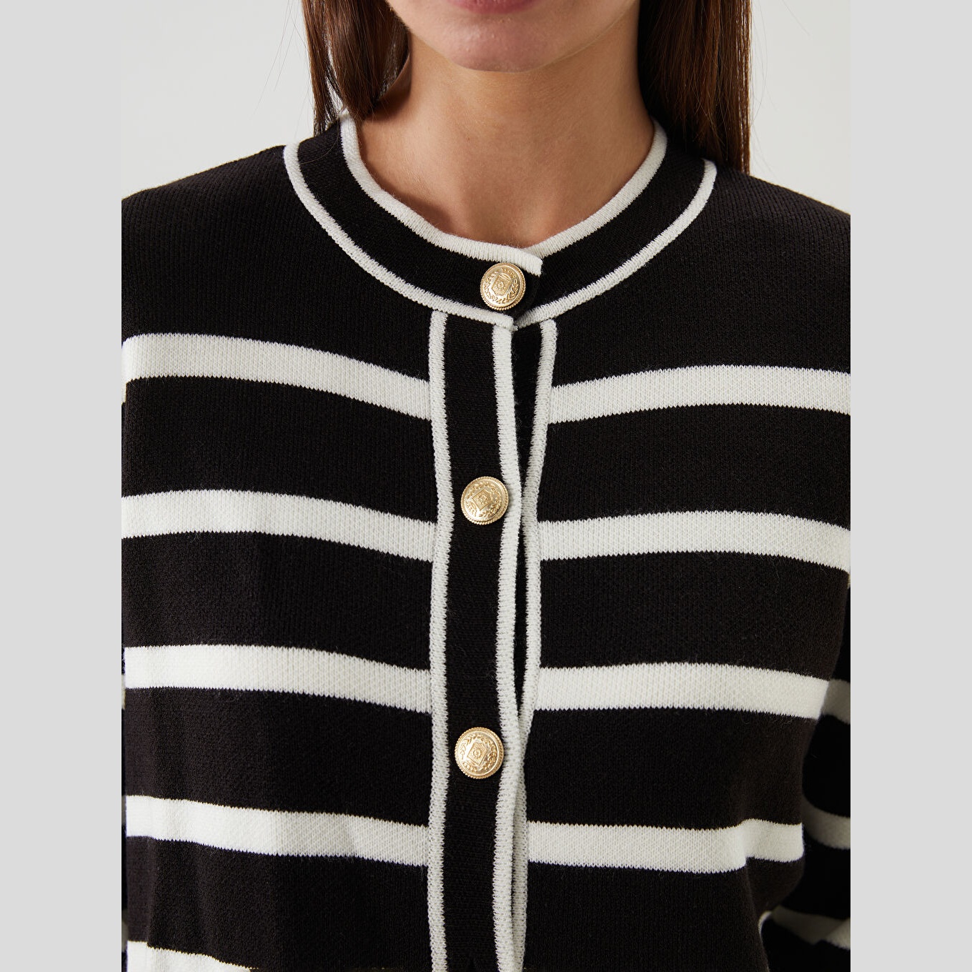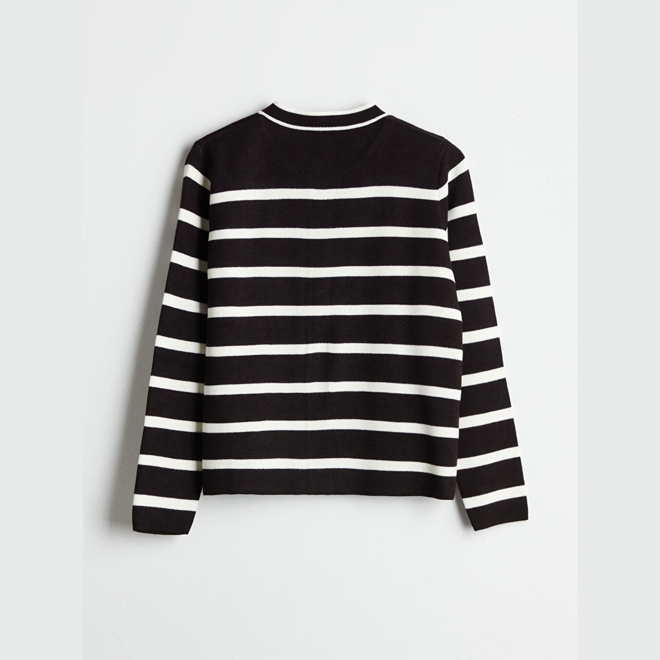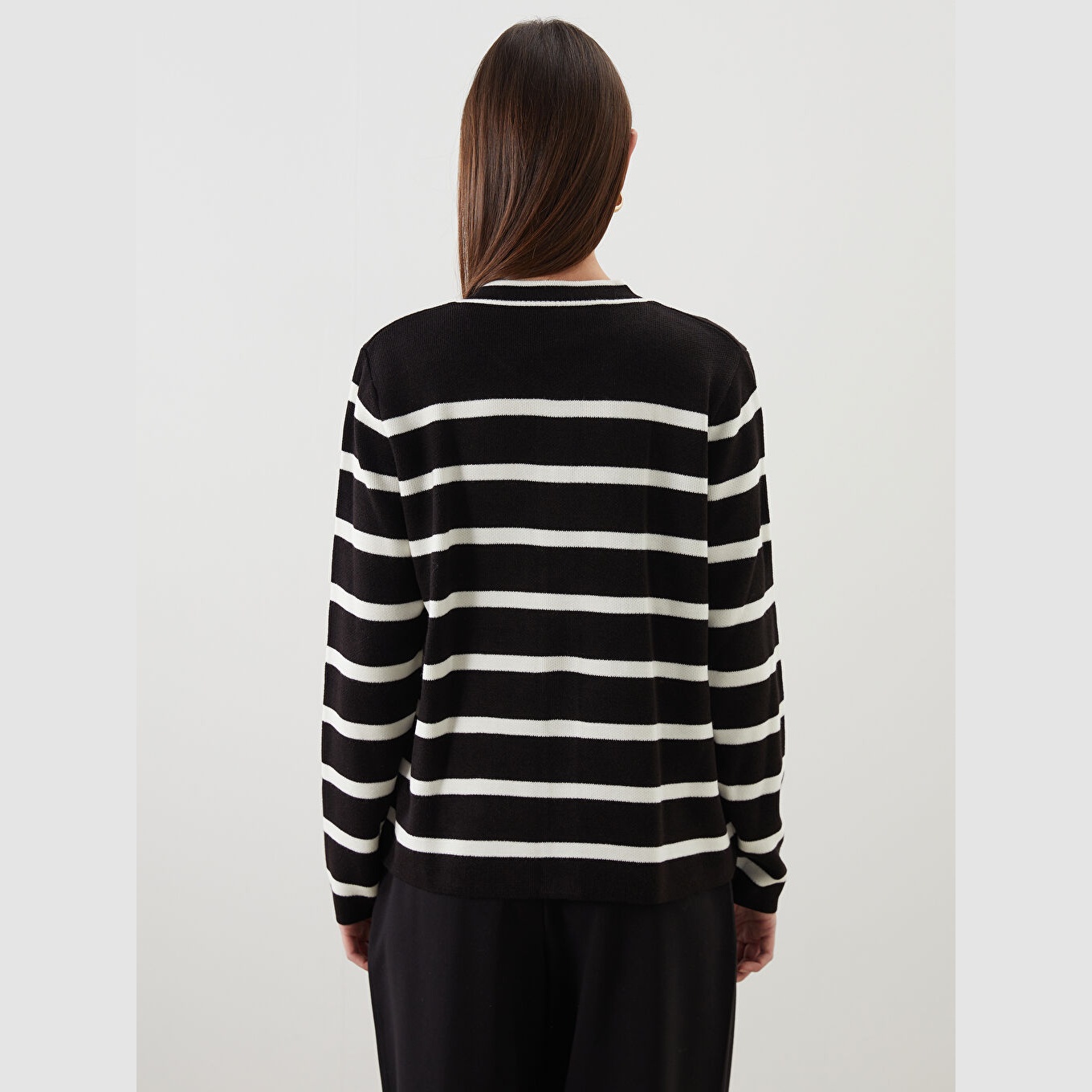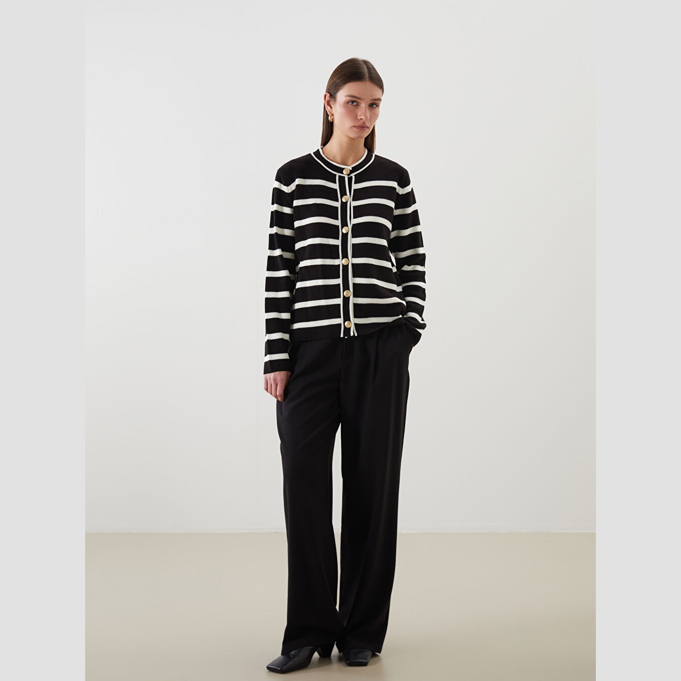 كارديغان نسائي بياقة دائرية بخطوط من LCW Modest – إكرو (قصة قياسية، خامة تريكو متوسطة السماكة، تصميم مخطط، بزر أمامي)