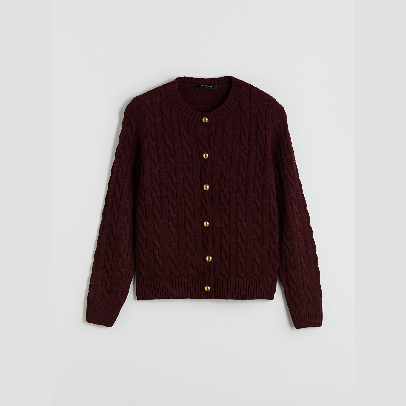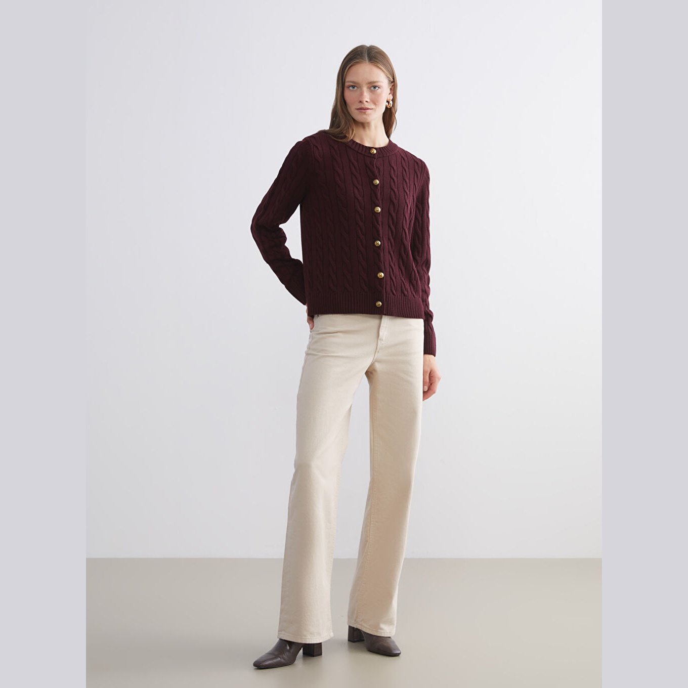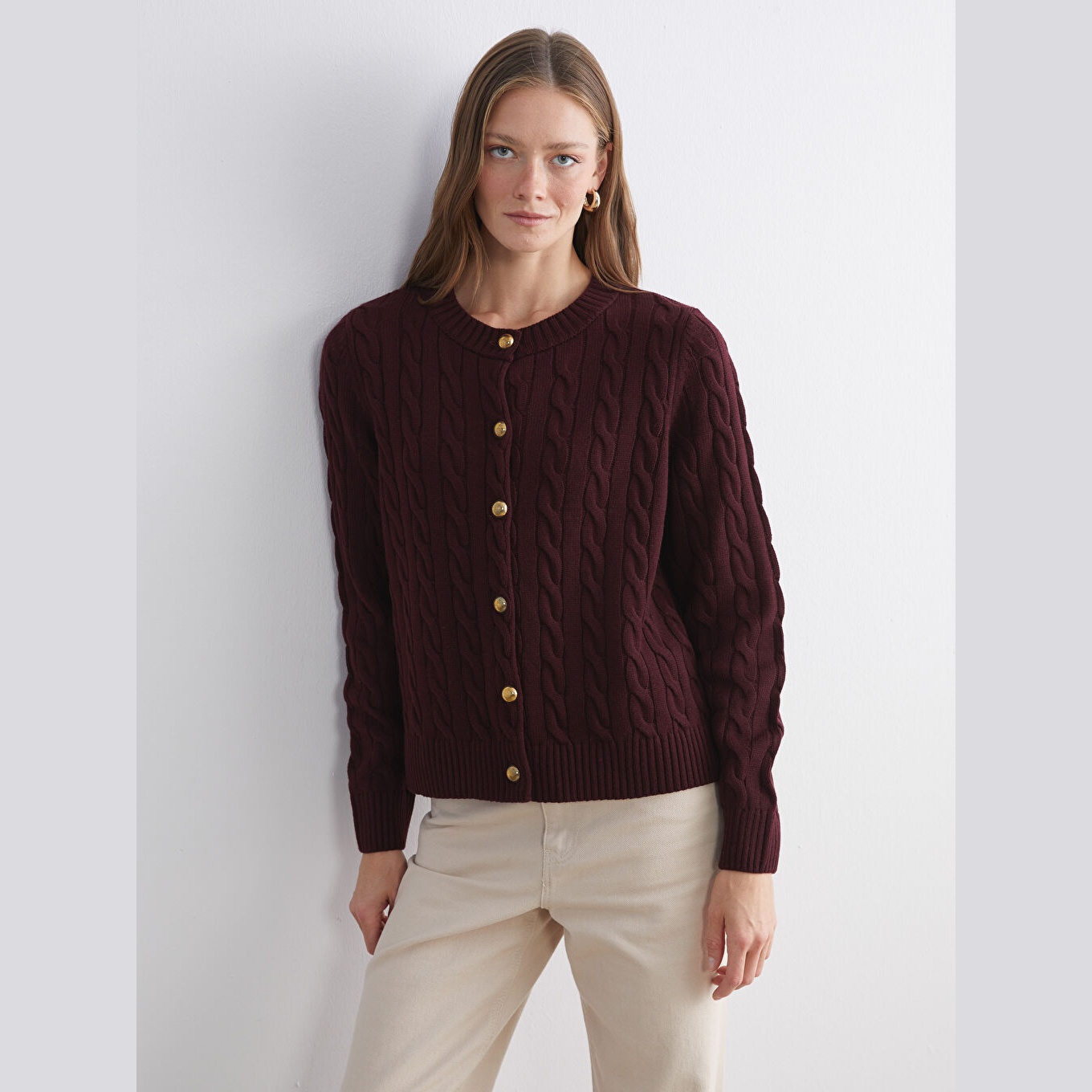 كارديغان نسائي بياقة دائرية بنقشة نسجية من LCW Comfort – بوردو (قصة قياسية، خامة تريكو متوسطة السماكة، تصميم نسجي، مناسب لفترة الحمل وما بعدها)