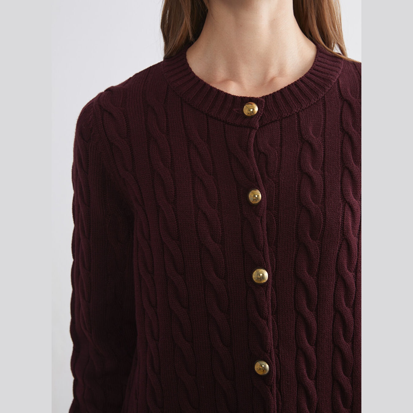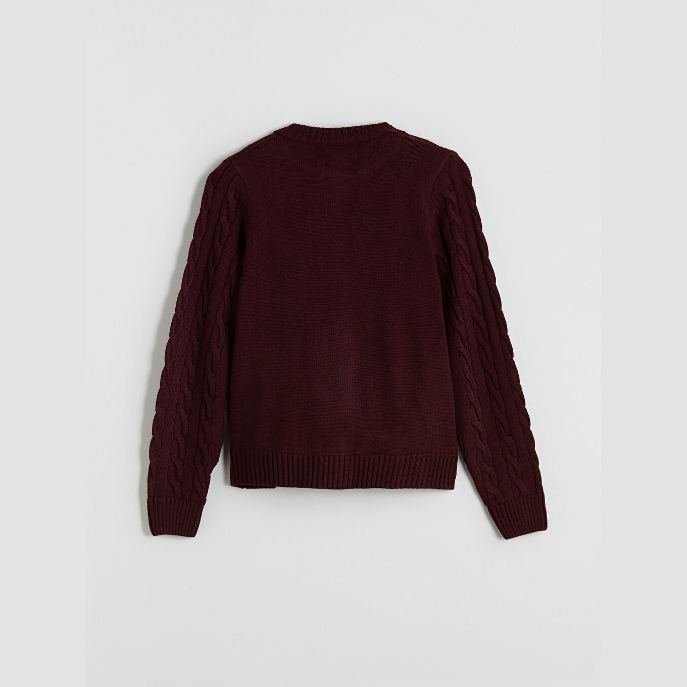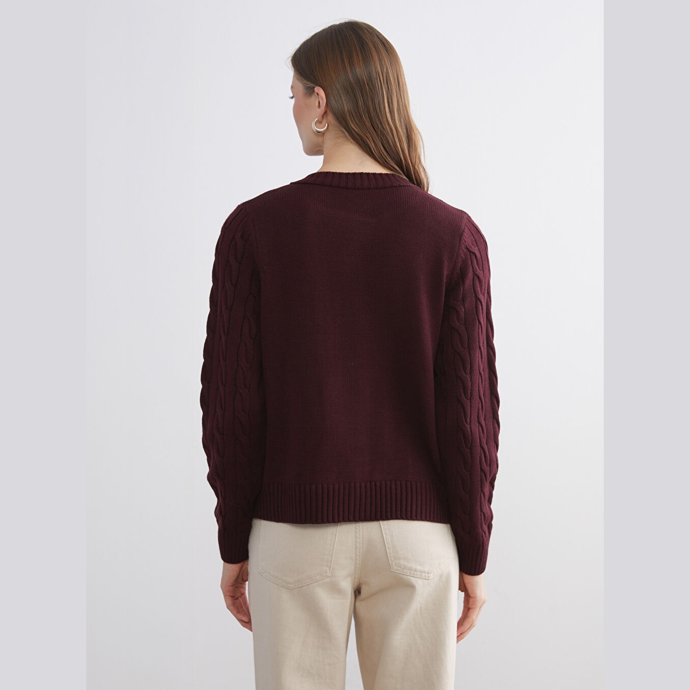 كارديغان نسائي بياقة دائرية بنقشة نسجية من LCW Comfort – بوردو (قصة قياسية، خامة تريكو متوسطة السماكة، تصميم نسجي، مناسب لفترة الحمل وما بعدها)