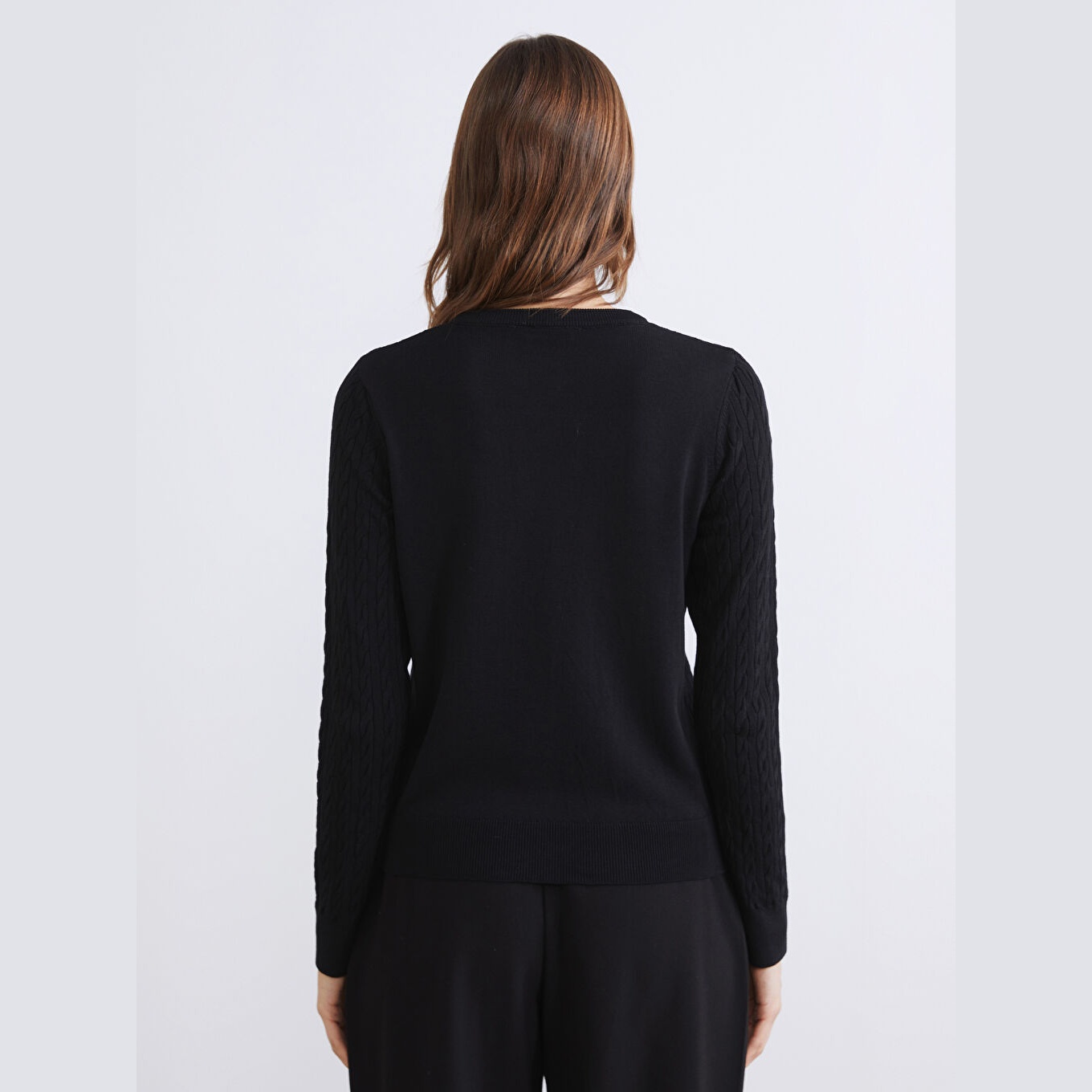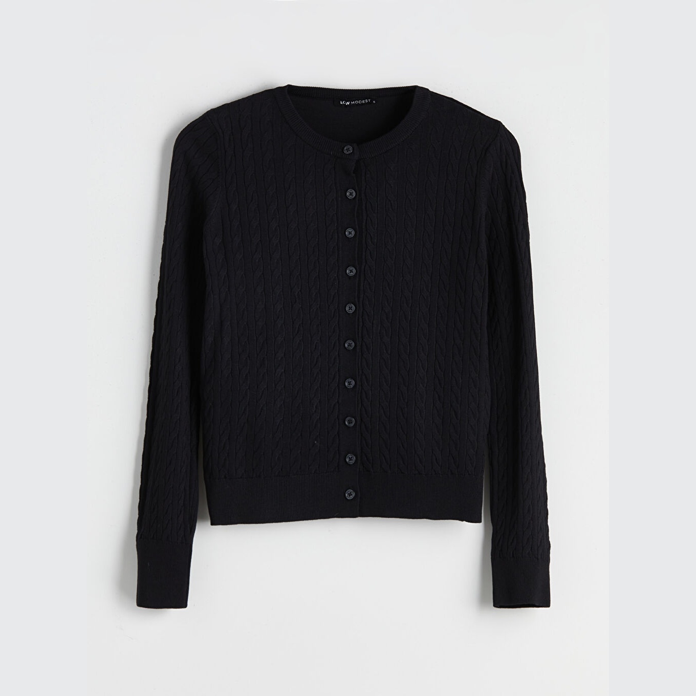 كارديغان نسائي بياقة دائرية بنقشة نسجية من LCW Modest – أسود (قصة قياسية، خامة تريكو خفيفة، تصميم نسجي، أزرار أمامية، مناسب للإطلالات المحتشمة)