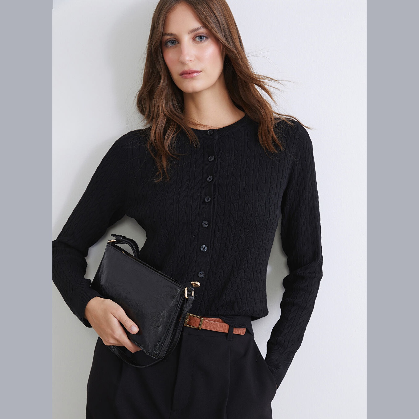كارديغان أنيق من مجموعة LCW Modest Tesettür Giyim بلون أسود كلاسيكي، مصمم بياقة دائرية (Bisiklet Yaka)، أكمام طويلة، قصة Standart & Regular تمنحك مظهرًا مريحًا ومتوازنًا، تصميم Kendinden Desenli بنقشة نسجية تضيف لمسة فاخرة، خامة Triko خفيفة بتركيبة تحتوي على %73 فيسكوز و%27 بوليستر، مزود بأزرار أمامية للإغلاق، بطول يُقاس من الكتف، مثالي للتنسيق مع بناطيل خصر عالي أو فساتين لإطلالة محتشمة وعصرية.