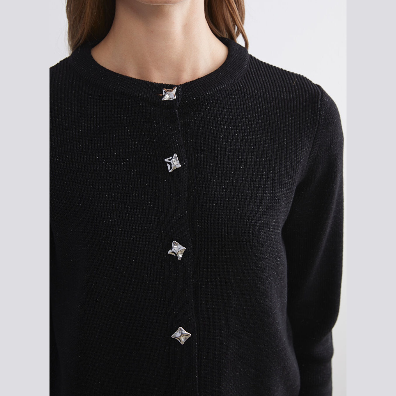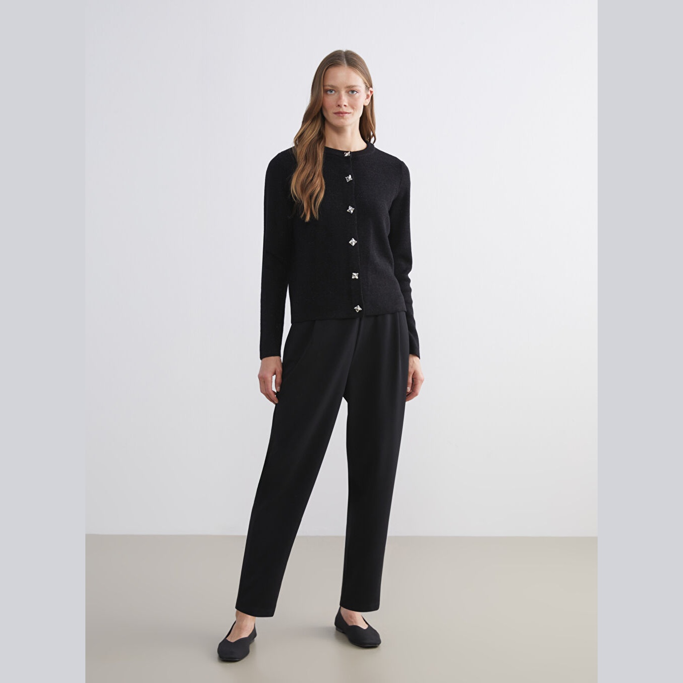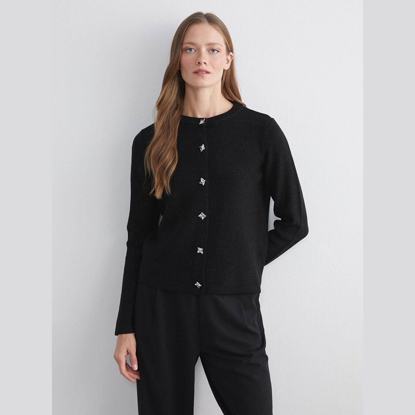 كارديغان نسائي بياقة دائرية من LCW Comfort – أسود (قصة قياسية، خامة تريكو متوسطة السماكة، تصميم سادة، لمسة لامعة، مناسب لفترة الحمل وما بعدها)