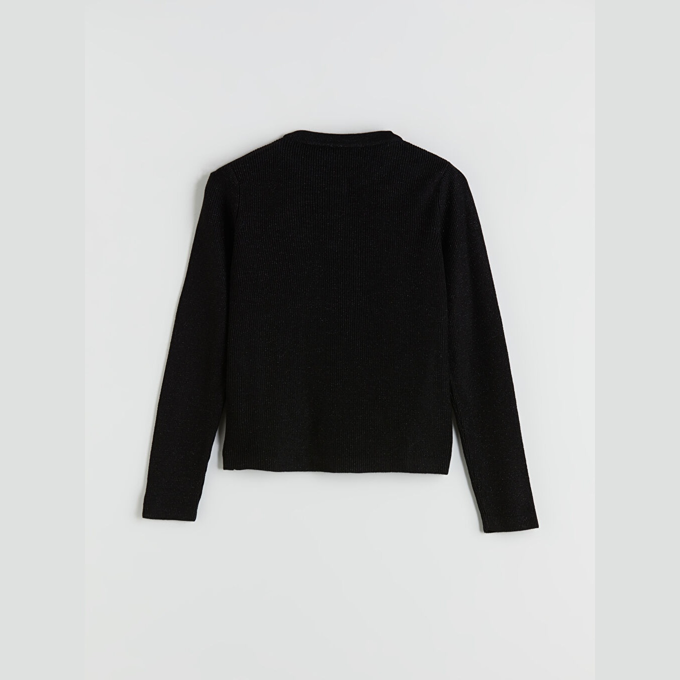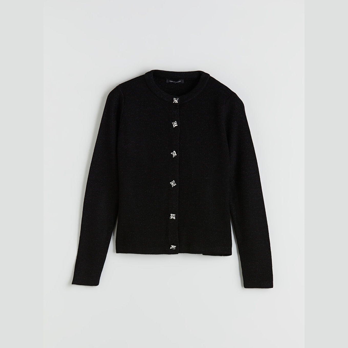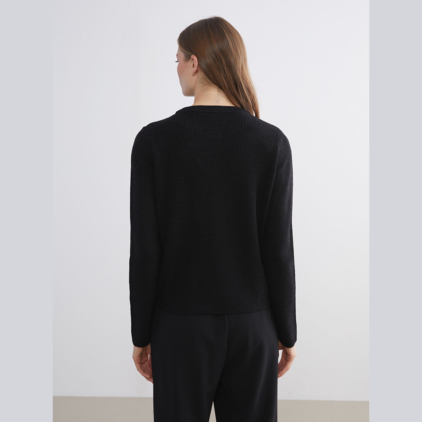 كارديغان نسائي بياقة دائرية من LCW Comfort – أسود (قصة قياسية، خامة تريكو متوسطة السماكة، تصميم سادة، لمسة لامعة، مناسب لفترة الحمل وما بعدها)
