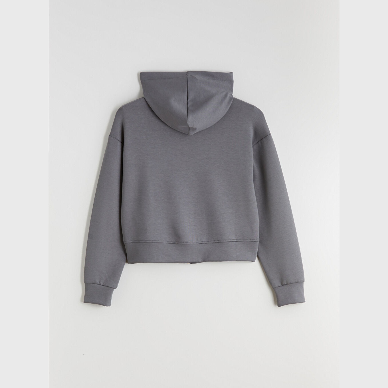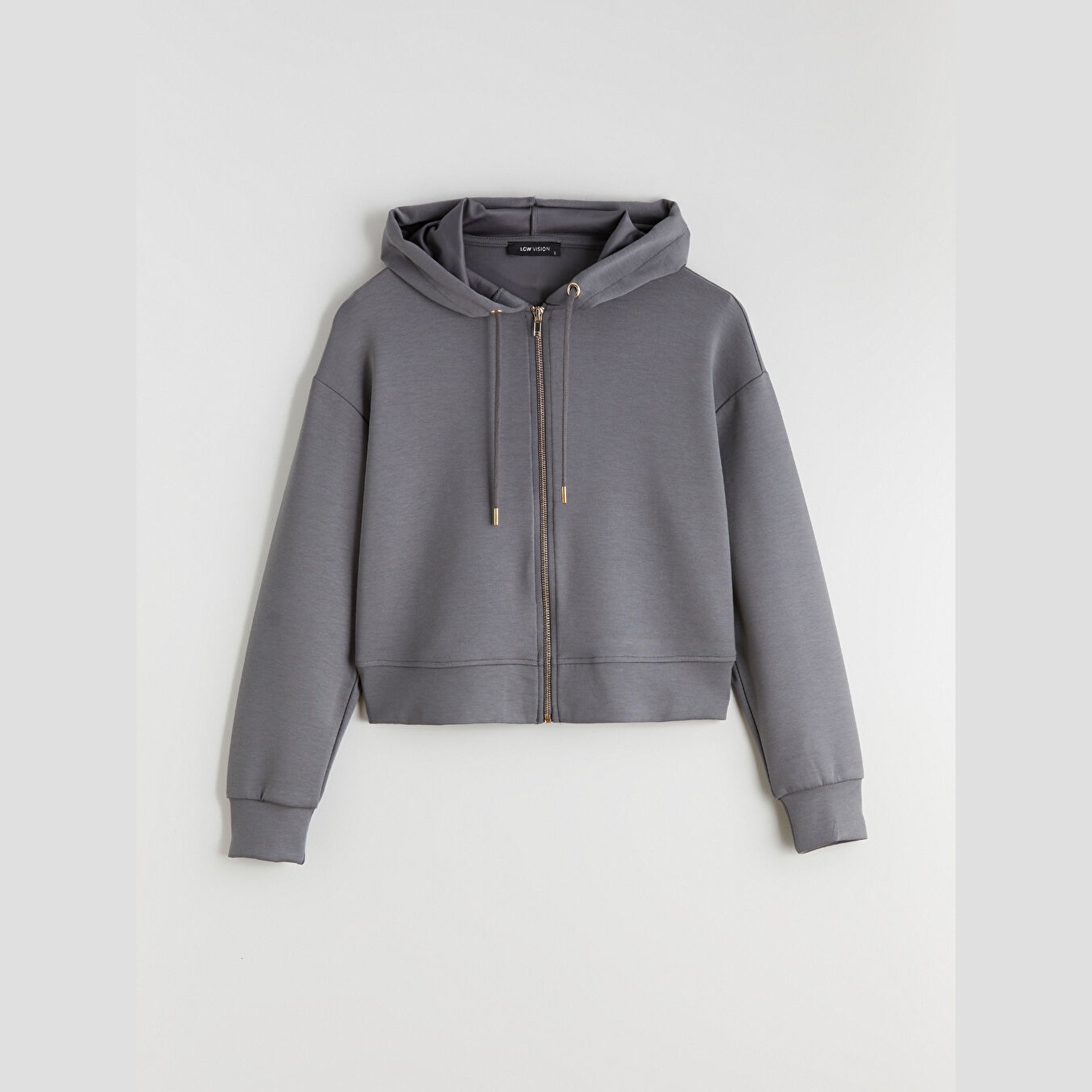 سويت شيرت نسائي بسحاب وغطاء رأس من LCW Vision – رمادي (قصة واسعة، خامة إنترلوك خفيفة، تصميم سادة، سحاب أمامي، غطاء رأس عملي)