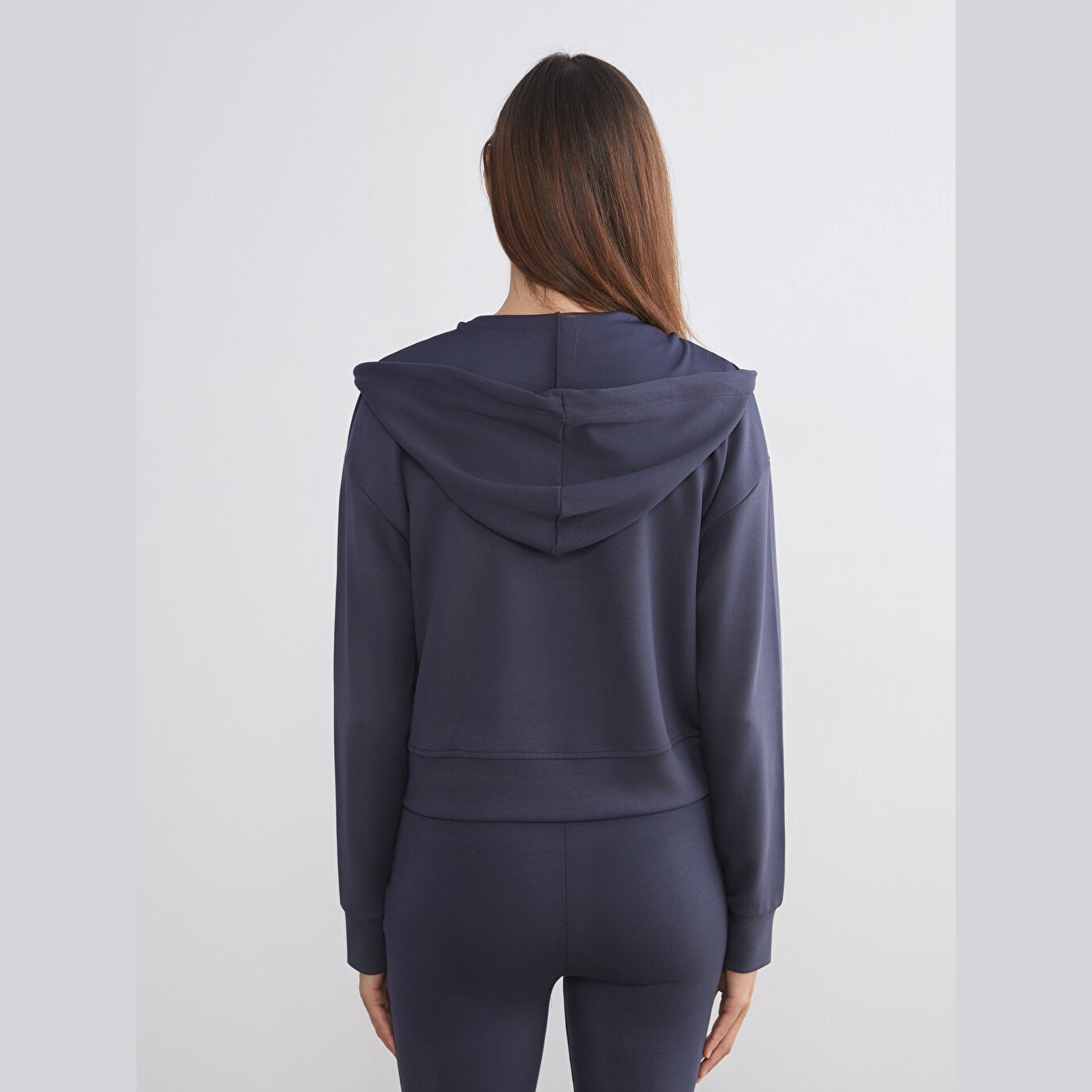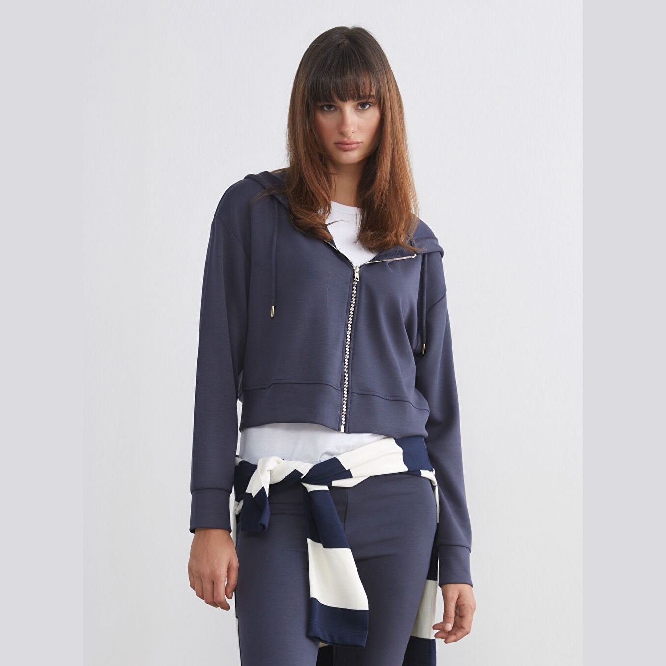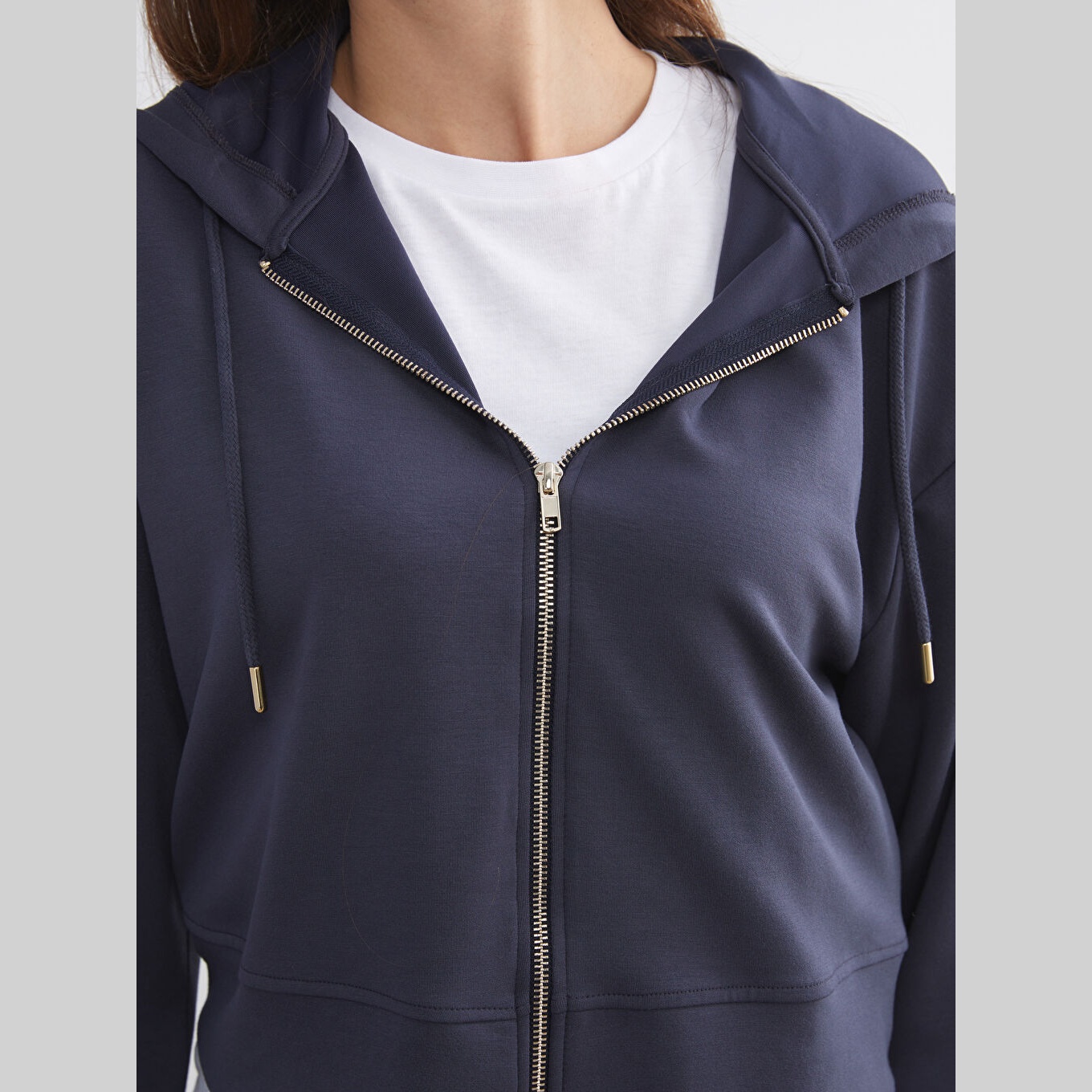 سويت شيرت نسائي بسحاب وغطاء رأس من LCW Vision – كحلي (قصة واسعة، خامة إنترلوك خفيفة، تصميم سادة، سحاب أمامي، غطاء رأس عملي)