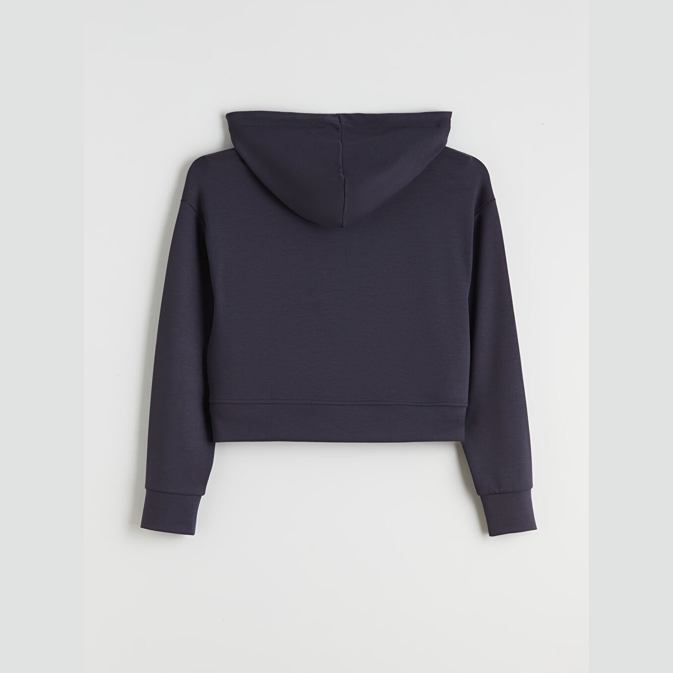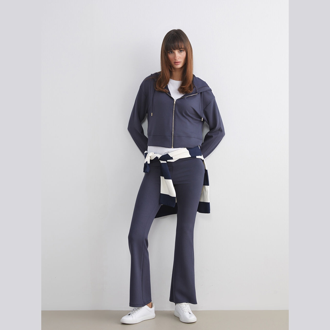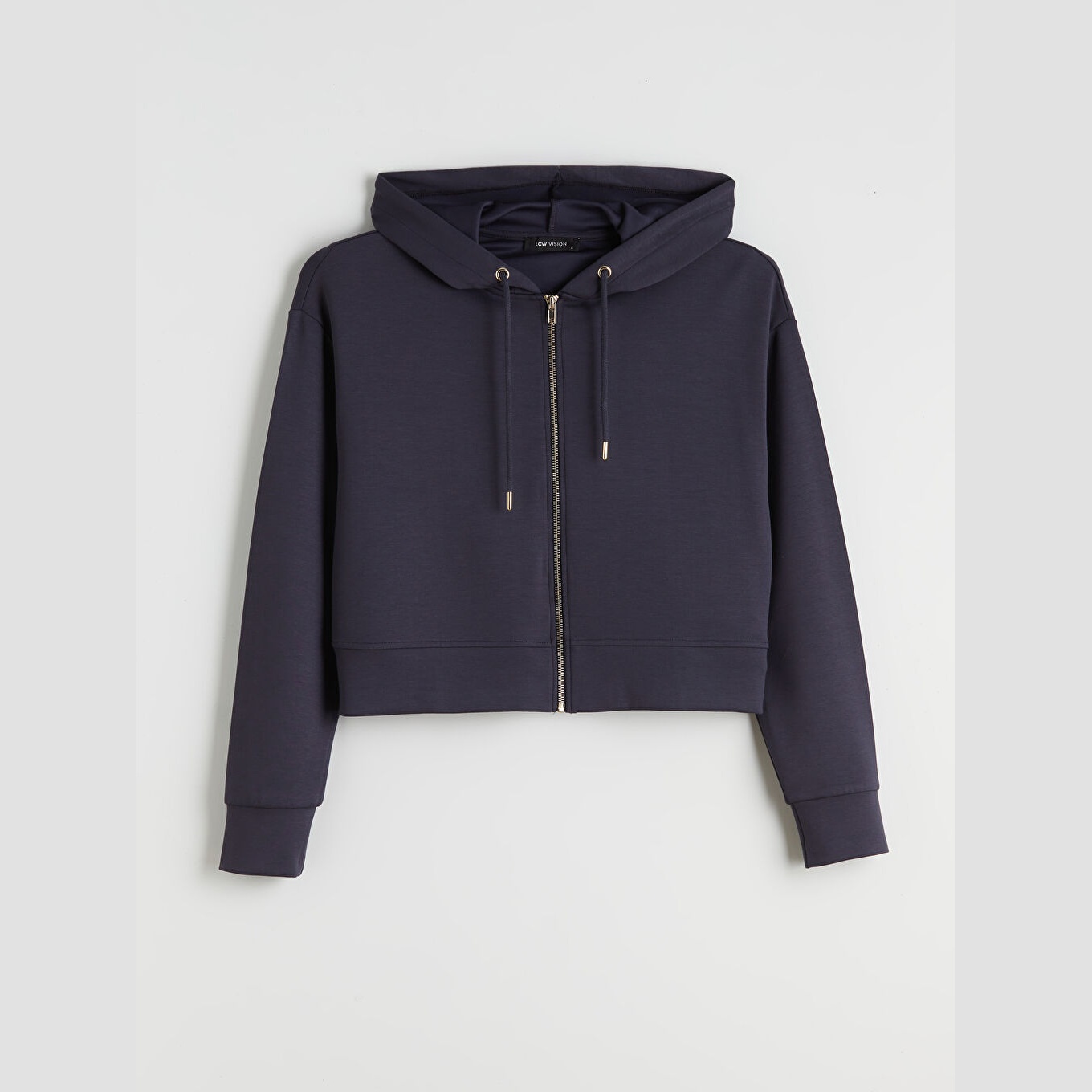 سويت شيرت نسائي بسحاب وغطاء رأس من LCW Vision – كحلي (قصة واسعة، خامة إنترلوك خفيفة، تصميم سادة، سحاب أمامي، غطاء رأس عملي)