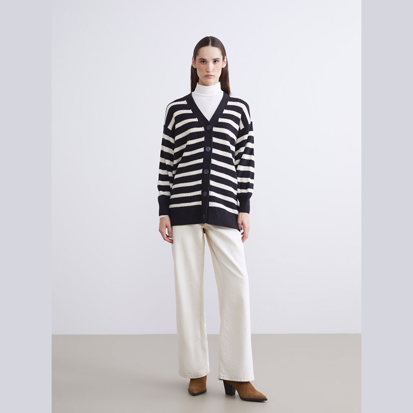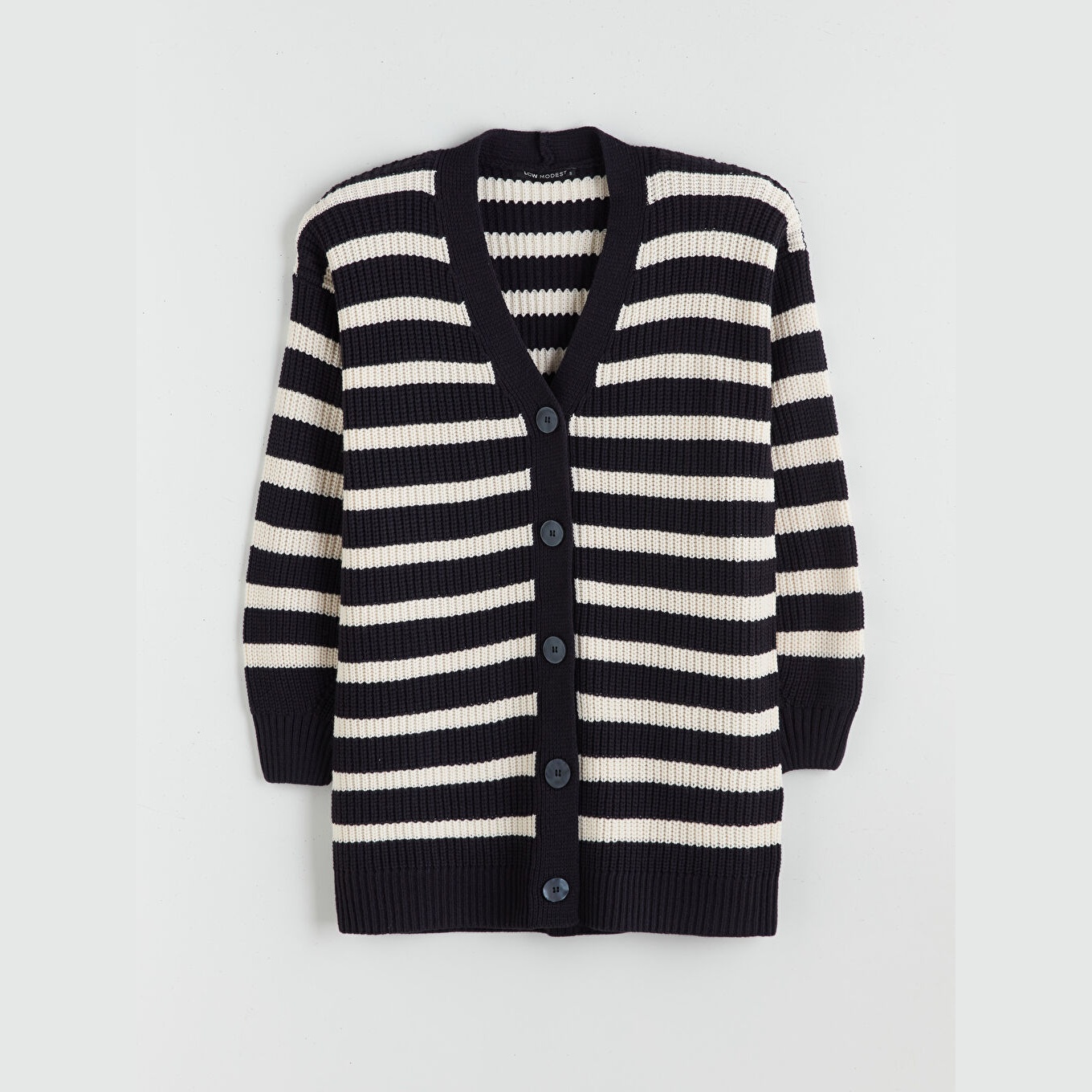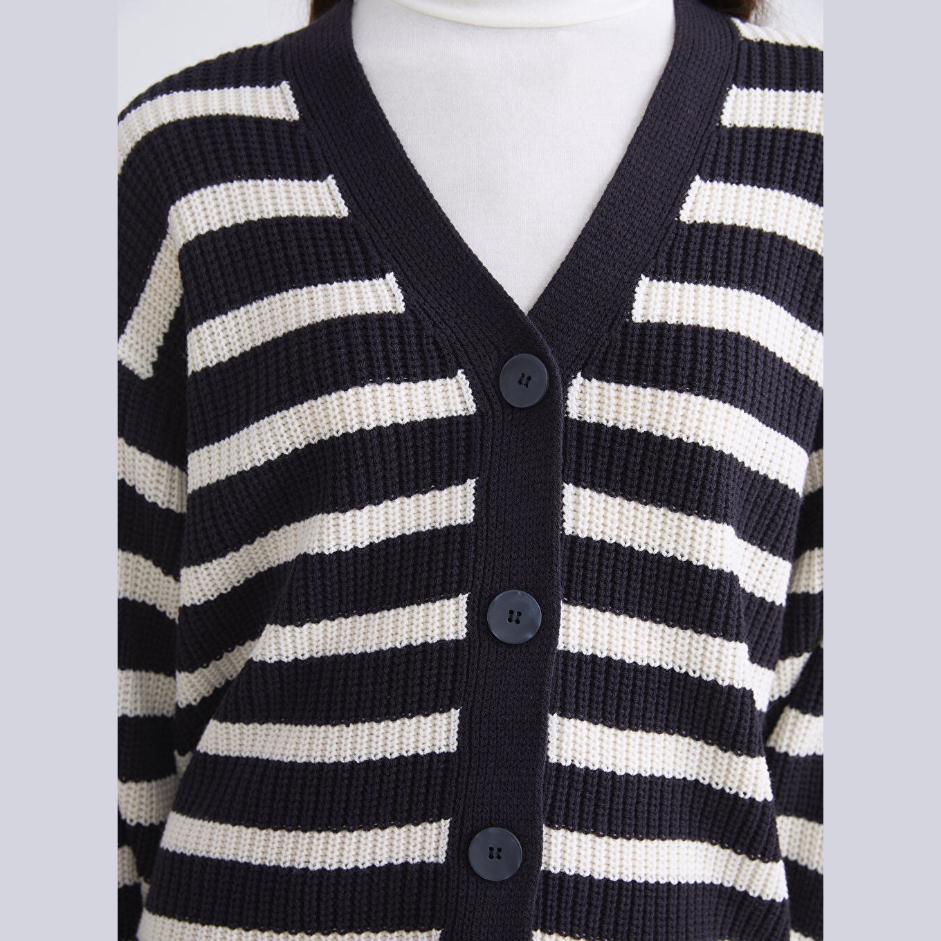 كارديغان نسائي بياقة V مخطط من LCW Modest – كحلي (قصة واسعة، خامة تريكو متوسطة السماكة، تصميم مخطط، أزرار أمامية)