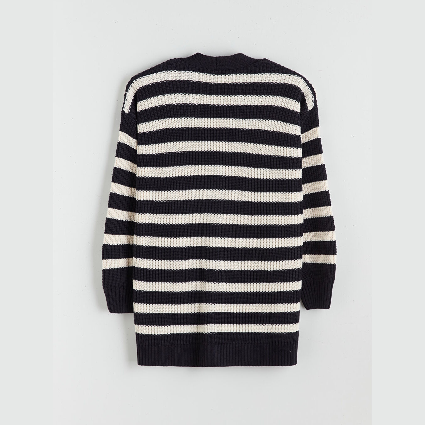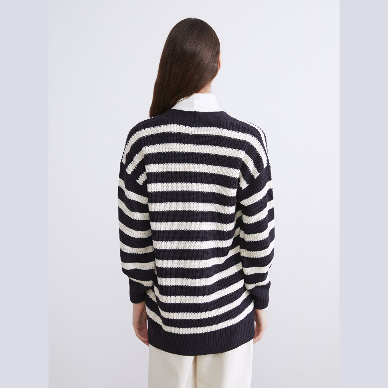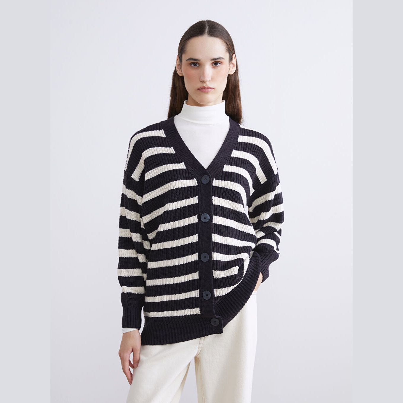 كارديغان نسائي بياقة V مخطط من LCW Modest – كحلي (قصة واسعة، خامة تريكو متوسطة السماكة، تصميم مخطط، أزرار أمامية)