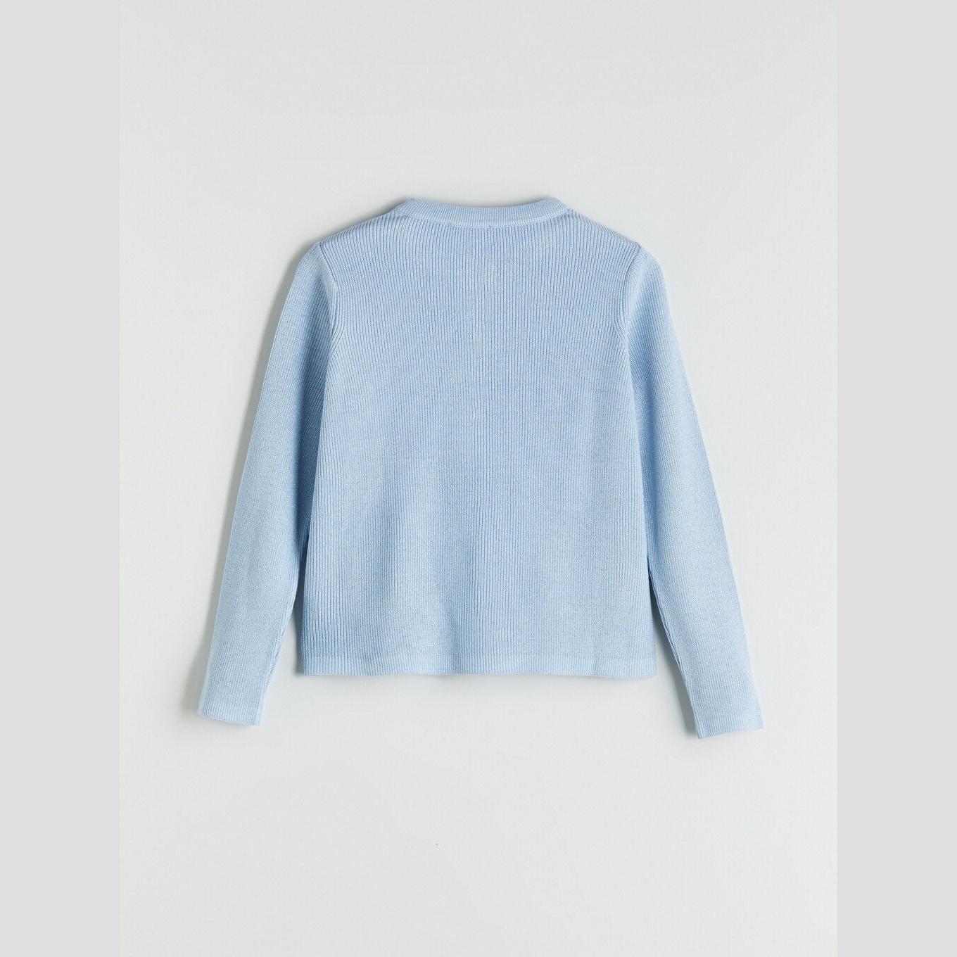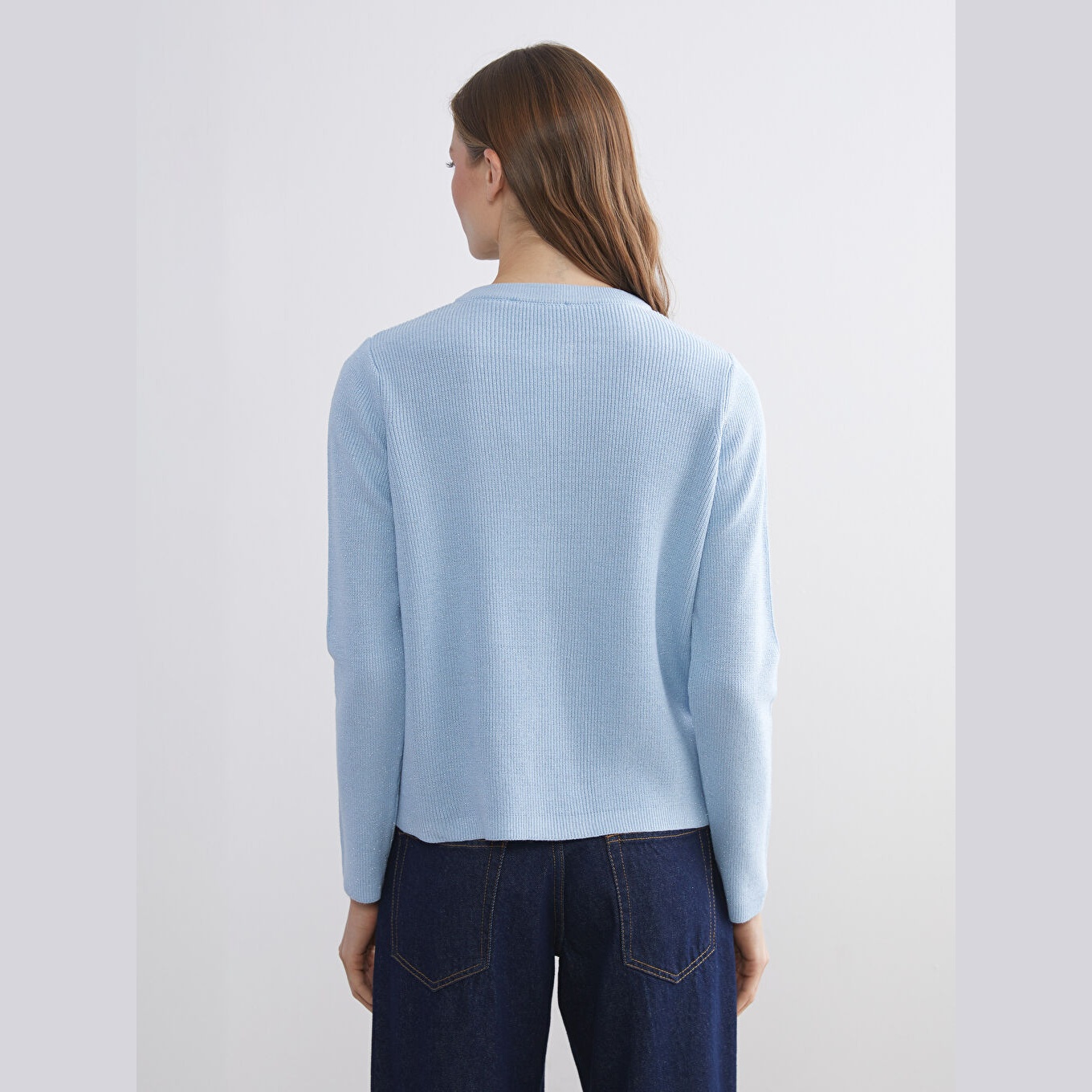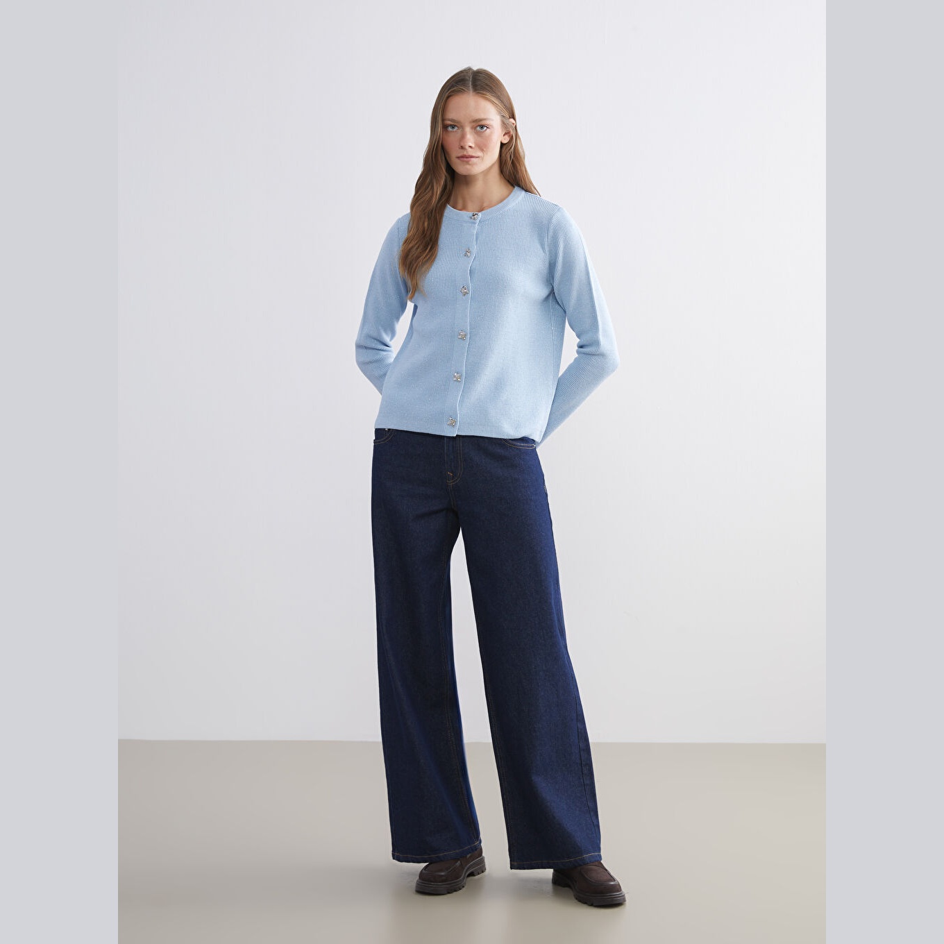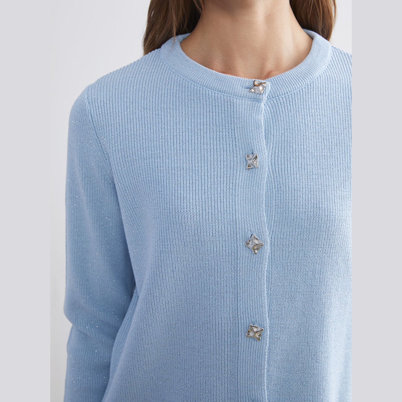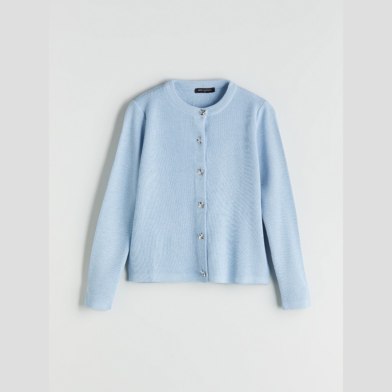 كارديغان نسائي بياقة دائرية من LCW Comfort – أزرق فاتح (قصة قياسية، خامة تريكو متوسطة السماكة، تصميم سادة، أزرار أمامية، مناسب لفترة الحمل وما بعدها)