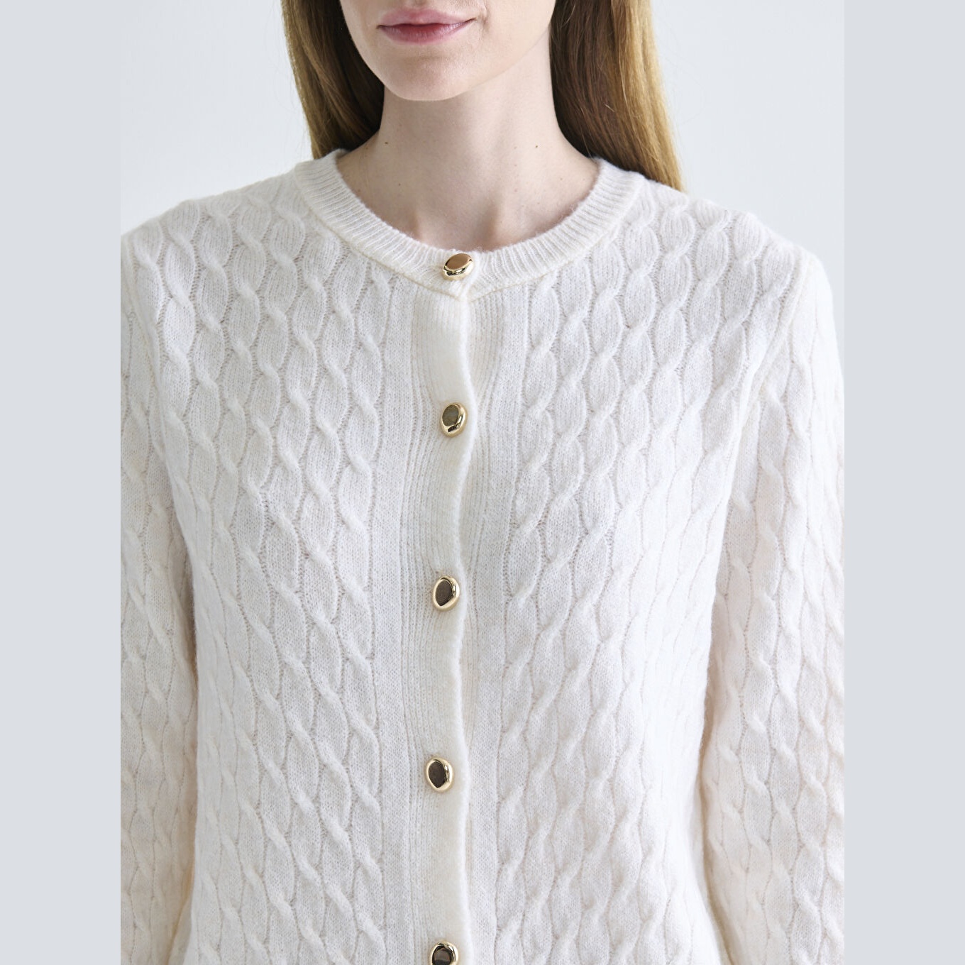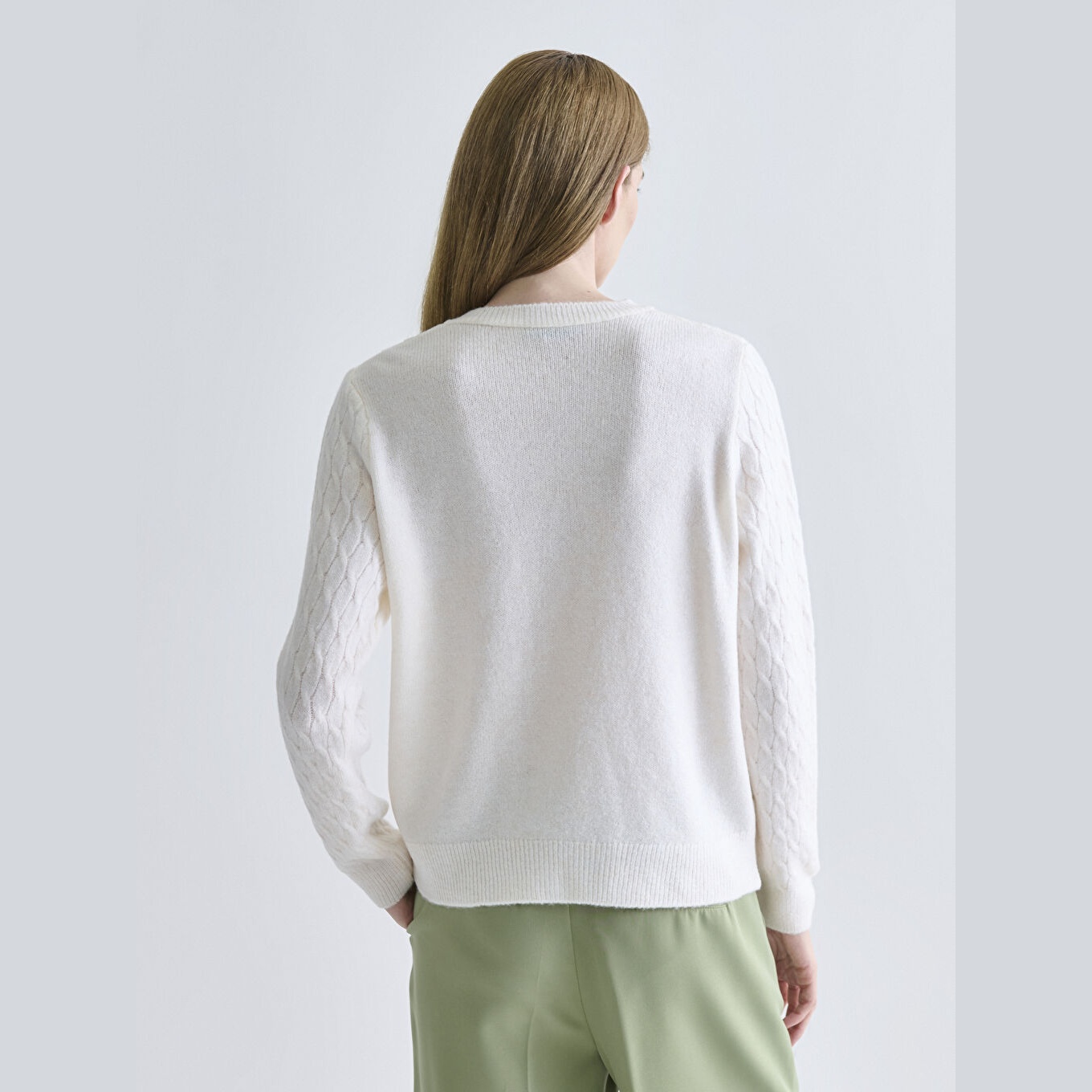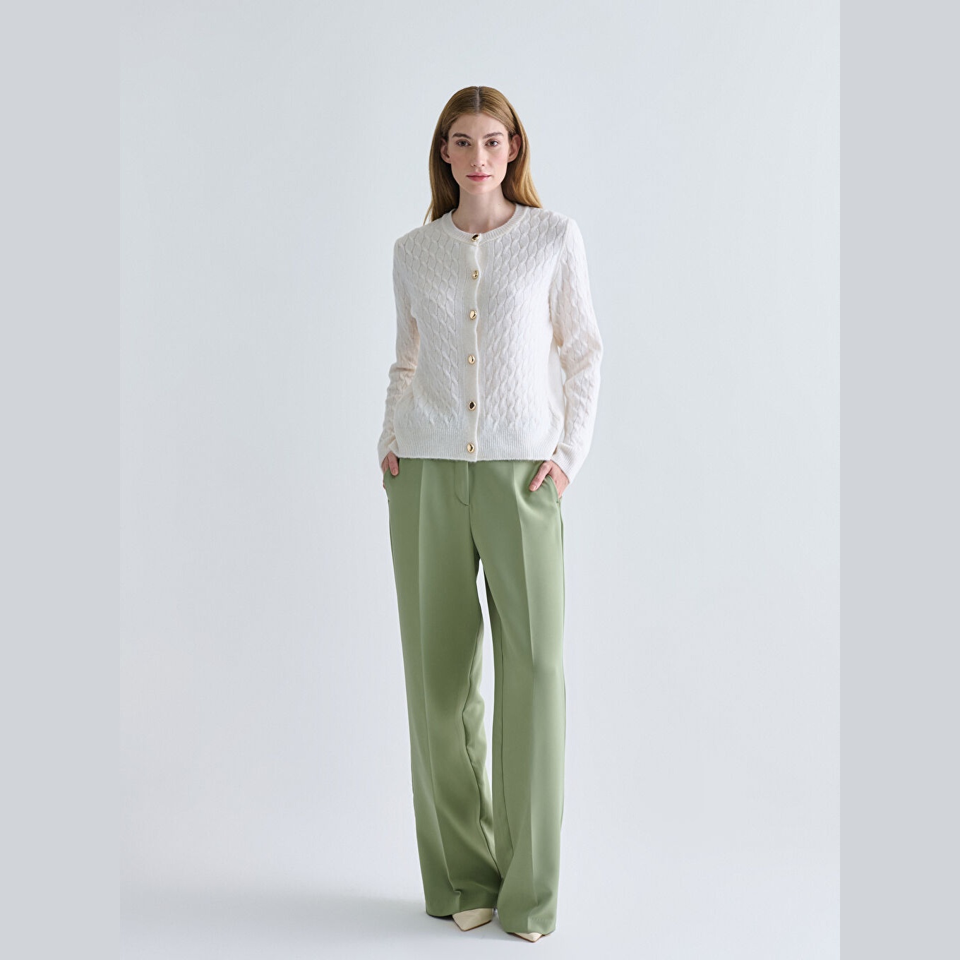 كارديغان نسائي بياقة دائرية بنقشة ذاتية من LCW Classic – إكرو (قصة قياسية، خامة تريكو متوسطة السماكة، تصميم بنقشة ناعمة، أزرار أمامية)
