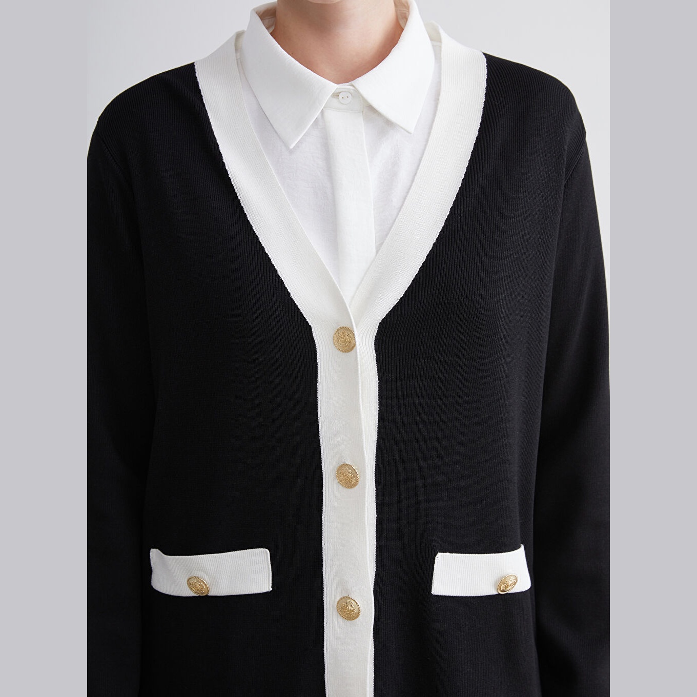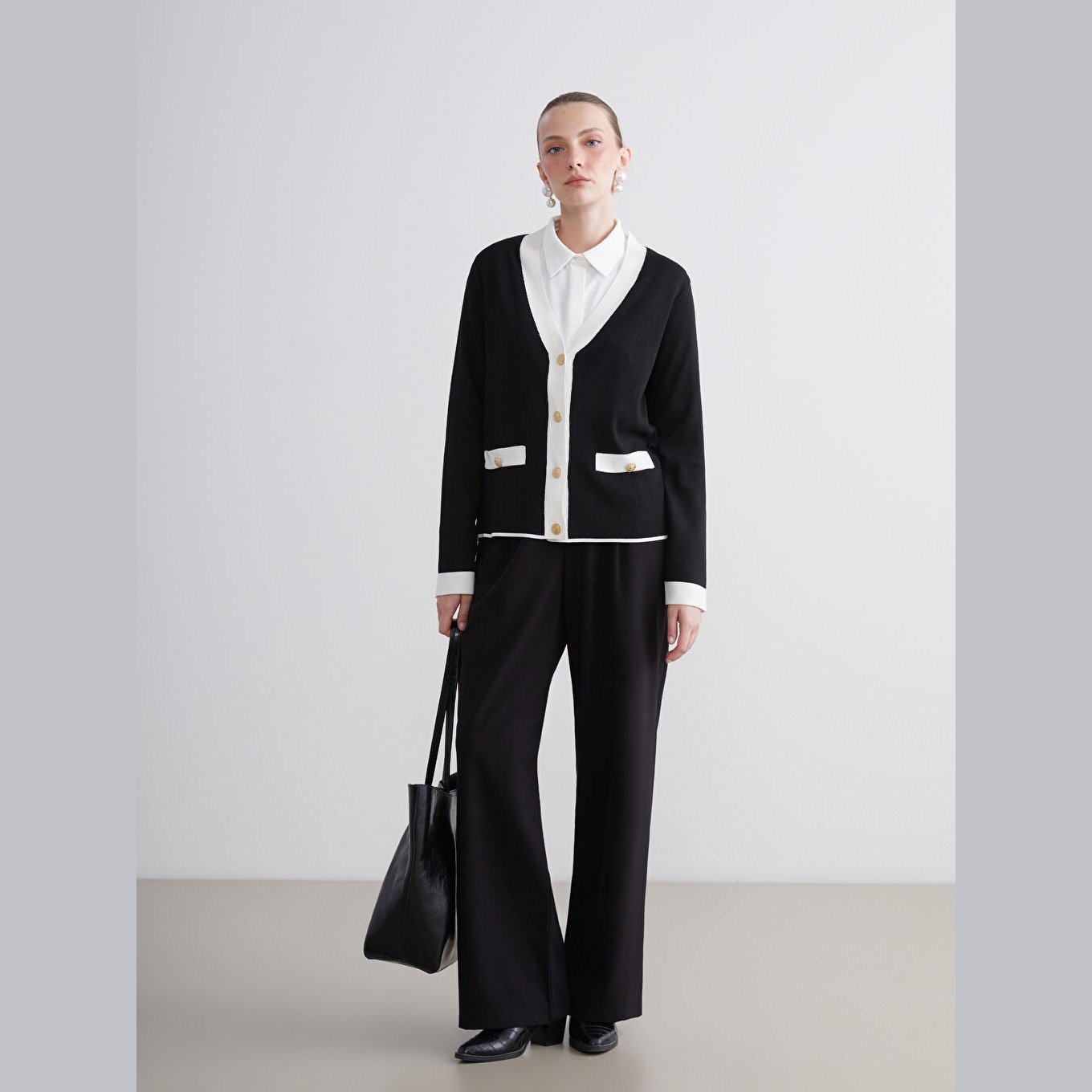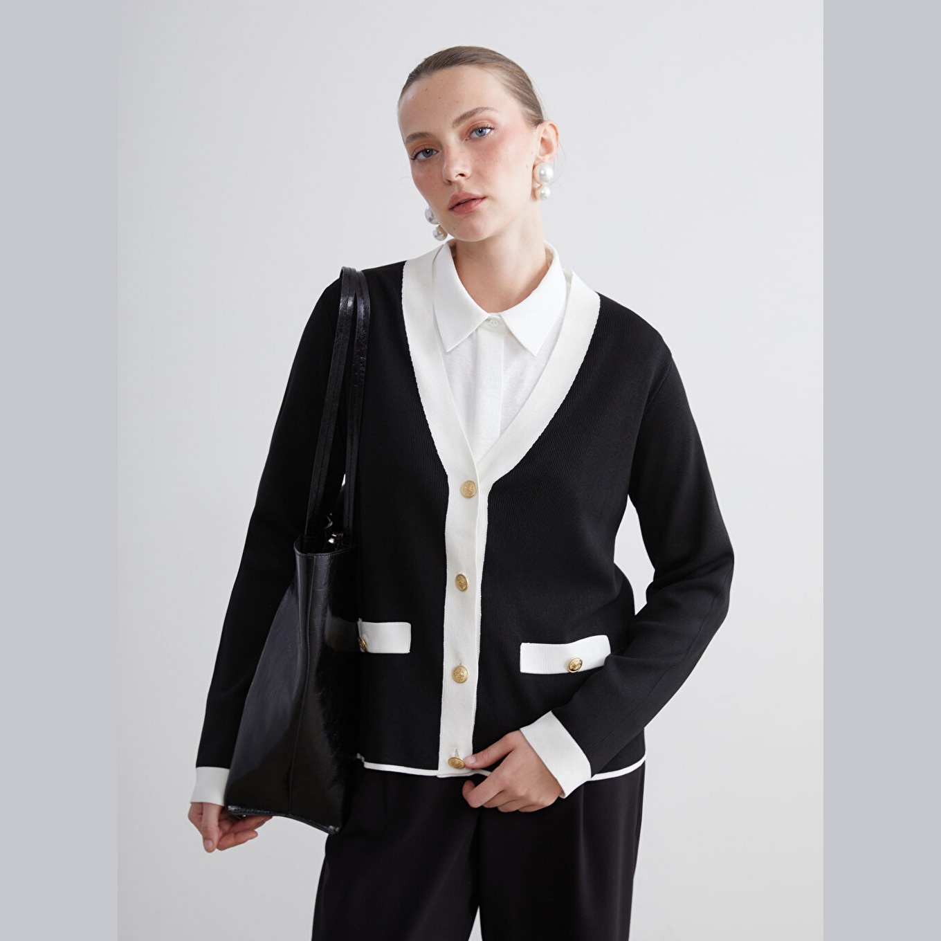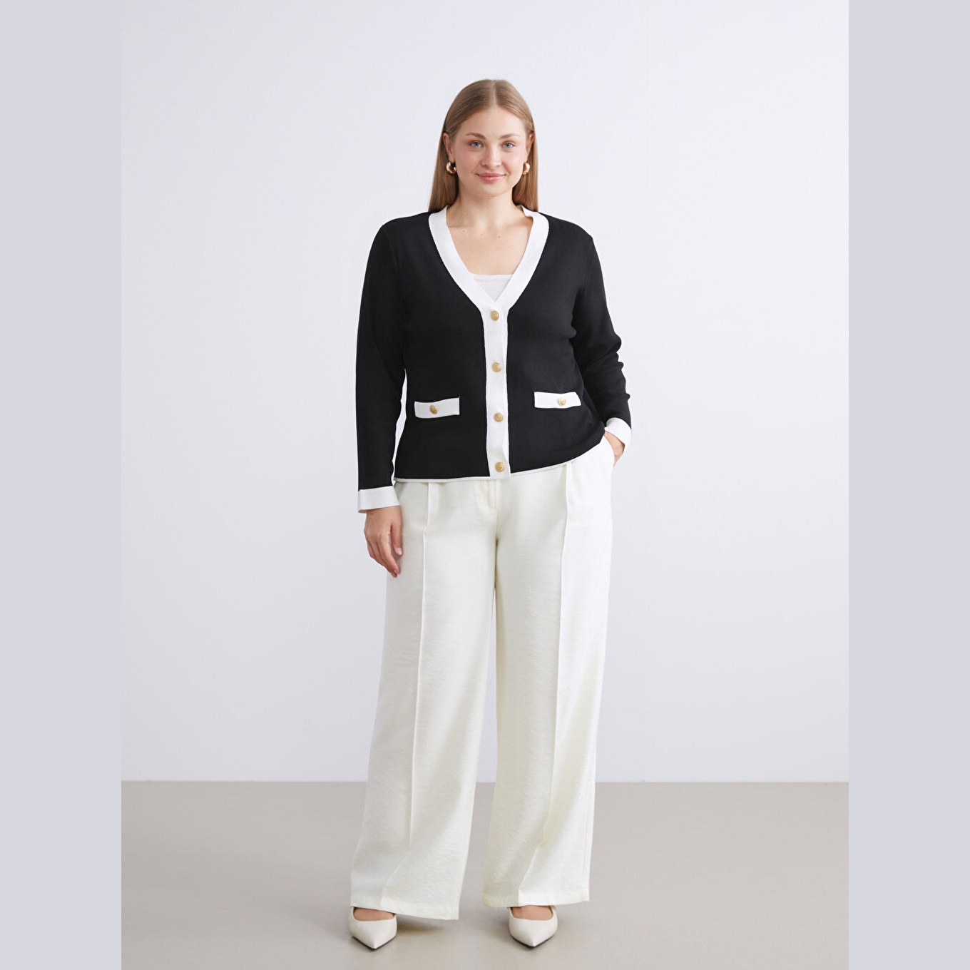 كارديغان عملي من مجموعة LCW Classic بلون أسود حيادي، مصمم بياقة V (V Yaka) تضيف لمسة أنثوية كلاسيكية، أكمام طويلة، قصة Standart & Regular توفر راحة وأناقة متوازنة، تصميم سادة بدون نقوش، خامة Triko متوسطة السماكة بتركيبة من %72 فيسكوز، %28 بوليستر، مزود بأزرار أمامية للإغلاق، بطول يُقاس من الكتف، مثالي للتنسيق مع بناطيل قماش أو تنانير لإطلالة خريفية أو مكتبية أنيقة ومحتشمة، ضمن مجموعة Büyük Beden التي توفر خيارات أنيقة ومريحة للمقاسات الكبيرة.
