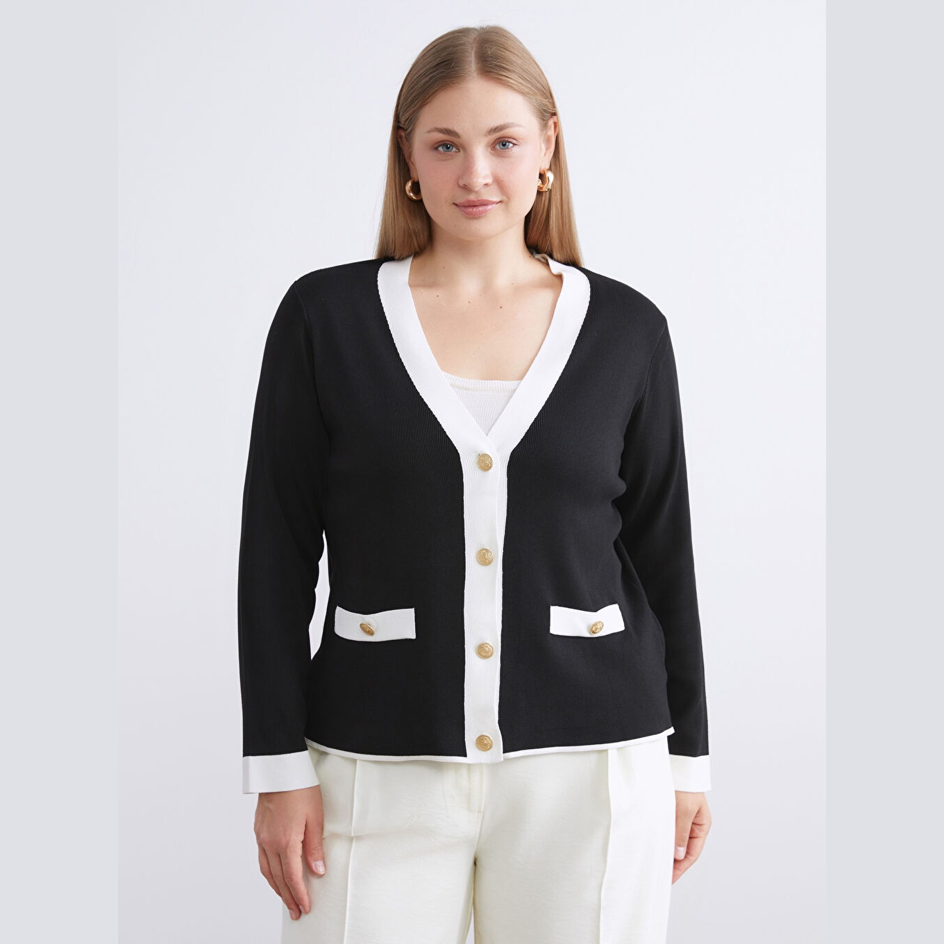 كارديغان نسائي بياقة V من LCW Classic – أسود (قصة قياسية، خامة تريكو متوسطة السماكة، تصميم سادة، أزرار أمامية، ضمن مجموعة المقاسات الكبيرة)