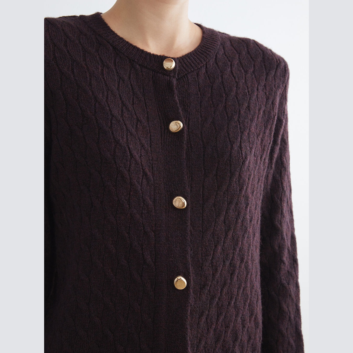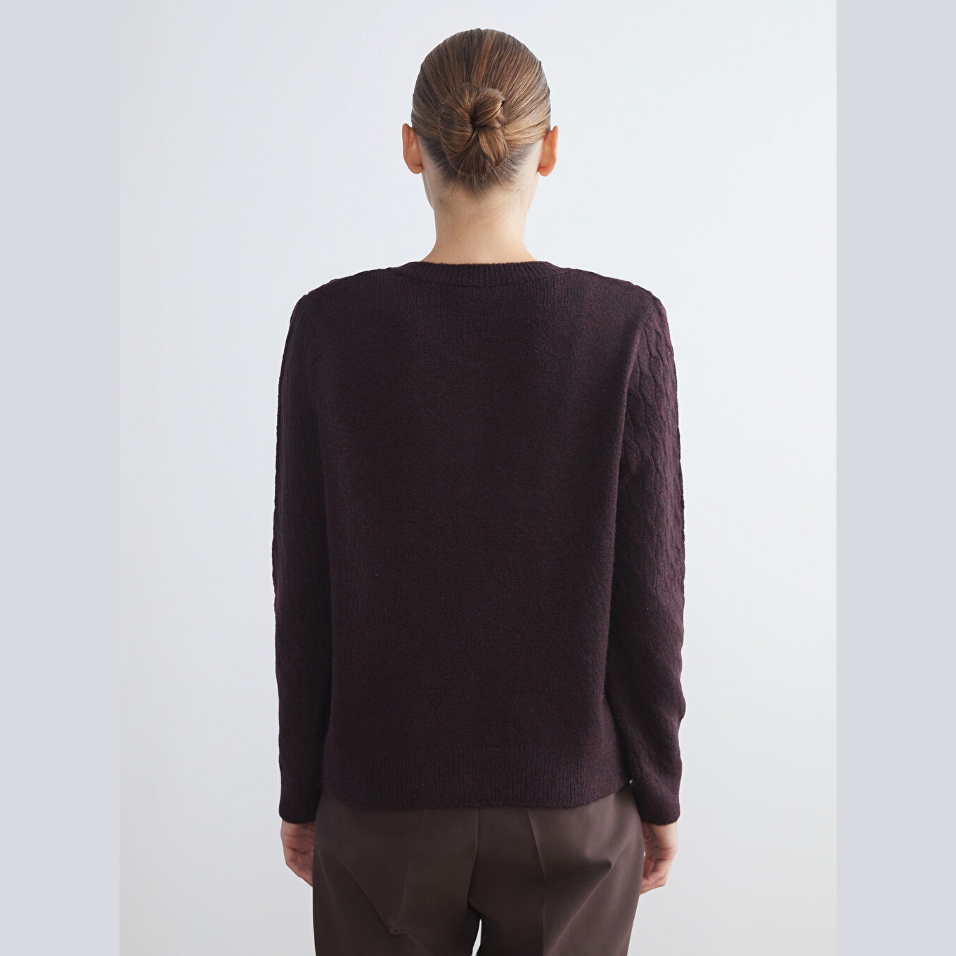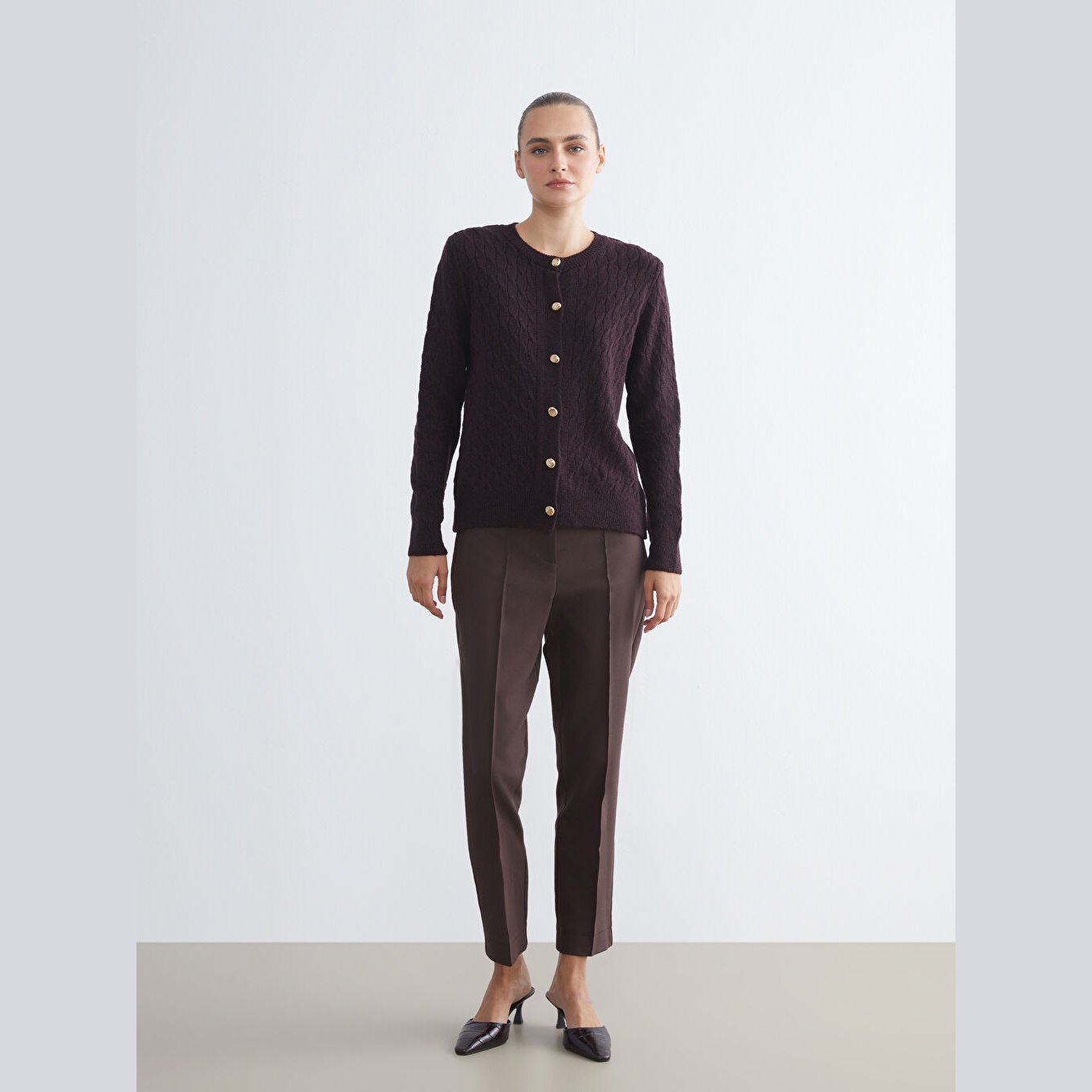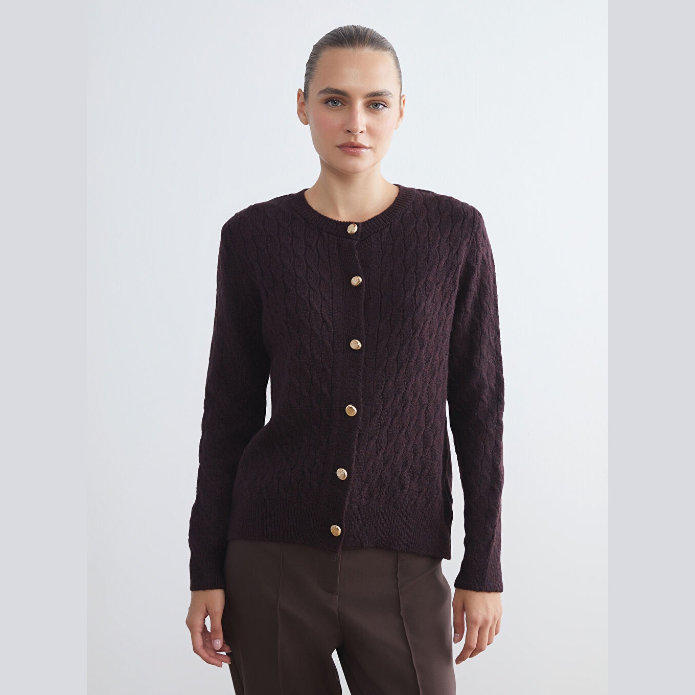 كارديغان نسائي بياقة دائرية بنقشة ذاتية من LCW Classic – بوردو (قصة قياسية، خامة تريكو متوسطة السماكة، تصميم بنقشة ناعمة، أزرار أمامية)