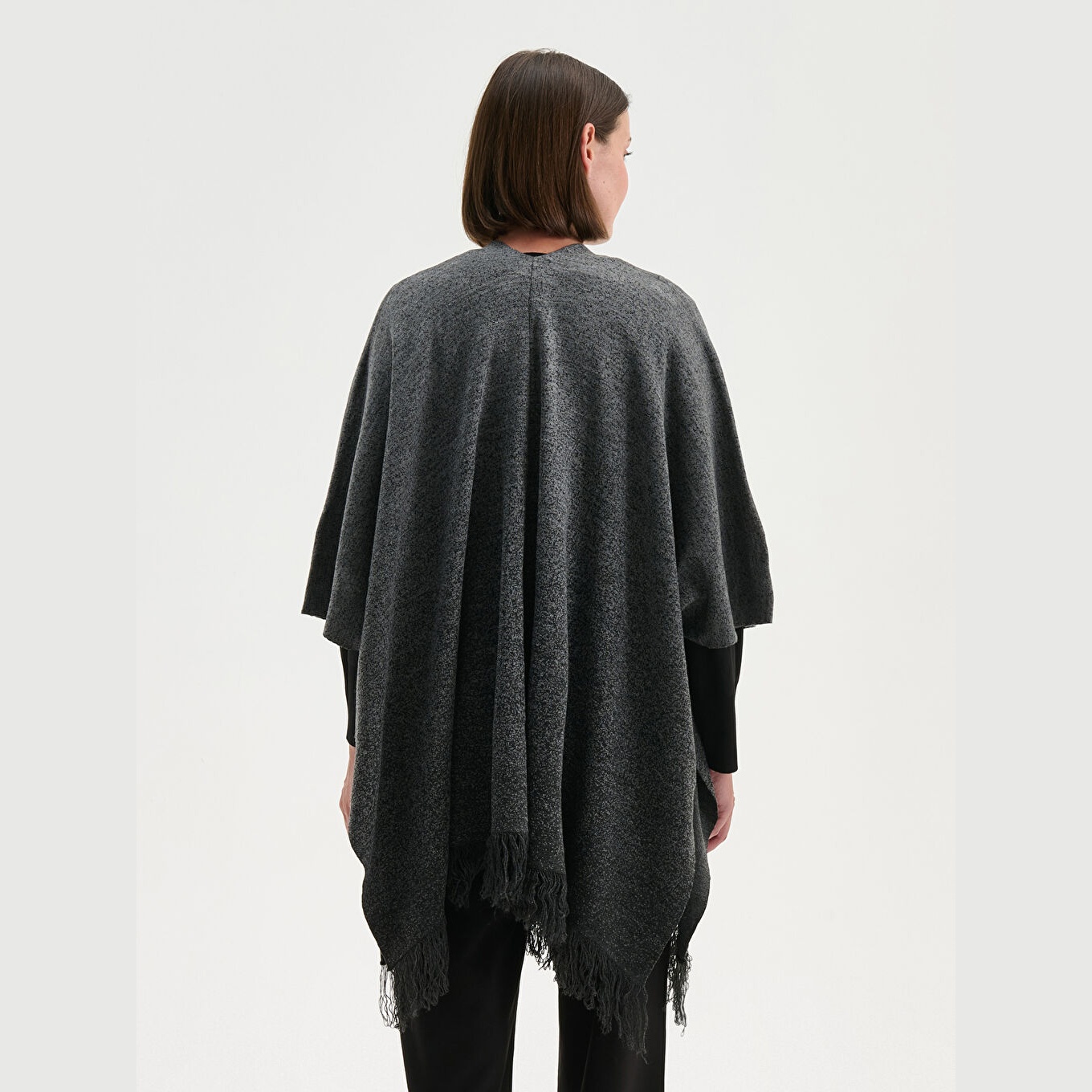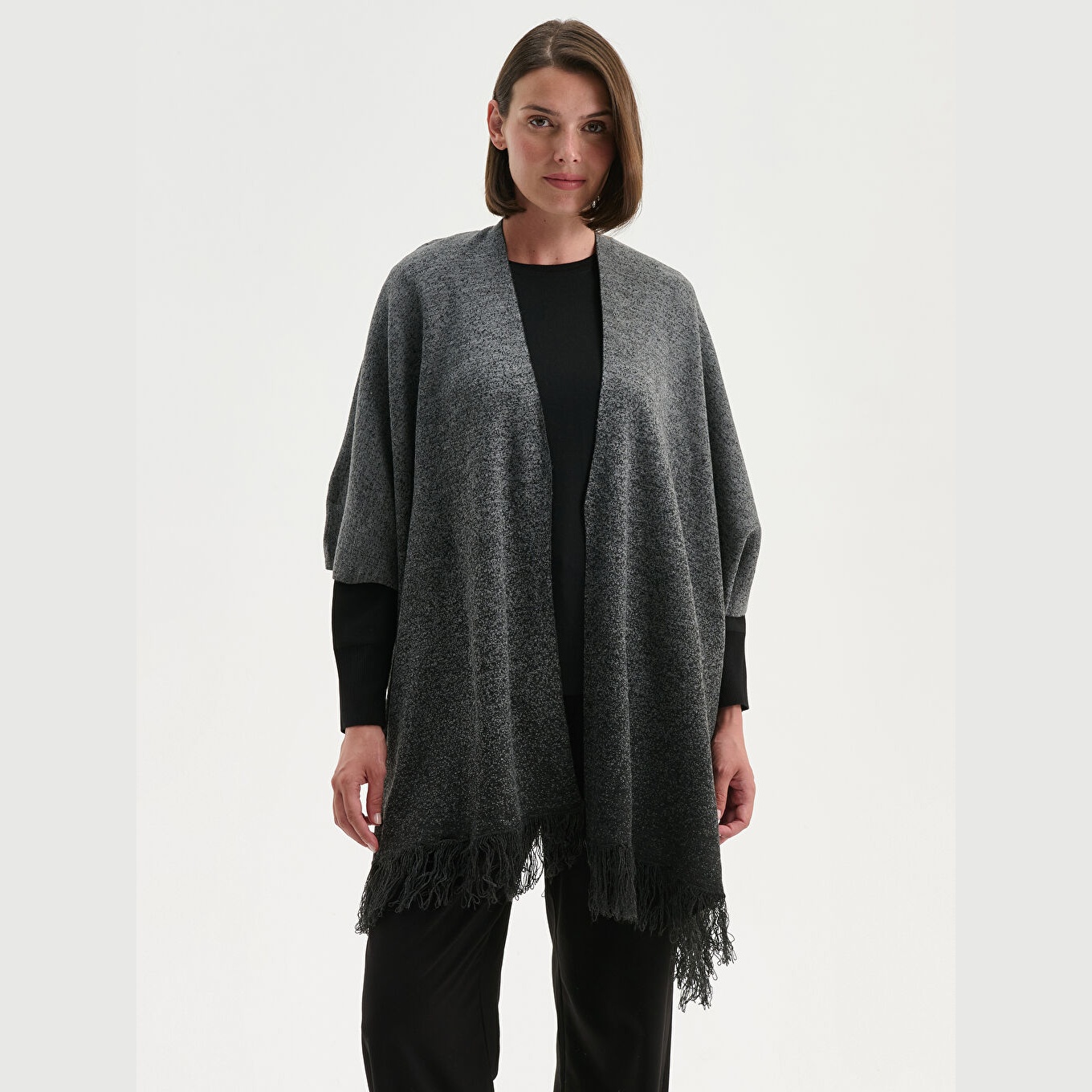 بونشو نسائي بياقة شال من LCW Grace – رمادي (قصة قياسية، خامة تريكو متوسطة السماكة، تصميم سادة، ياقة شال، طول ميدي، أكمام ثلاثية الطول)