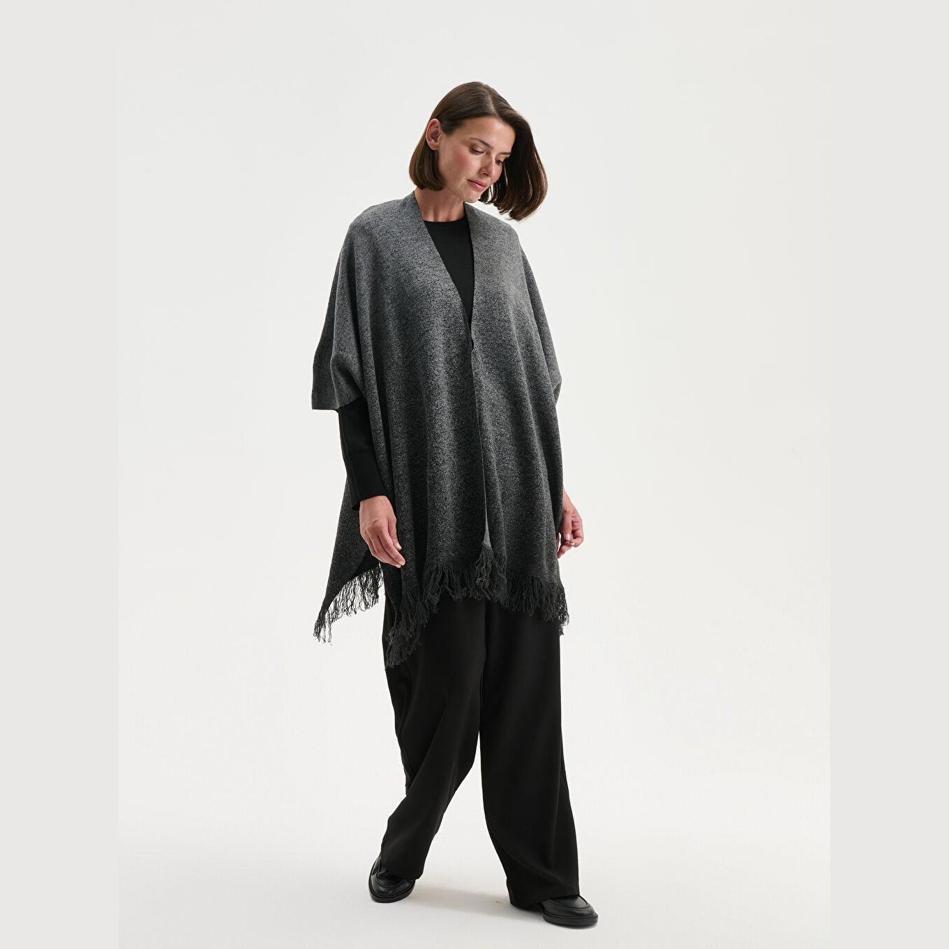 بونشو أنيق من مجموعة LCW Grace بلون رمادي حيادي، مصمم بياقة شال (Şal Yaka) تضيف لمسة دافئة وانسيابية، قصة Standart & Regular توفر تغطية مريحة وأناقة محتشمة، تصميم سادة بدون نقوش، خامة Triko متوسطة السماكة بتركيبة من %100 أكريليك، أكمام Truvakar بطول ثلاثي أنيق، طول Midi عملي، بدون أزرار أو سحاب، يُرتدى كطبقة خارجية فوق البلوزات أو القمصان، مثالي لأجواء الخريف والشتاء المعتدل، ويمنحك إطلالة محتشمة وعصرية في آنٍ واحد.