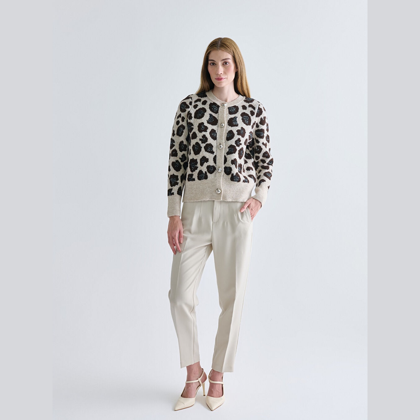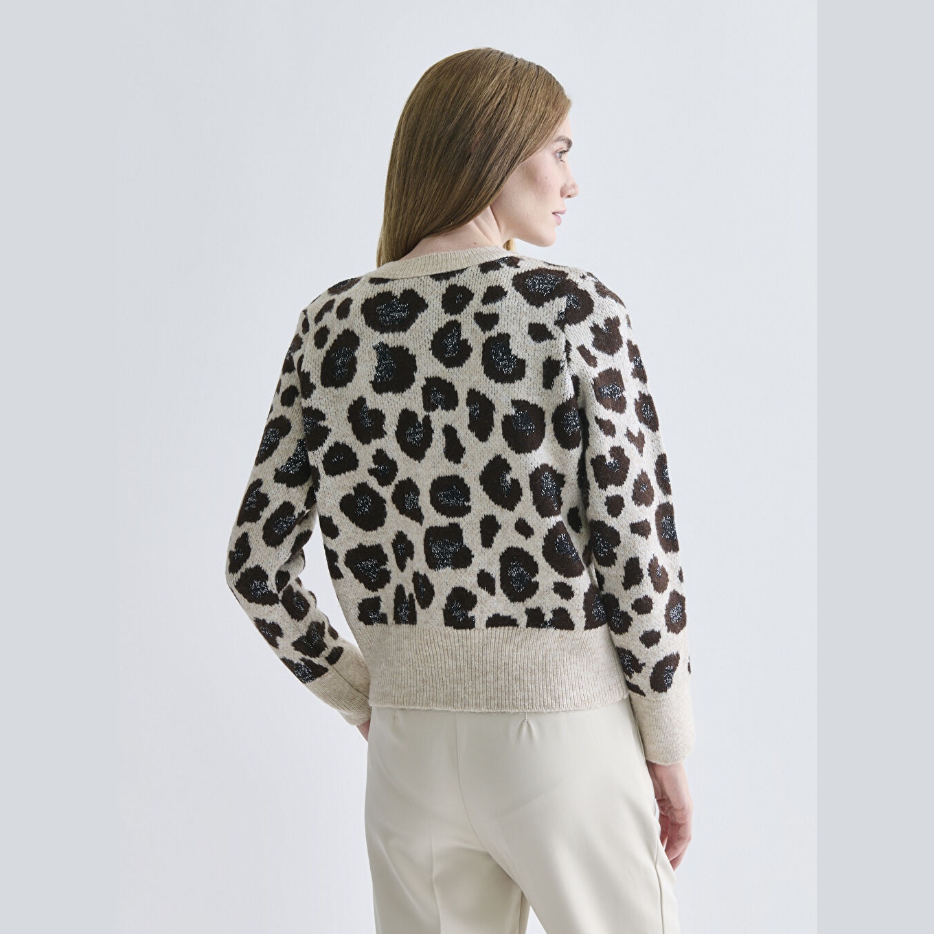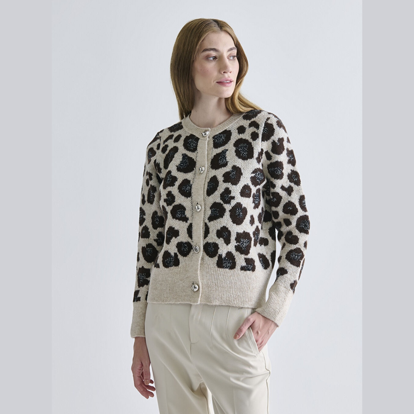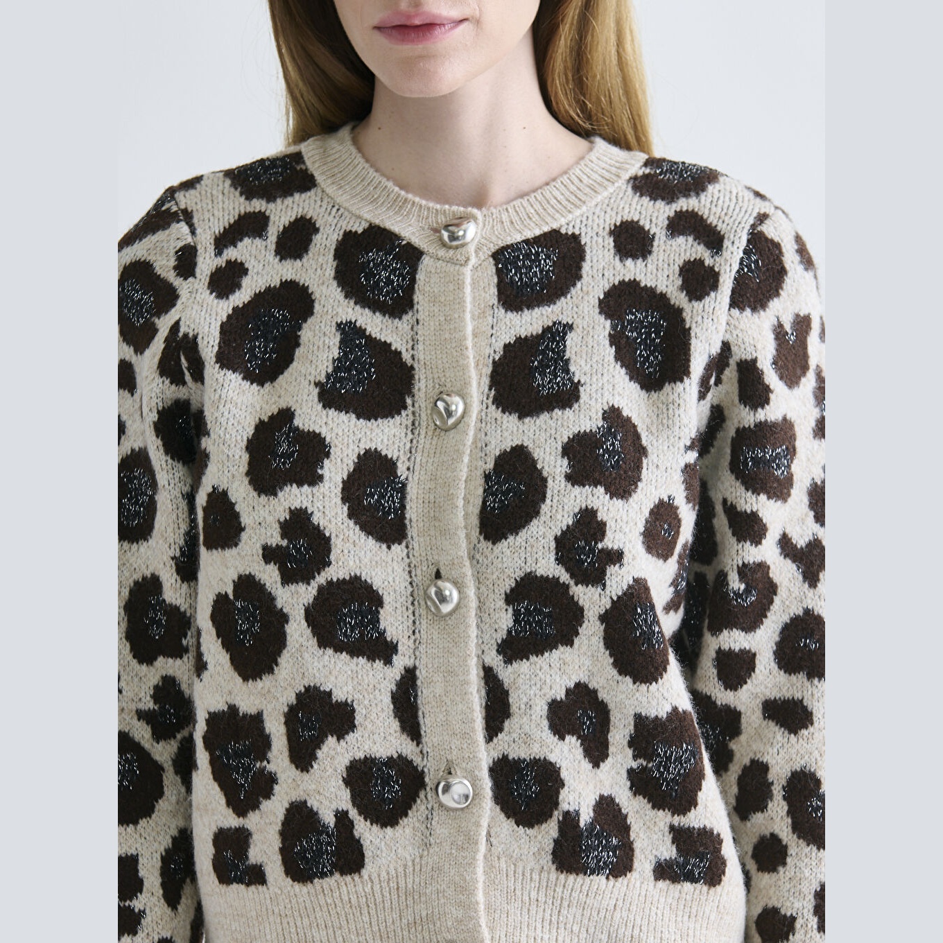 كارديغان نسائي بياقة دائرية بنقشة من LCW Classic – بني (قصة ضيقة، خامة تريكو متوسطة السماكة، تصميم مزخرف بخيوط لامعة، أزرار أمامية)