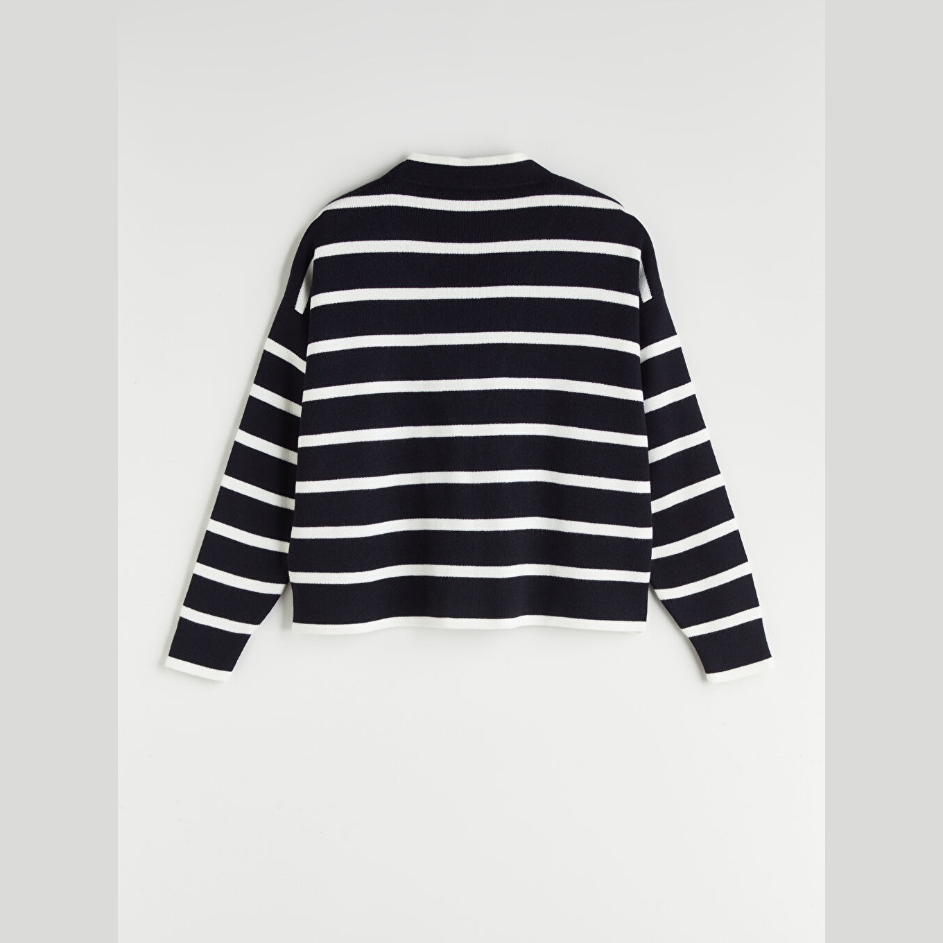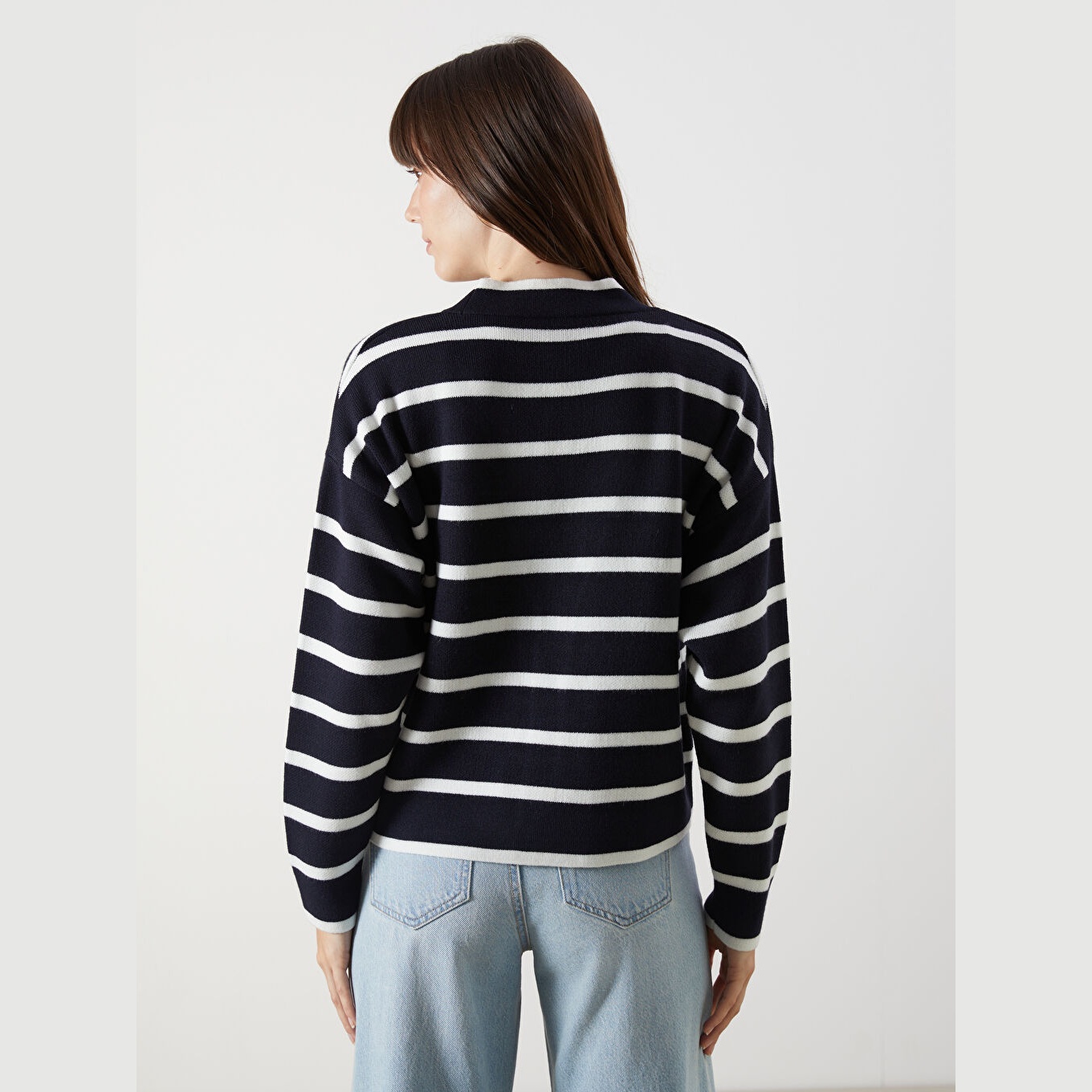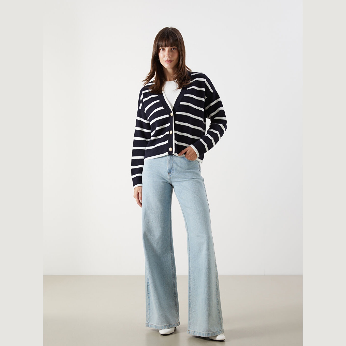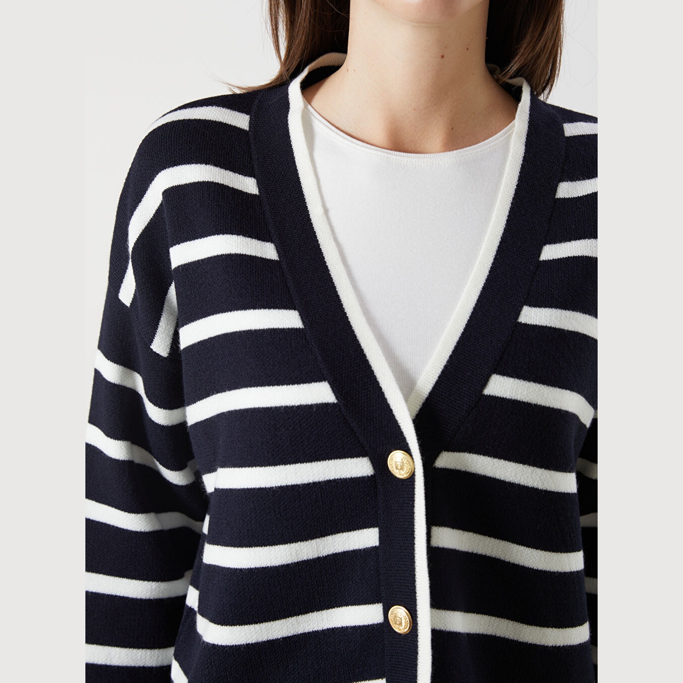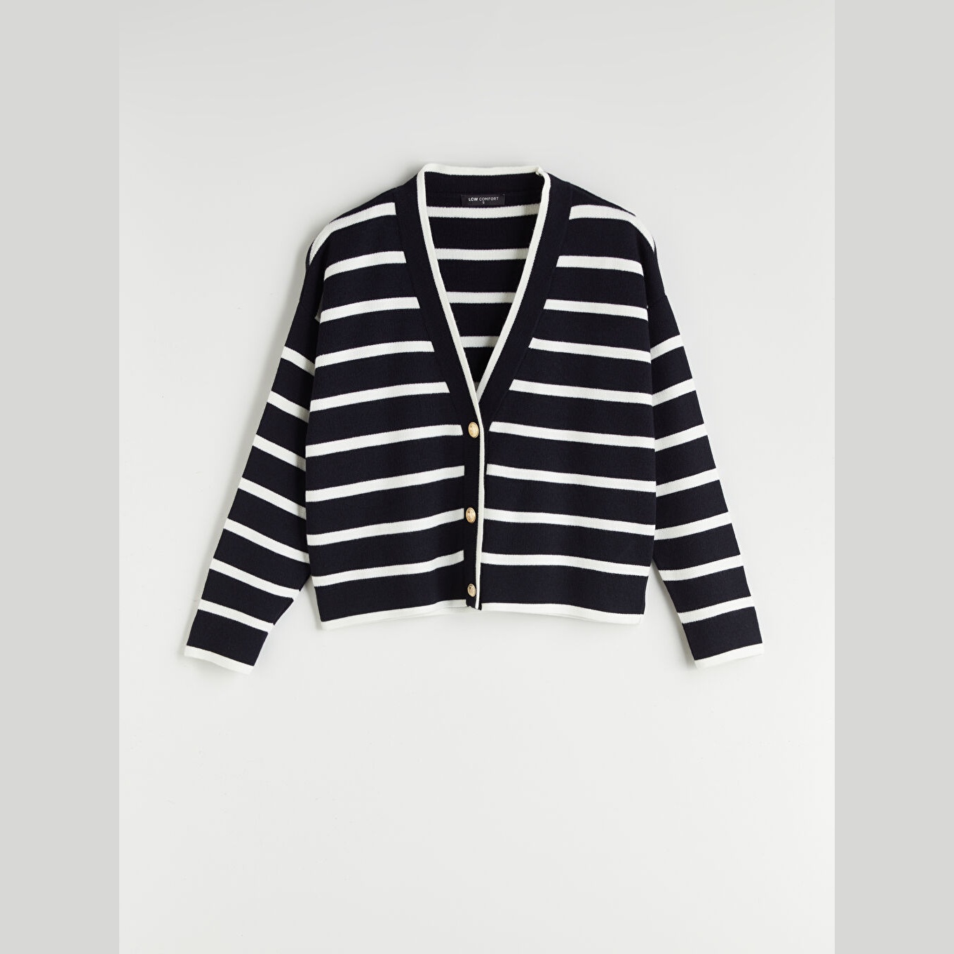كارديغان نسائي بياقة V مخطط من LCW Comfort – كحلي (قصة Oversize، خامة تريكو متوسطة السماكة، تصميم مخطط، أزرار أمامية، مناسب لفترة الحمل وما بعدها)