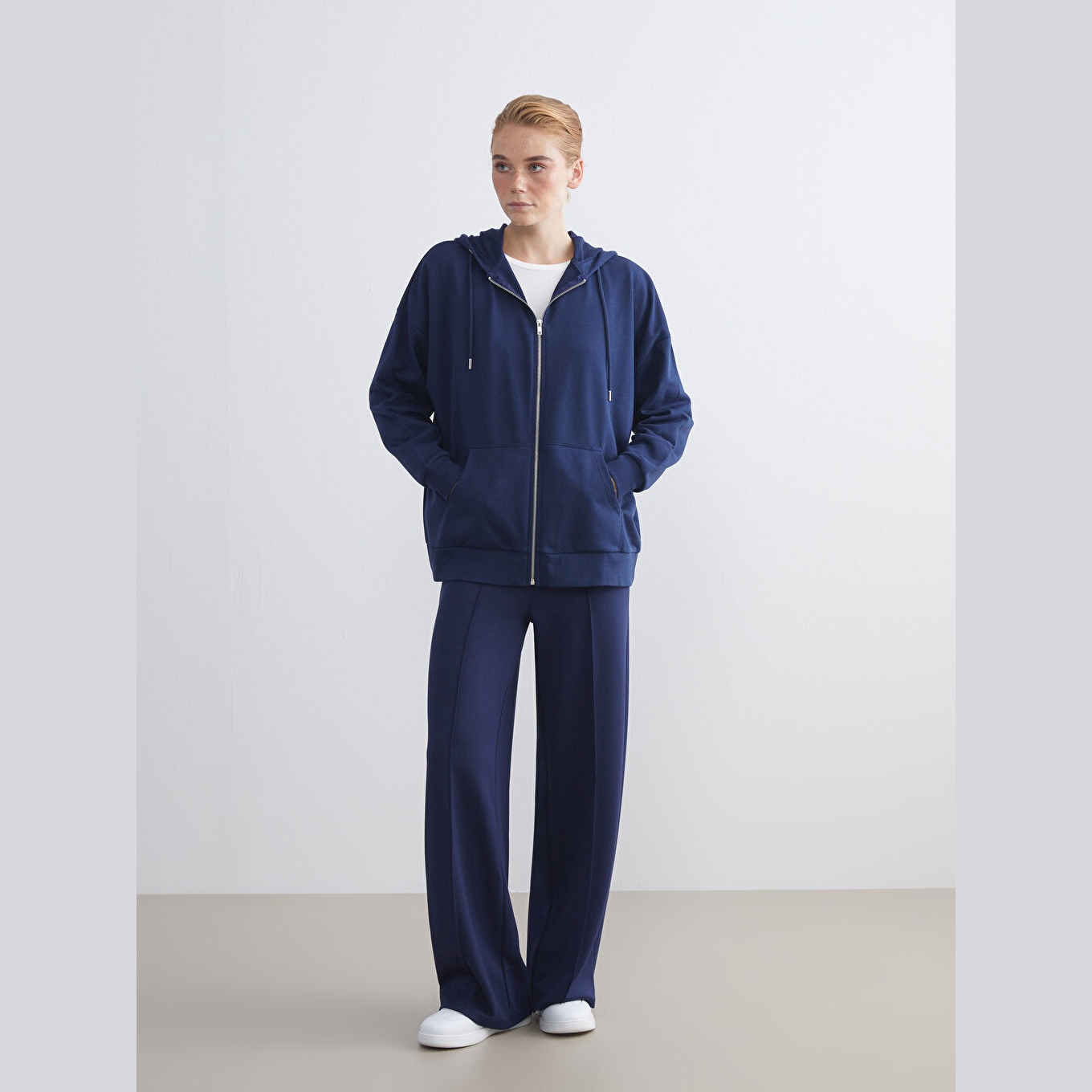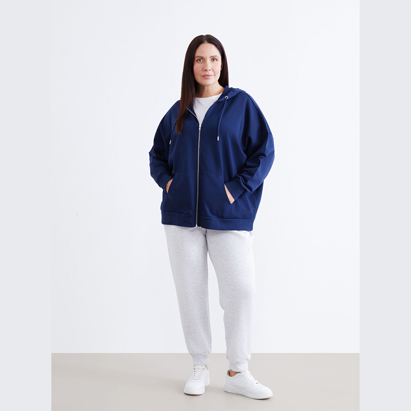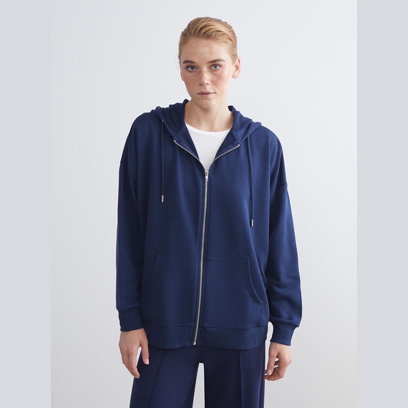 سويت شيرت نسائي بغطاء رأس وقصة واسعة من LCW Modest – كحلي (قصة Oversize، خامة متوسطة السماكة، تصميم سادة، فتحة سحاب أمامية، ضمن مجموعة العودة إلى الجامعة)