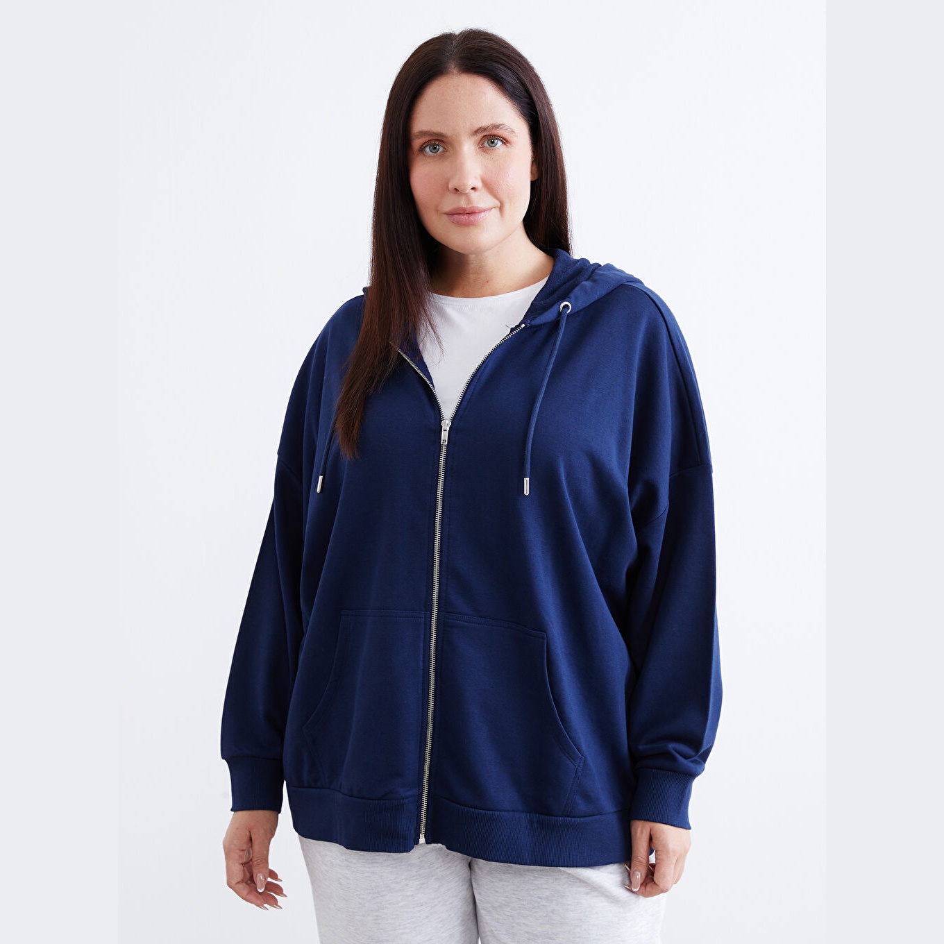 سويت شيرت عملي من مجموعة LCW Modest بلون كحلي أنيق، مصمم بياقة Kapüşonlu بغطاء رأس تضيف دفئًا وأناقة كاجوال، أكمام طويلة، قصة Oversize واسعة تمنحك راحة كاملة ومظهرًا عصريًا، تصميم سادة بدون نقوش، خامة 3 İplik متوسطة السماكة بتركيبة من %66 قطن، %34 بوليستر، مزود بفتحة سحاب أمامية للإغلاق، بطول يُقاس من الكتف، مثالي للتنسيق مع بناطيل جينز أو ليغينغ لإطلالة يومية دافئة ومحتشمة، ضمن مجموعة Kampüse Dönüş المصممة لأجواء الجامعة.