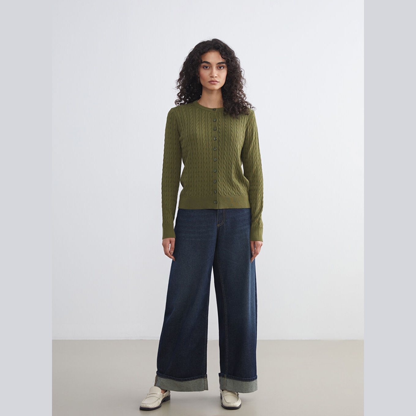 كارديغان أنيق من مجموعة LCW Modest بلون زيتي حيادي، مصمم بياقة دائرية (Bisiklet Yaka) تمنحك مظهرًا ناعمًا وكلاسيكيًا، أكمام طويلة، قصة Standart & Regular توفر راحة وأناقة متوازنة، تصميم Desenli بنقشة مدمجة تضيف عمقًا وأناقة دون تعقيد، خامة Triko خفيفة بتركيبة من %73 فيسكوز، %27 بوليستر، مزود بأزرار أمامية للإغلاق، بطول يُقاس من الكتف، مثالي للتنسيق مع بناطيل قماش أو تنانير لإطلالة خريفية أو مكتبية أنيقة ومحتشمة، ضمن مجموعة Tesettür Giyim التي توازن بين الراحة والاحتشام.
