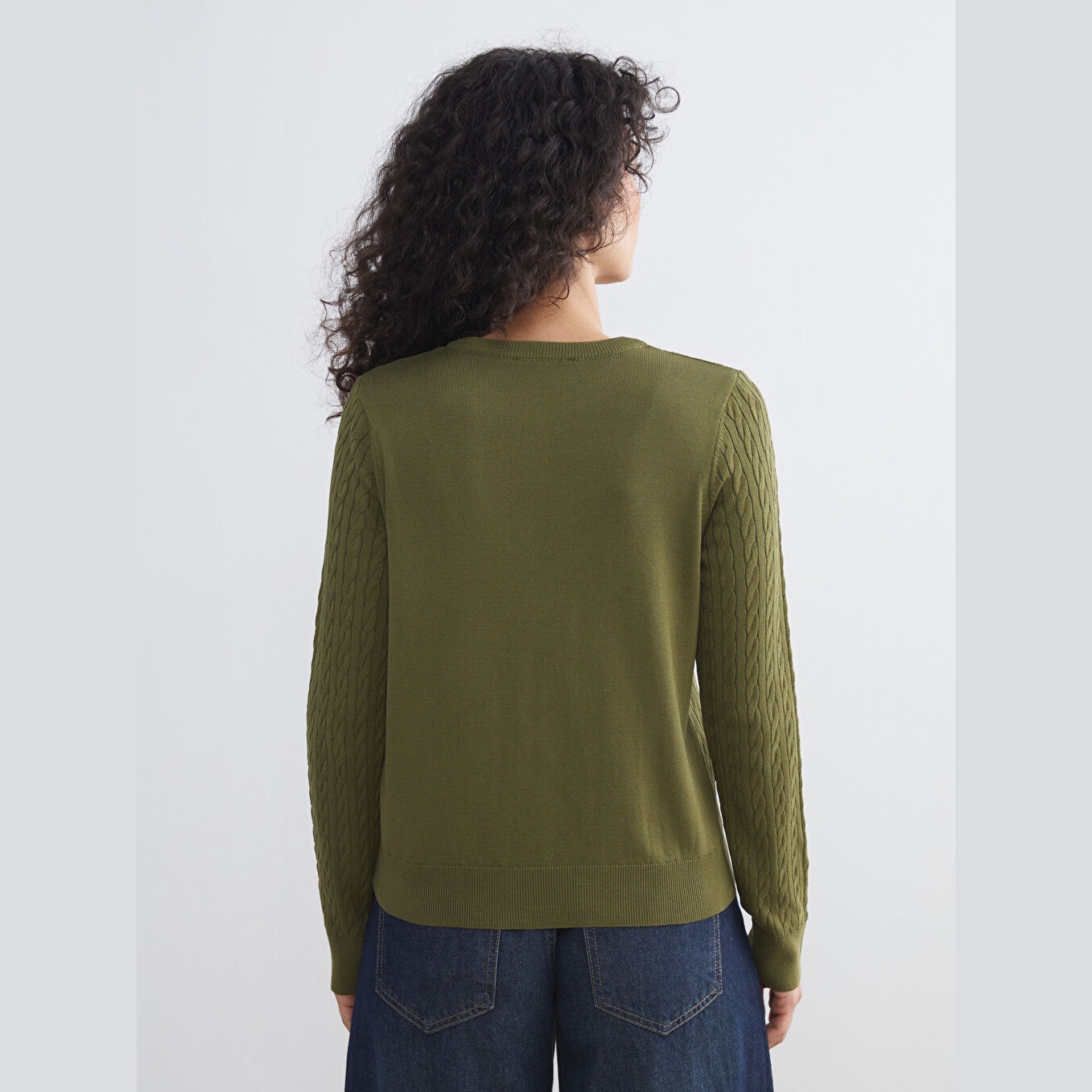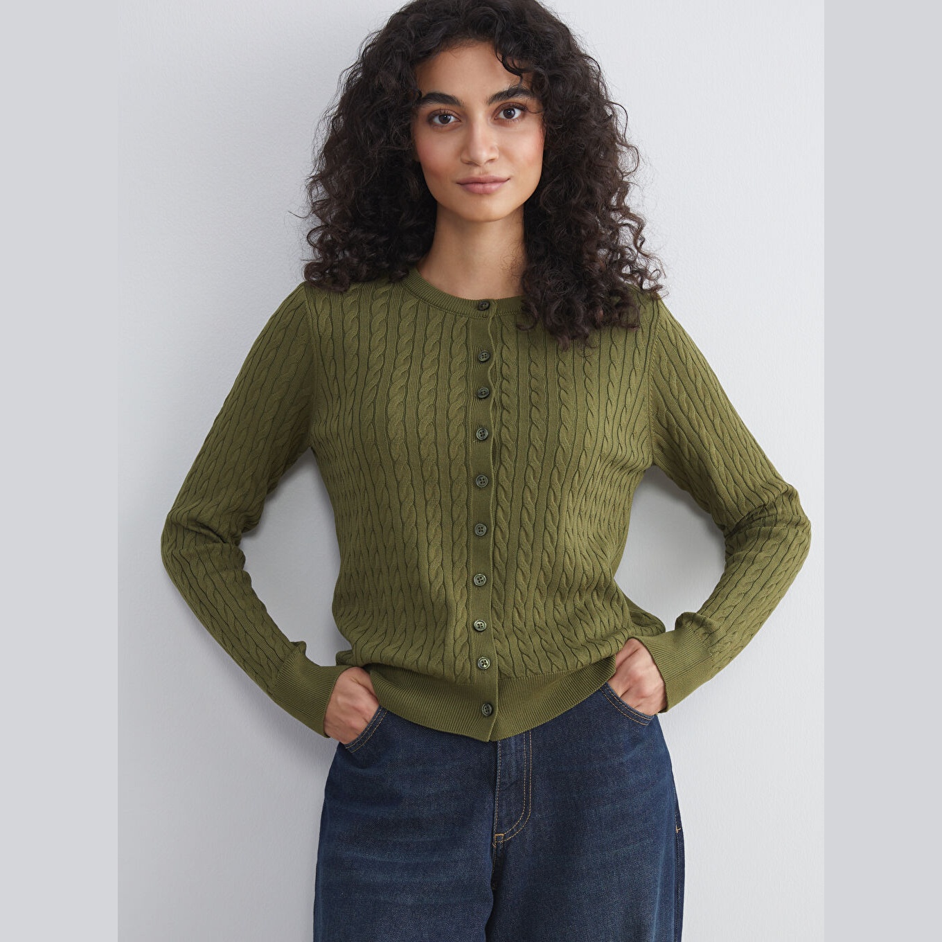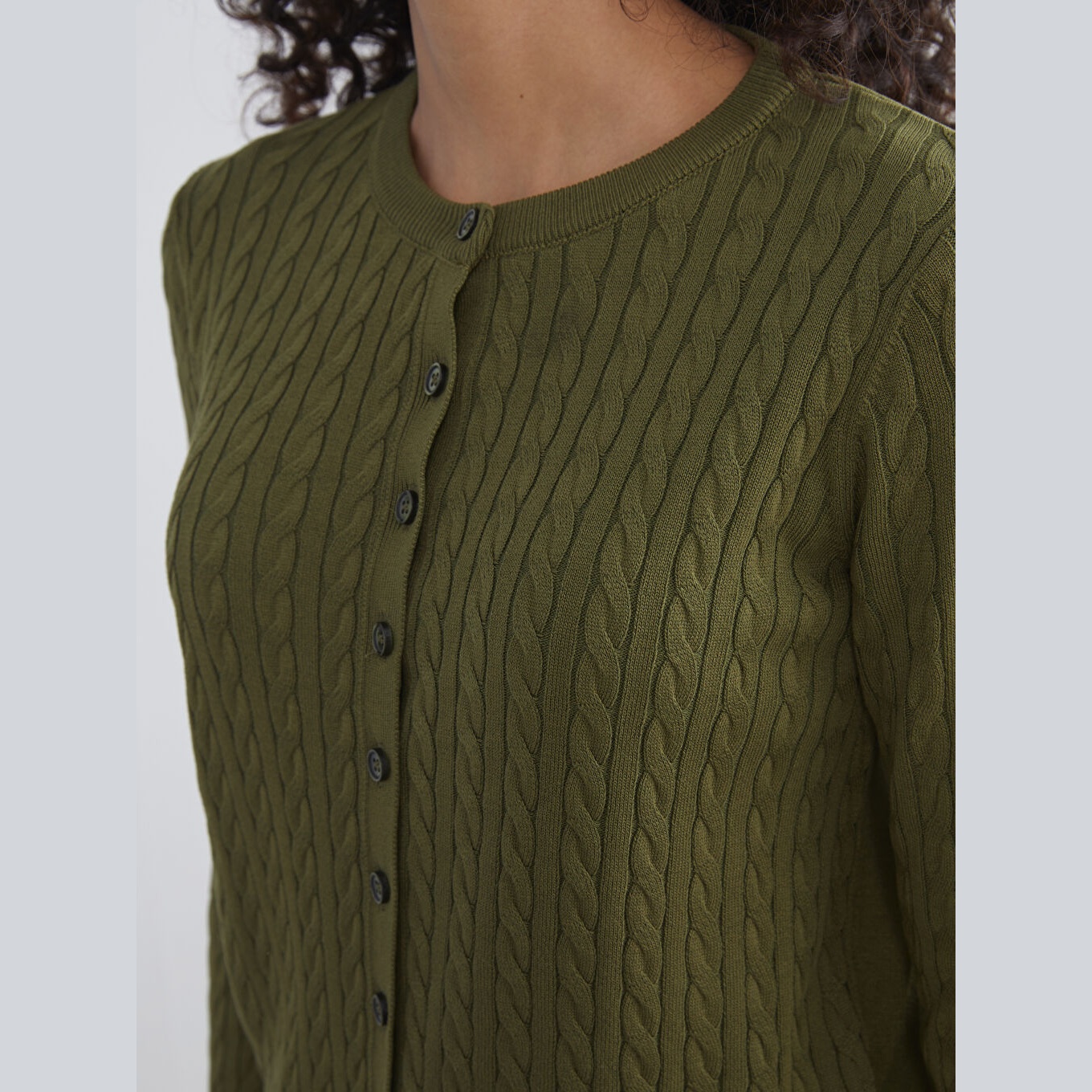 كارديغان نسائي بياقة دائرية بنقشة ذاتية من LCW Modest – زيتي (قصة قياسية، خامة تريكو خفيفة، تصميم مزخرف ذاتيًا، أزرار أمامية، ضمن مجموعة الملابس المحتشمة)