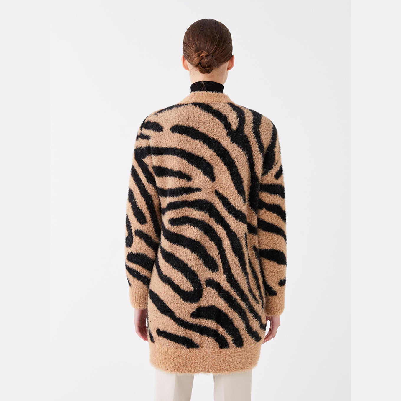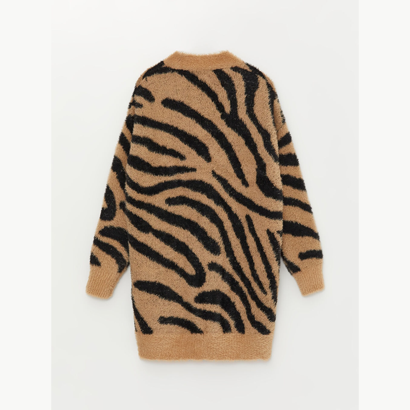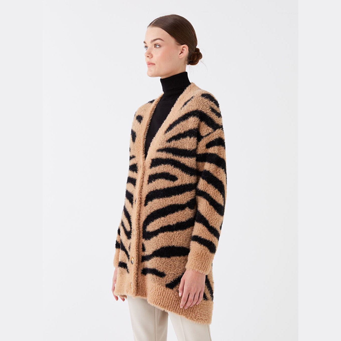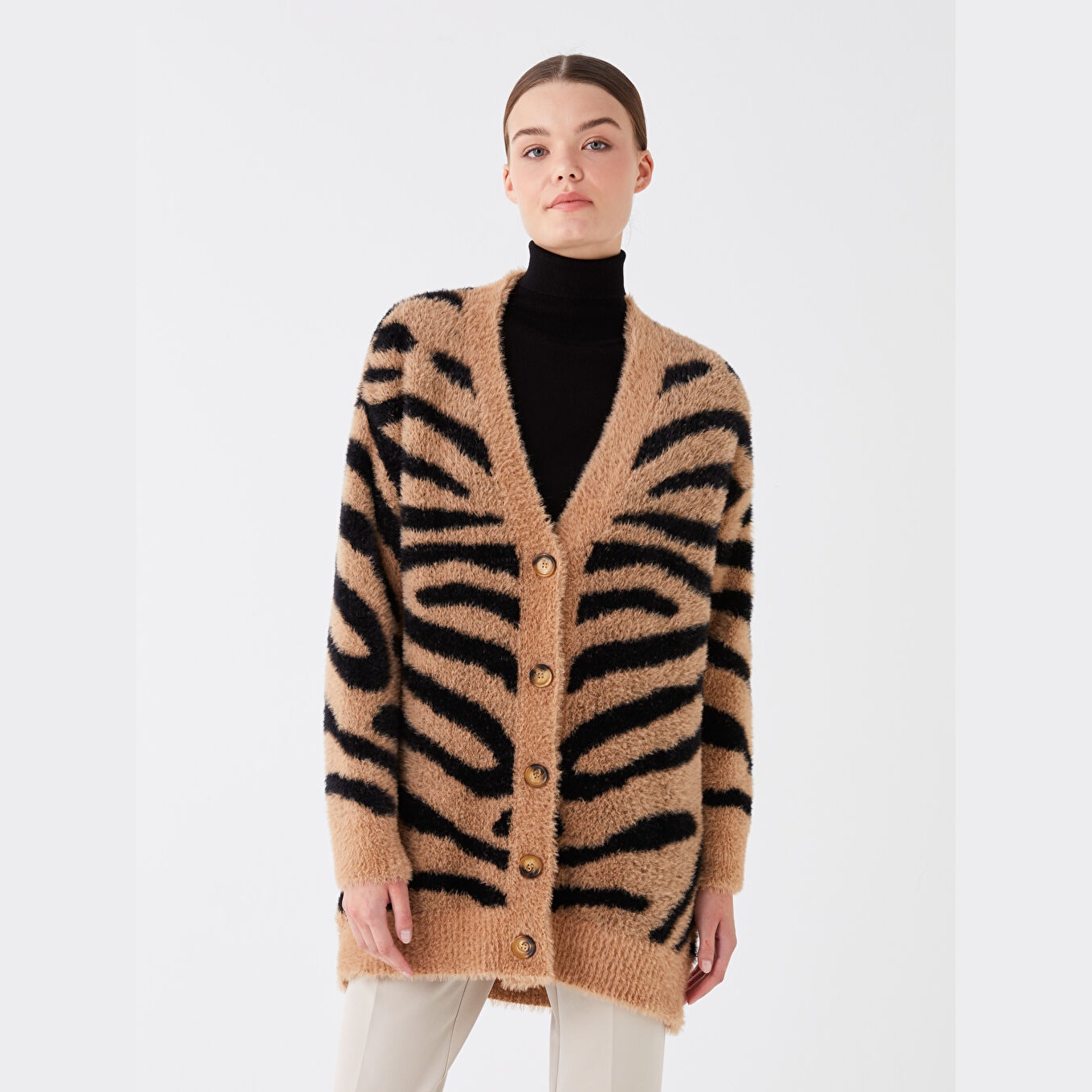 كارديغان نسائي بياقة V بنقشة من LCW Modest – أسود (قصة واسعة، خامة بيلوش سميكة، تصميم مزخرف، طول ميدي، ضمن مجموعة الملابس المحتشمة)