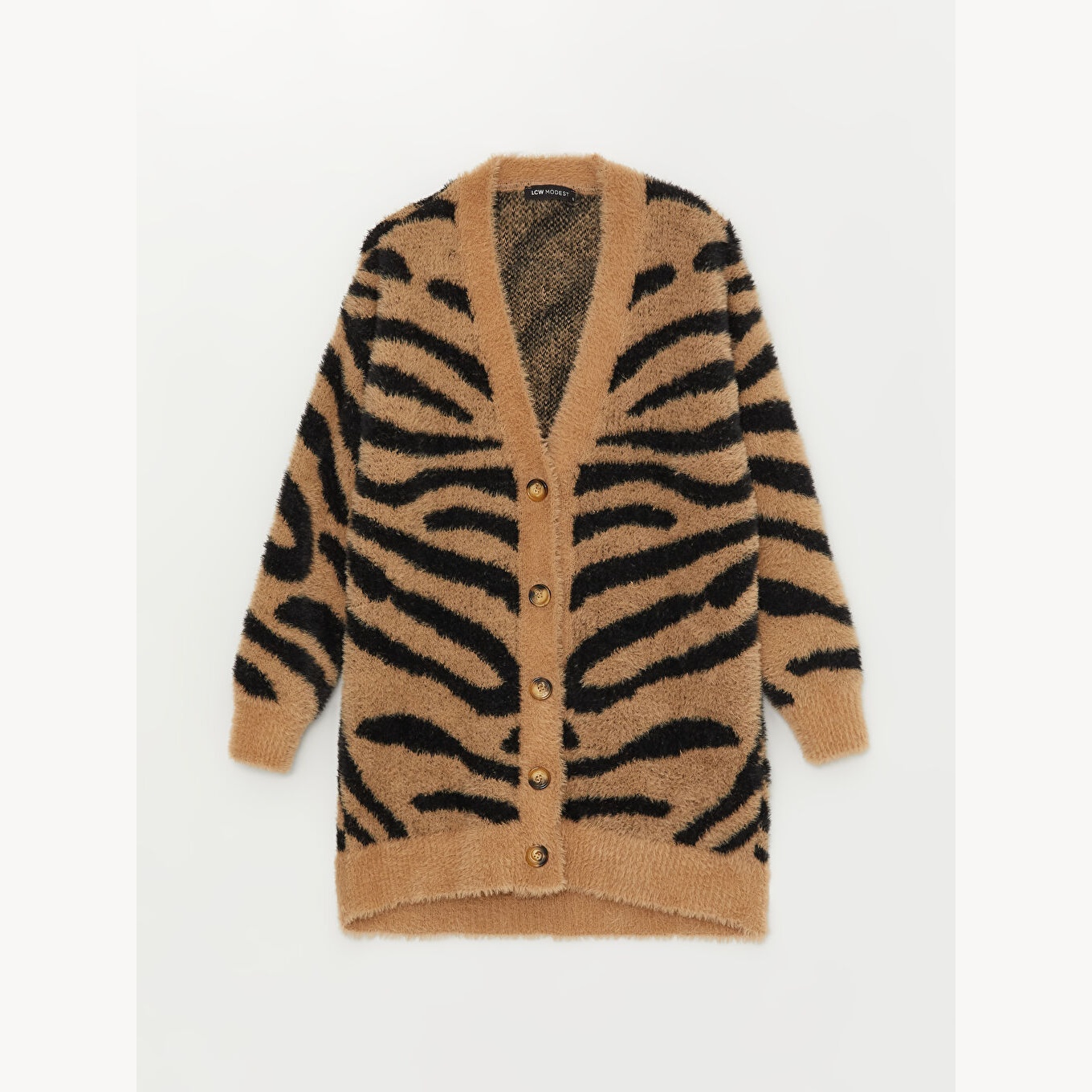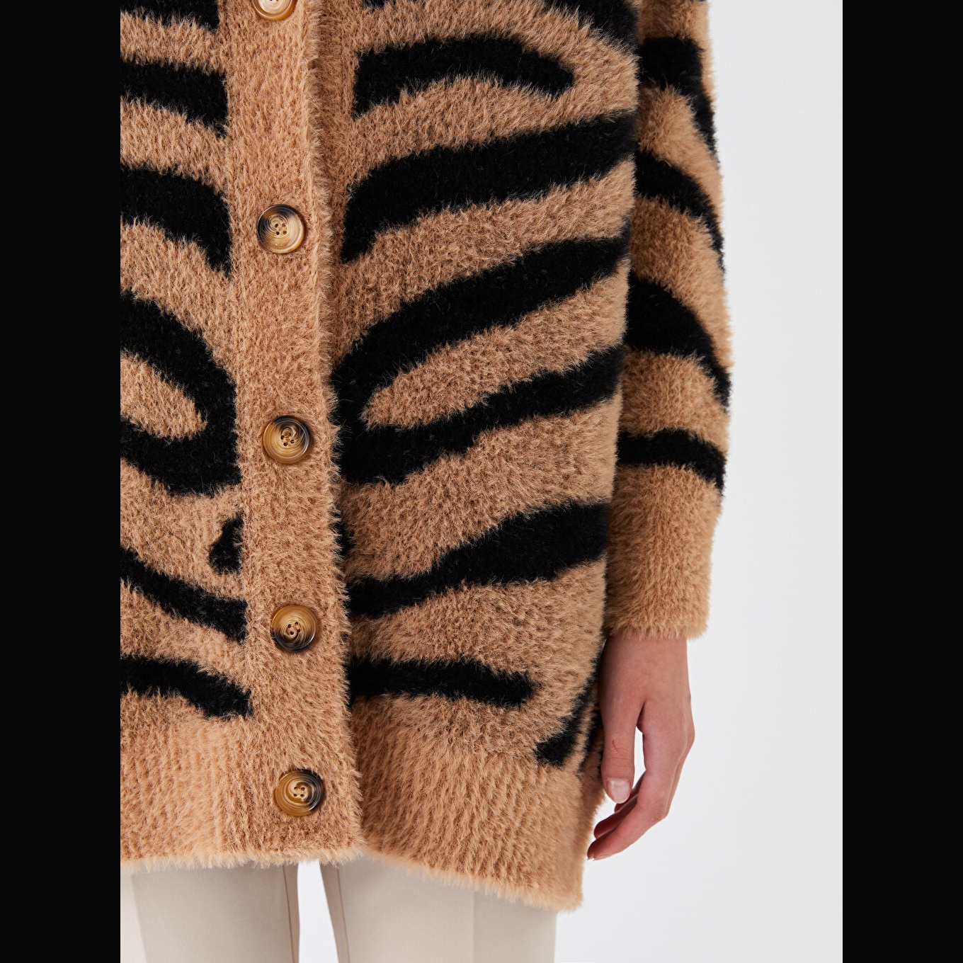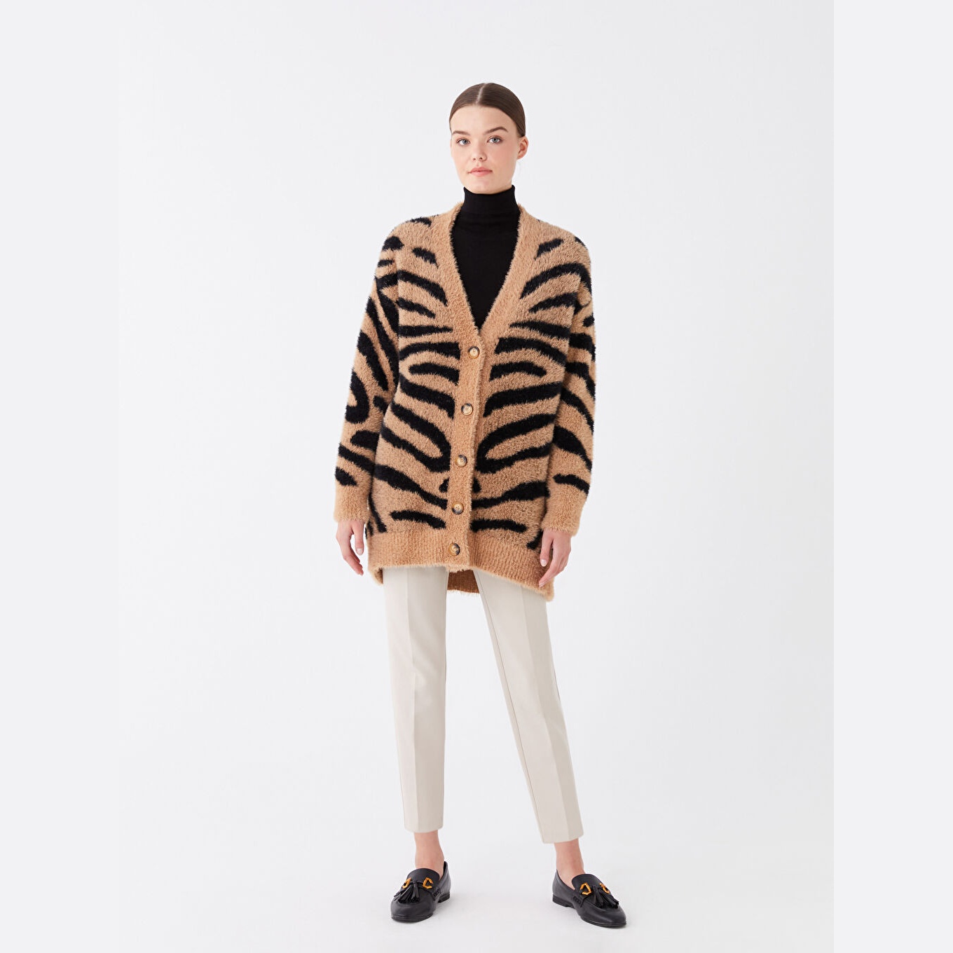 كارديغان شتوي فاخر من مجموعة LCW Modest بلون أسود أنيق، مصمم بياقة V تضيف لمسة أنثوية وانسيابية، أكمام طويلة، قصة Loose & Bol واسعة تمنحك راحة مثالية ومظهرًا محتشمًا، تصميم Desenli مزخرف بنقشة ناعمة تضيف عمقًا بصريًا، خامة Pelüş سميكة وناعمة الملمس بتركيبة من %100 بوليستر، بطول Midi متوسط يغطي الورك، مثالي لأيام الشتاء الباردة، يمكن تنسيقه مع بناطيل قماش أو جينز لإطلالة دافئة وأنيقة.